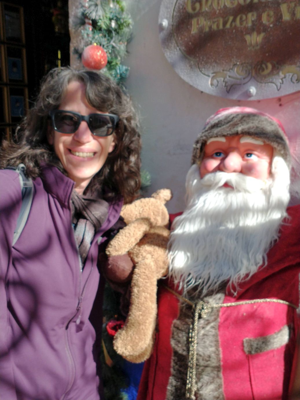 More wandering, more pretty scenes, a photo opp with Santa, a stop at a Ginja store for yet more shots and the purchase of a little bottle to bring home, then it is back to the parking lot where I can NOT resist buying masks! I mean, honestly, how could I? 1 euro, for 2 masks that will never be used and always be a keepsake and always be a reminder of one of our favorite villages and favorite visits of the trip!