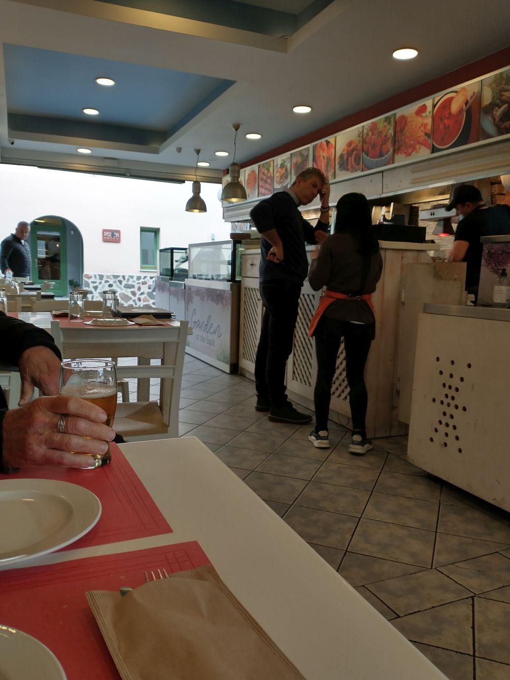 Back in Thera, now the search is on for lunch. One of the restaurants we had picked out is closed (permanently or seasonally, we don’t know, but it is locked up tight), so we continue on. We want to try to stay away from the more touristy part of town to the seaside of the bus station – which ends up working to our advantage. We spy this great looking wine café down a side street, which once we look at the menu is a little too pricey and stuffy for us (even though the garden patio is gorgeous). Which forces us to keep walking down the street and get called over to a little “traditional Greek café” by the hawker guy – who gives us a sample of the pork souvlaki they have….and well, we are sold. OMG, it was so good!
