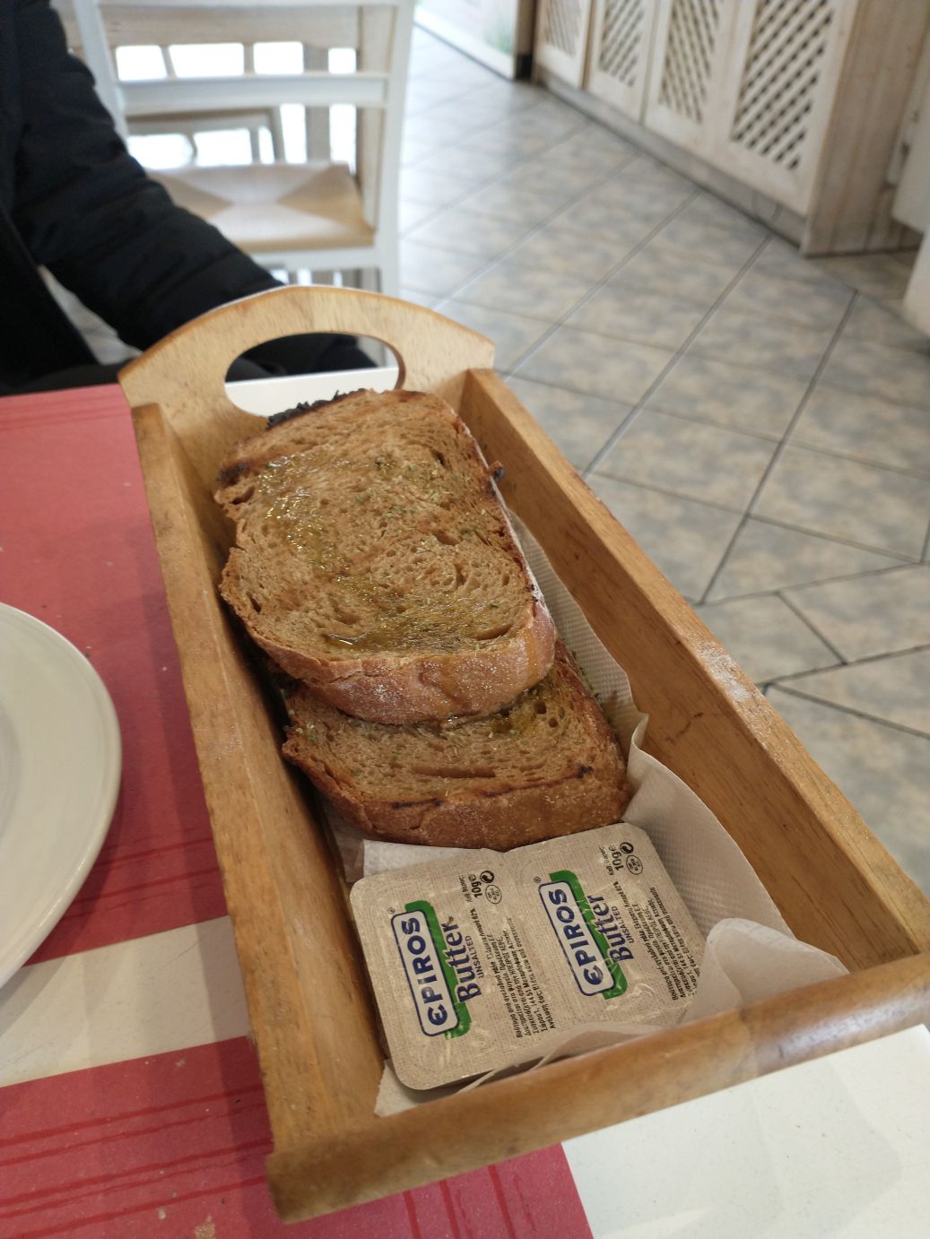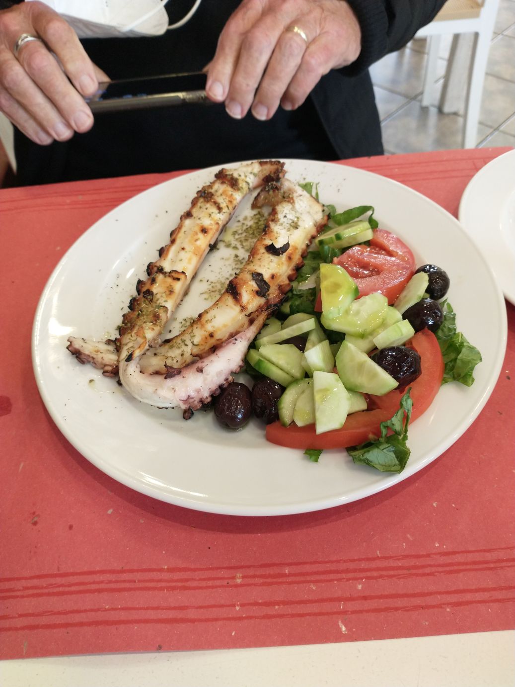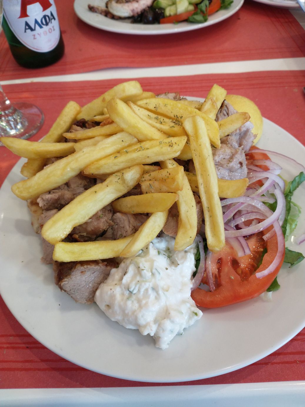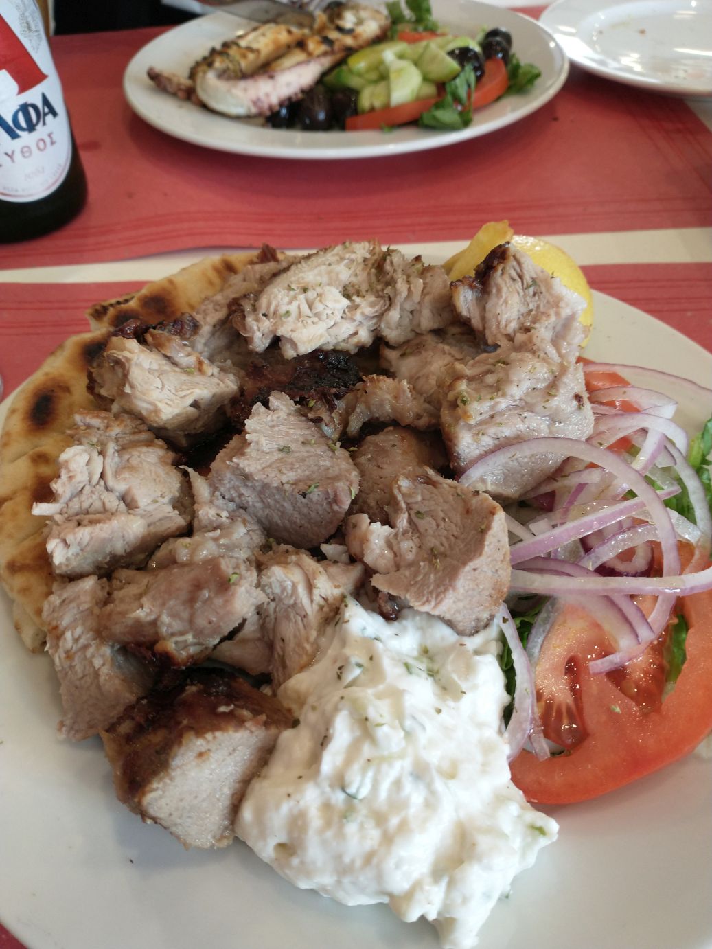 Thus, lunch at Stamna begins. The manager is a doll, and talking up a storm, kidding with everyone. The waitress was so sweet. The have a little outdoor terrace area, but its pretty darn cold, so we choose to stay inside, away from the one other table eating in the back and begin our gluttony! I order the Souvlaki – of course! And Ed orders his Octopus – of course! The bread is wonderful – thick slices of wheat bread, nicely toasted with olive oil. The octopus perfectly grilled. The souvlaki? It was the whole damn pig! Honestly! It comes out piled high with French fries (which I take off and put to the side), but underneath them? It is still piled high with pork. Oh my. And it is such good pork! And Tzatziki sauce. Yummo. Ed and I manage to polish it off, but oh wow – I’m going to need to do a bunch of walking to counteract this pig out (pun intended – LOL).