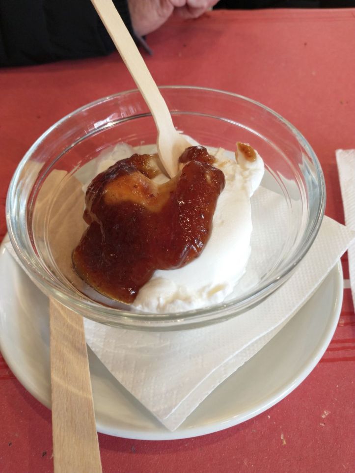 Upon finishing this huge meal – guess what? They bring out a dessert of Greek Yogurt and some sort of sweet jam. Ay yi yi. But you can’t turn down nice gestures, so we manage to make a dent in it even though we are stuffed to the gills. And it is yogurt, so in a way it was good for us. Rationalization works for me.