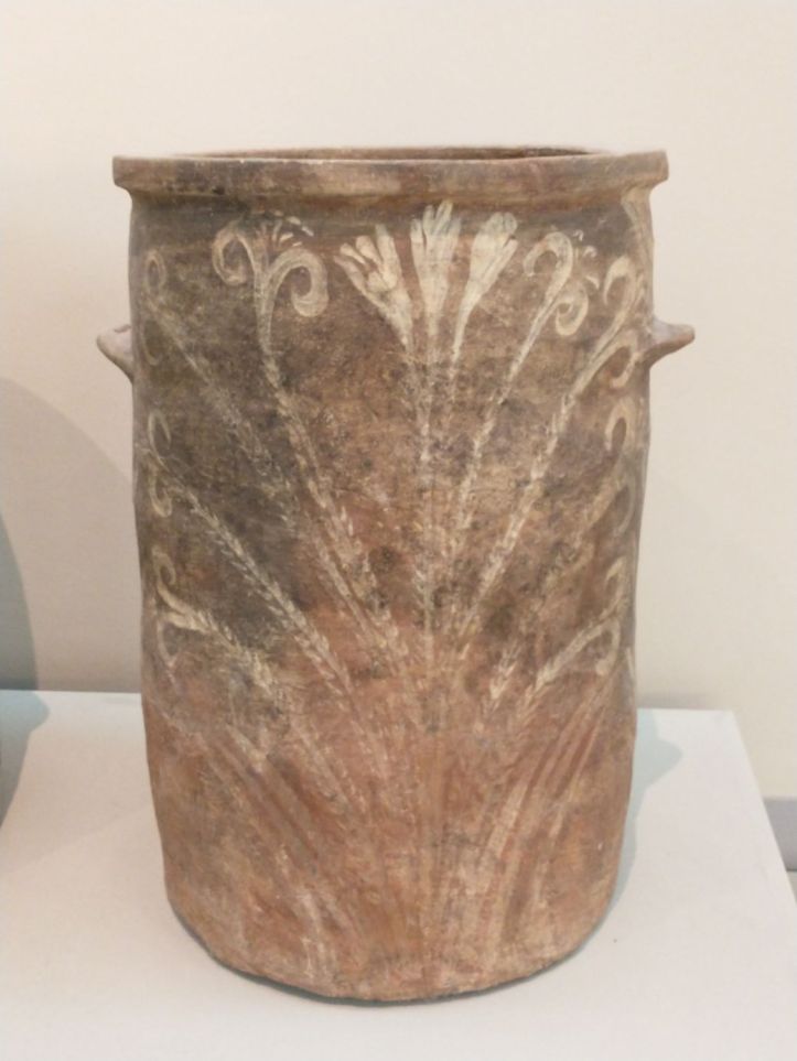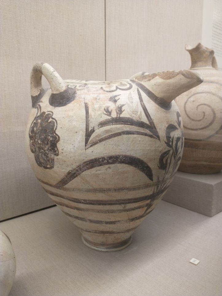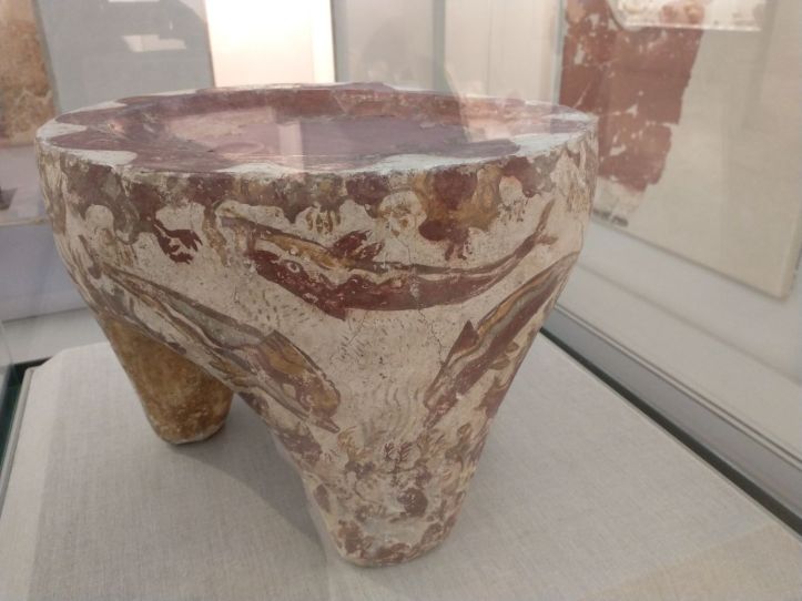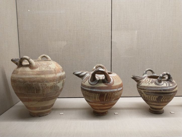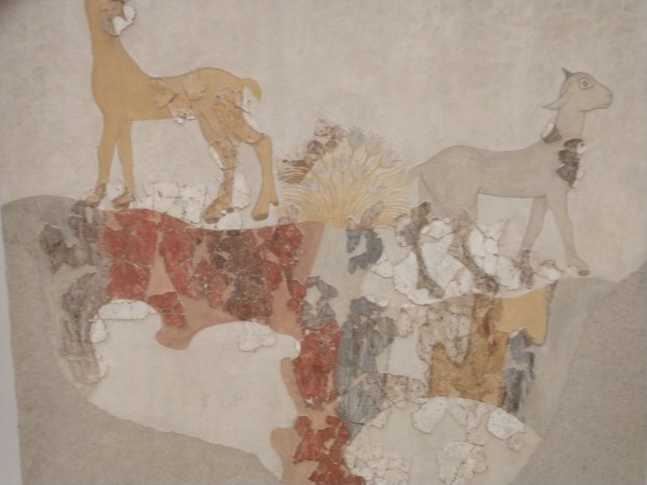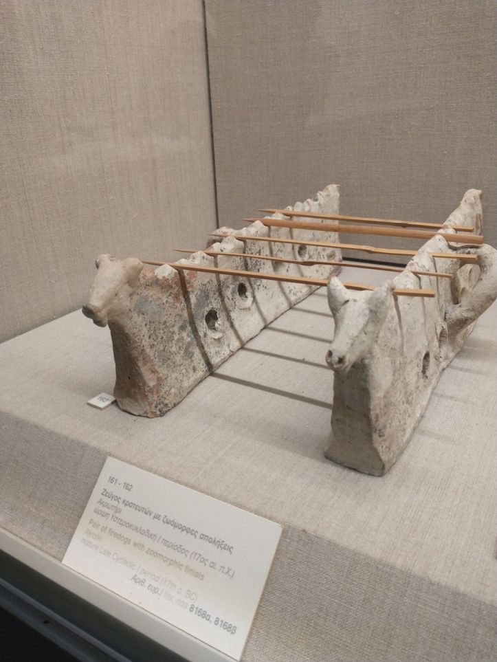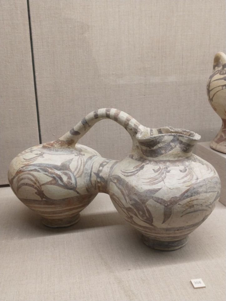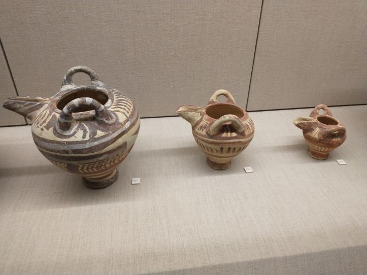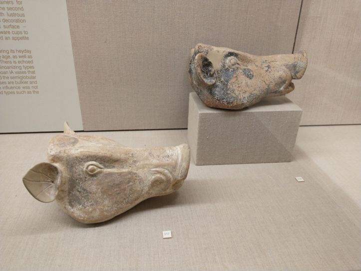Finished with the gluttony, we retrace our steps to visit the Museum of Prehistoric Thera. Figured might as well do something a little different this afternoon, huh? Visit a museum? But actually, this one does have an interesting bent – all prehistoric artifacts from around the island. Fabulous figurines, marble sculptures and pottery from 2700-2400 BC. I mean, really. It is amazing what they have found when excavating to build here. And a lot of it is pretty much whole – which is totally different than the reconstructions you normally see. I fall in love with the fire dogs – what a great idea for skewers over the fire. I can make those! The decorations on the a lot of the pots are very simple – yet beautiful. Theran potters used nature as their template and typically used only one or two colors, with a striking result.