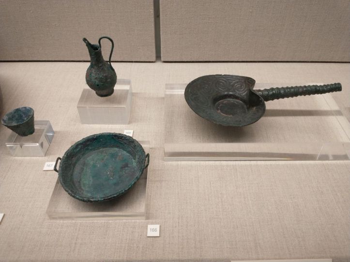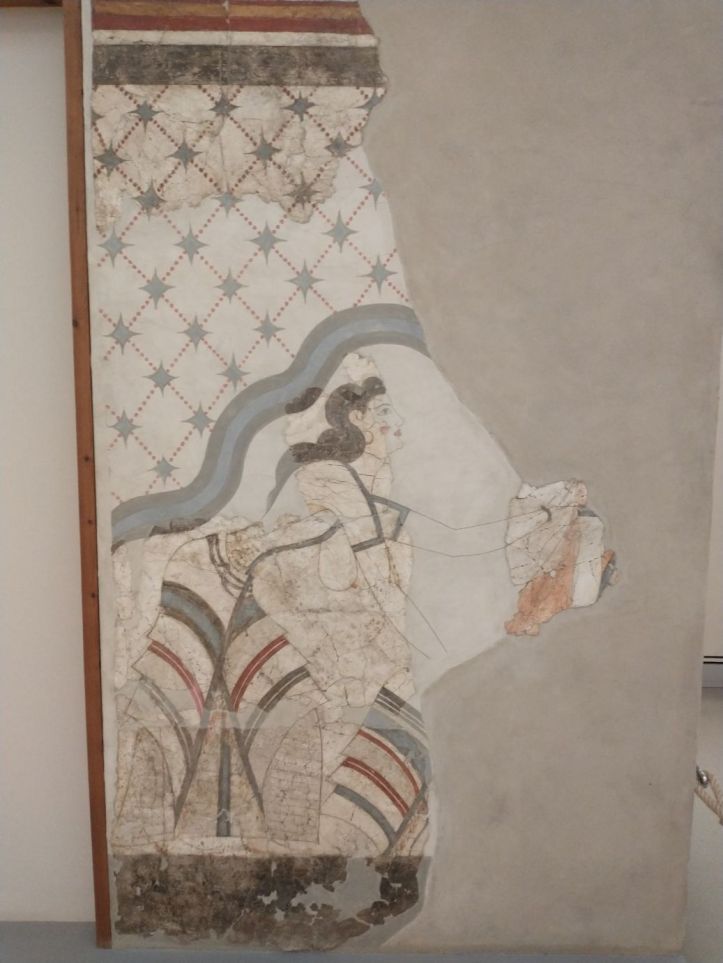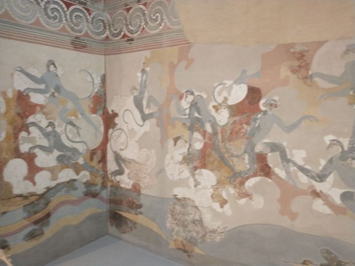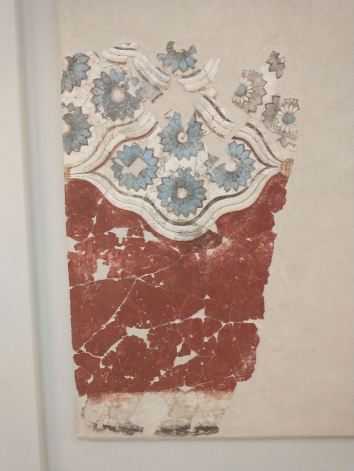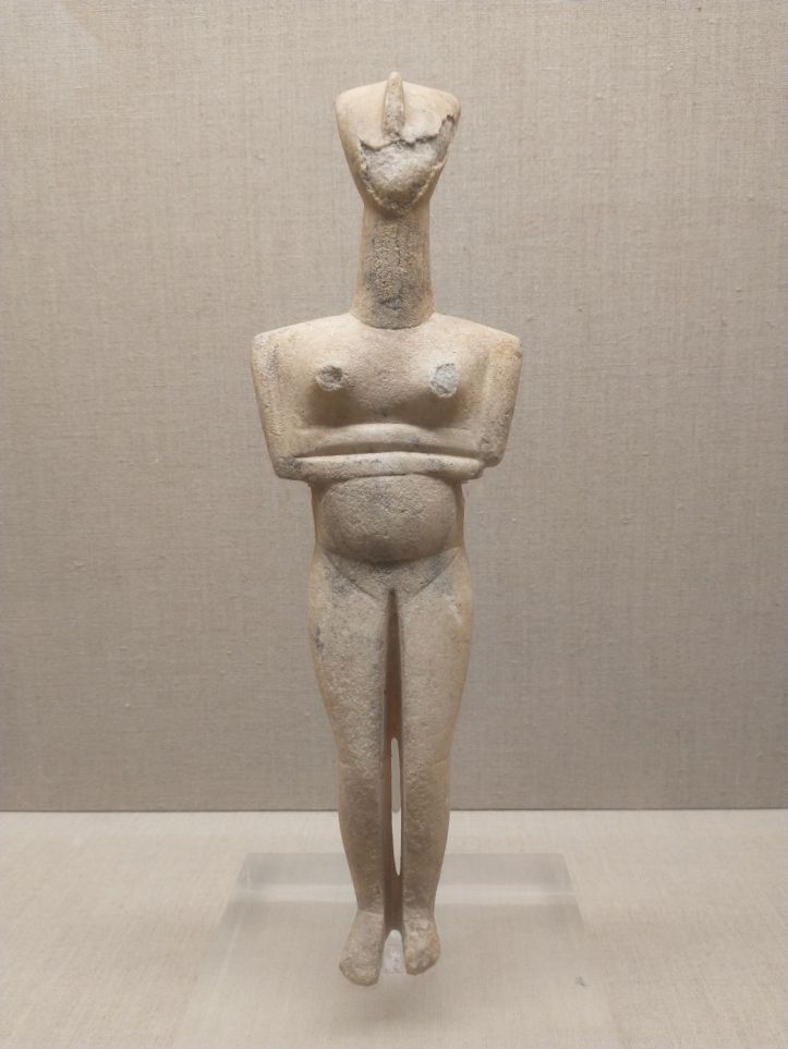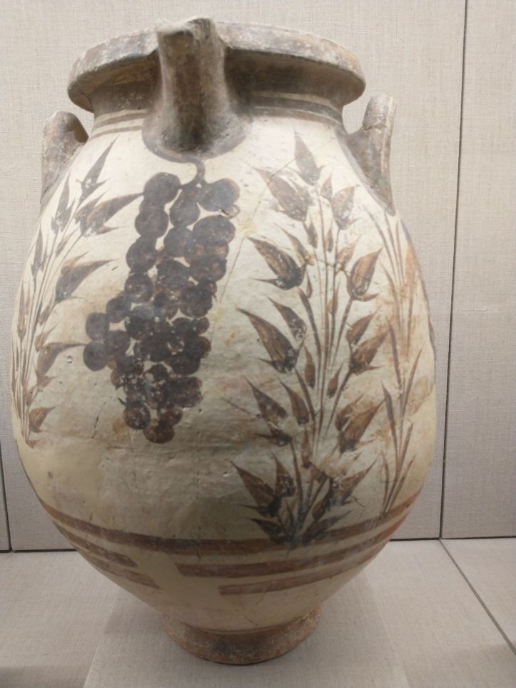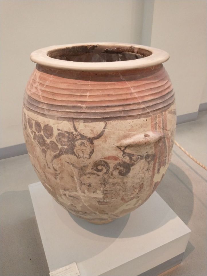Finished with the gluttony, we retrace our steps to visit the Museum of Prehistoric Thera. Figured might as well do something a little different this afternoon, huh? Visit a museum? But actually, this one does have an interesting bent – all prehistoric artifacts from around the island. Fabulous figurines, marble sculptures and pottery from 2700-2400 BC. I mean, really. It is amazing what they have found when excavating to build here. And a lot of it is pretty much whole – which is totally different than the reconstructions you normally see. I fall in love with the fire dogs – what a great idea for skewers over the fire. I can make those! The decorations on the a lot of the pots are very simple – yet beautiful. Theran potters used nature as their template and typically used only one or two colors, with a striking result.