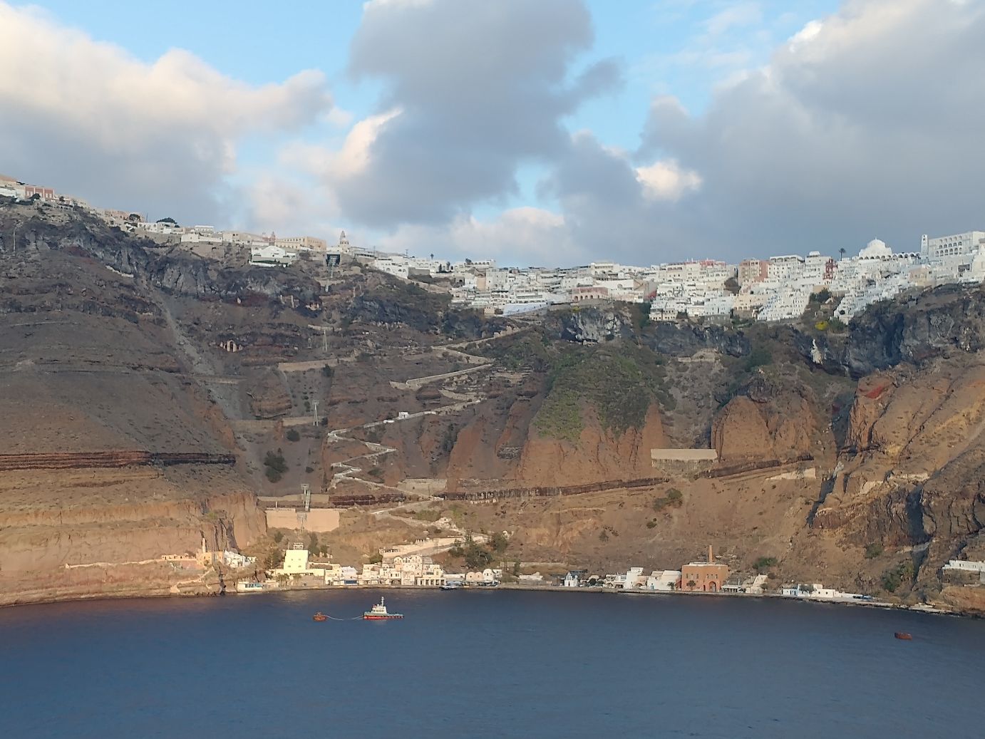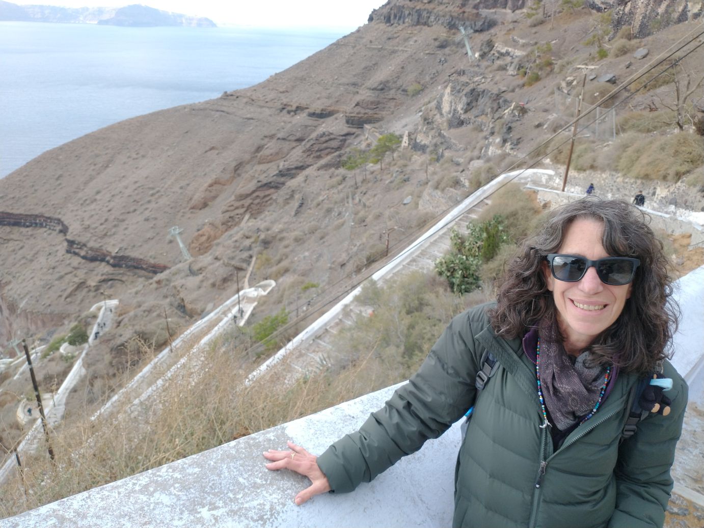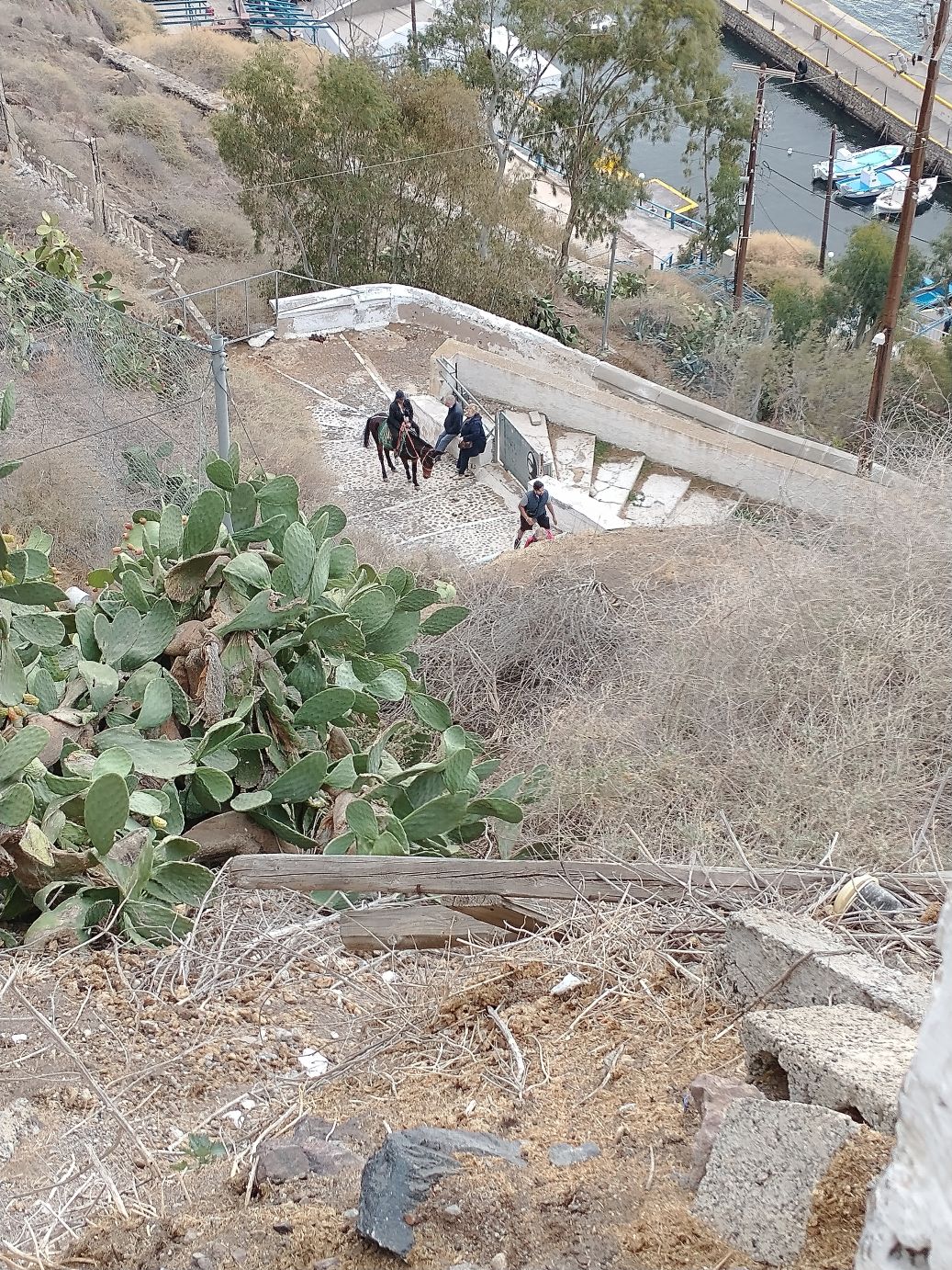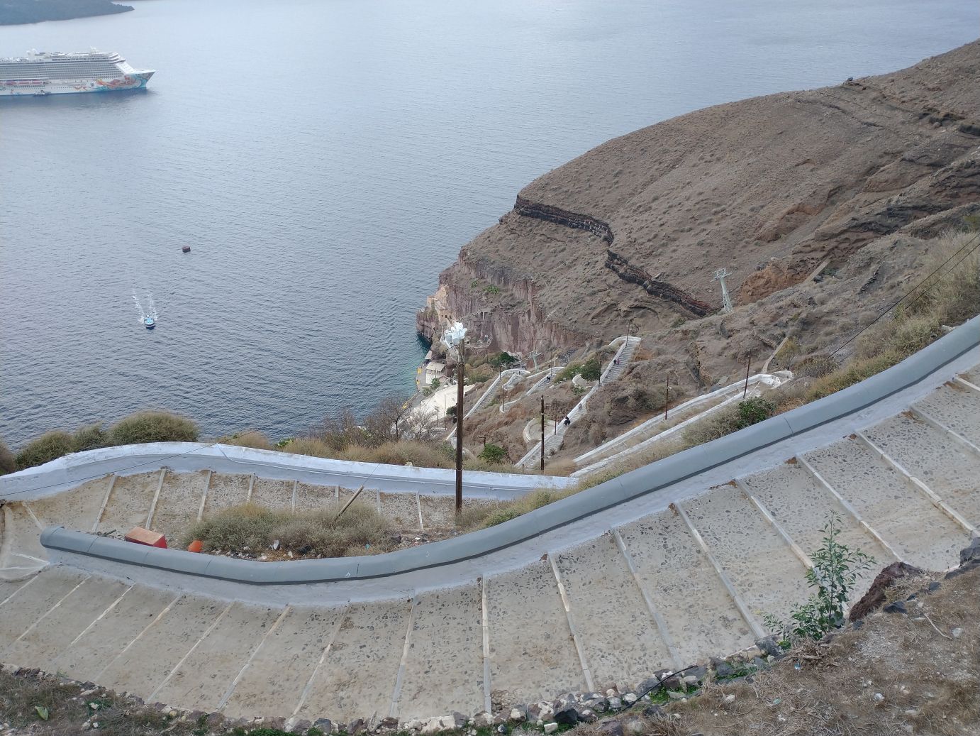 Winding our way through the souvenir shops and closed cafes and bars, we decide to get our exercise by walking down the stairway to the harbor – instead of dealing with the lines and hordes of ship people who will be taking the cable car back down. It’s cool enough that it makes the walk more enjoyable – and the donkey poop less offensive! And boy do our memories serve us well – donkey poop definitely abounds. It is almost hard to look around us as we descend because we are always looking down to avoid a) tripping and b) donkey poop! We do manage to stop often for photos – and videos of the cable car going down to the harbor (sometimes it amazes me we actually got on that thing! It can be sort of scary when you think about it.) And, fortunately it is late enough in the day that no one is actually riding the donkeys on the stairway – save one group we manage to pass toward the bottom – so we avoid the typically inevitable collision (you have to pick: collide with the donkey, the stairway wall or the poop).