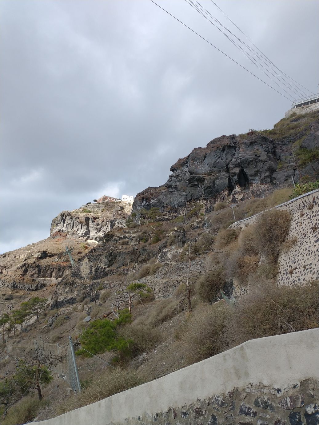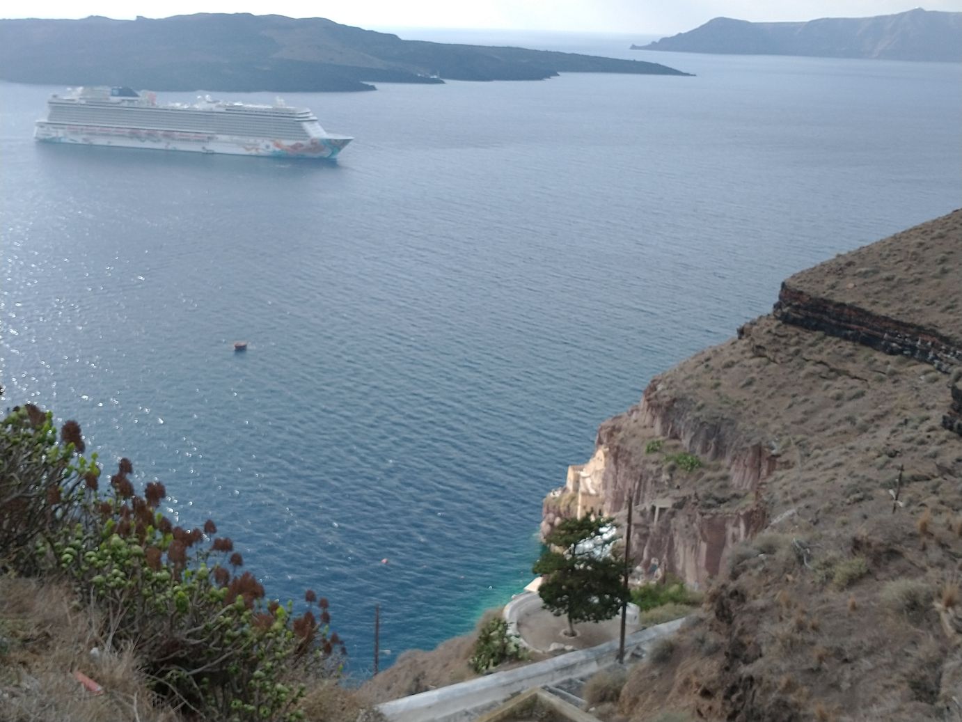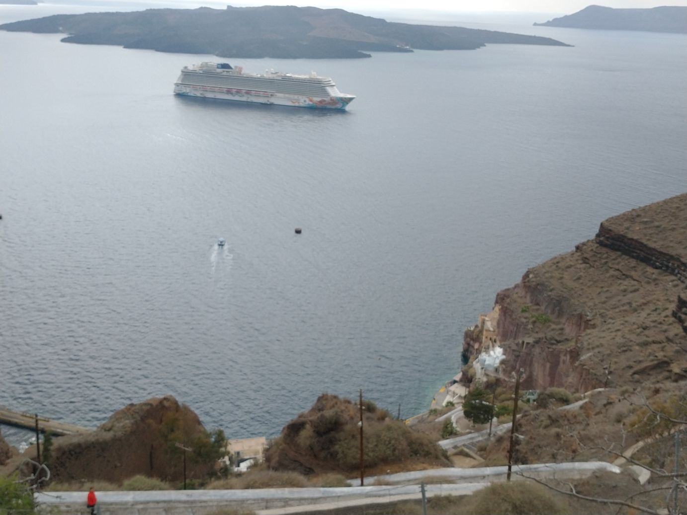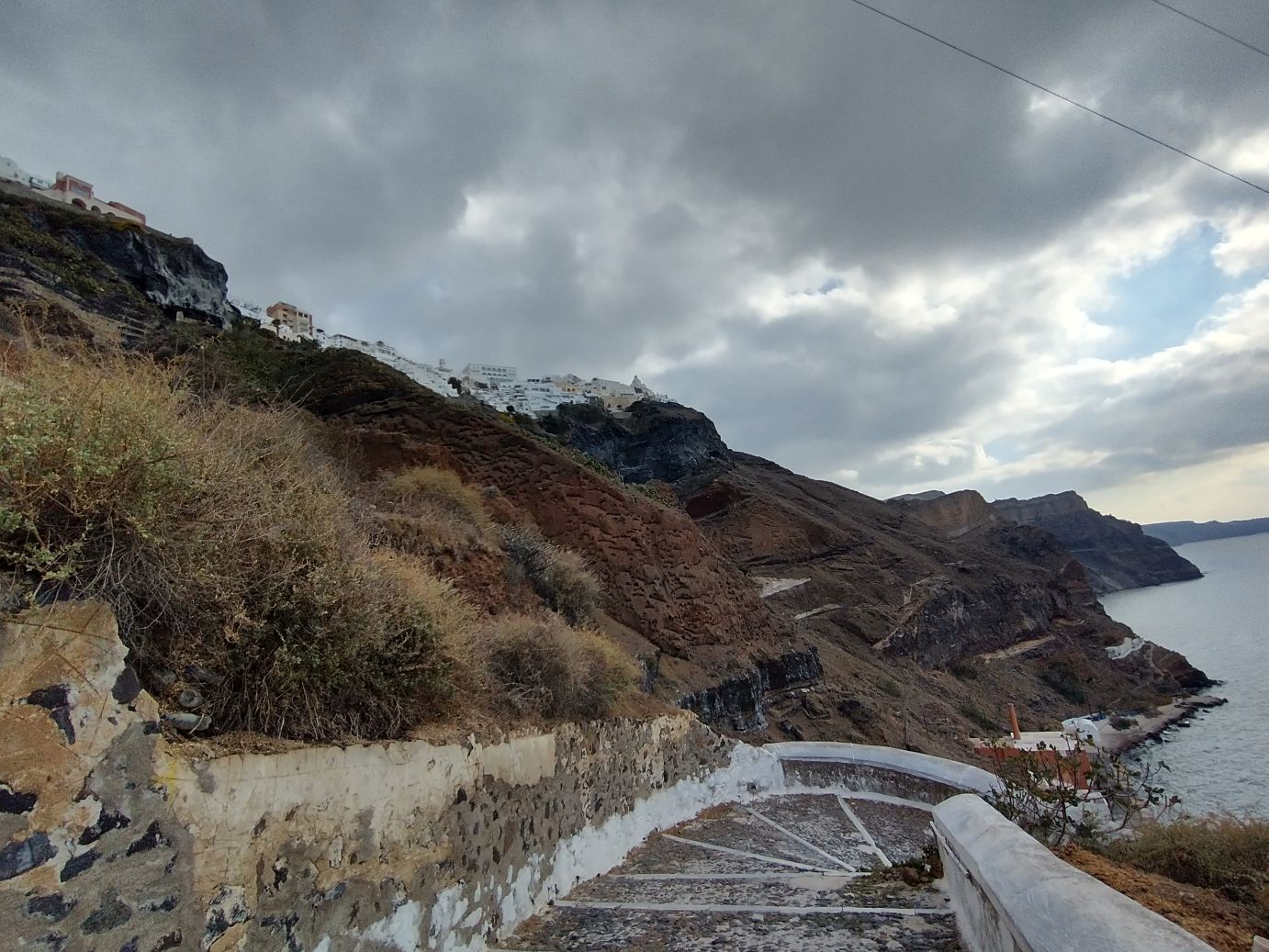 Winding our way through the souvenir shops and closed cafes and bars, we decide to get our exercise by walking down the stairway to the harbor – instead of dealing with the lines and hordes of ship people who will be taking the cable car back down. It’s cool enough that it makes the walk more enjoyable – and the donkey poop less offensive! And boy do our memories serve us well – donkey poop definitely abounds. It is almost hard to look around us as we descend because we are always looking down to avoid a) tripping and b) donkey poop! We do manage to stop often for photos – and videos of the cable car going down to the harbor (sometimes it amazes me we actually got on that thing! It can be sort of scary when you think about it.) And, fortunately it is late enough in the day that no one is actually riding the donkeys on the stairway – save one group we manage to pass toward the bottom – so we avoid the typically inevitable collision (you have to pick: collide with the donkey, the stairway wall or the poop).