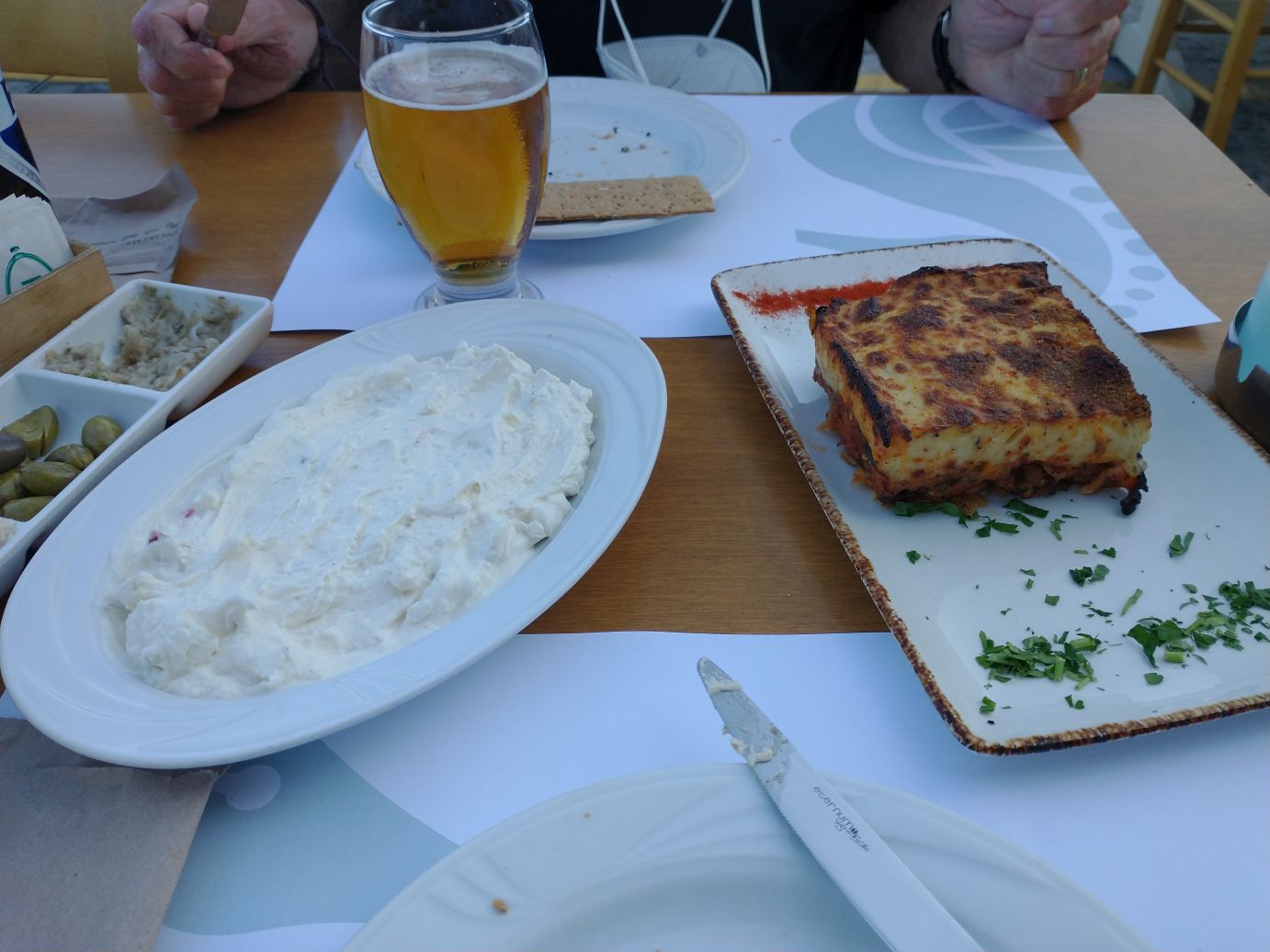 Holy cow – the food! First of all they bring an entire bag of bread (and entire bag! Full of different breads and crackers) – plus some sort of hummus spread (which is actually pretty good), babaganush type spread and olives – along with this huge carafe of wine and a huge beer. Then as “appetizers” we ordered a spicy cheese spread of feta and peppers, which is delicious, as well as an amazing seafood moussaka, for which Ippokampos is famous. As a main meal (ha! I’m already stuffed) we get grilled octopus (very good) and grilled cuttlefish in squid ink. Oh yum. But oh my, we’ll have to walk miles and miles to exercise this meal off. As we feast, the place totally fills up, even the enclosed seating areas are filling up – so we definitely made the right move getting here early and scoring our prime location.
