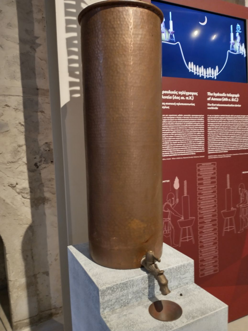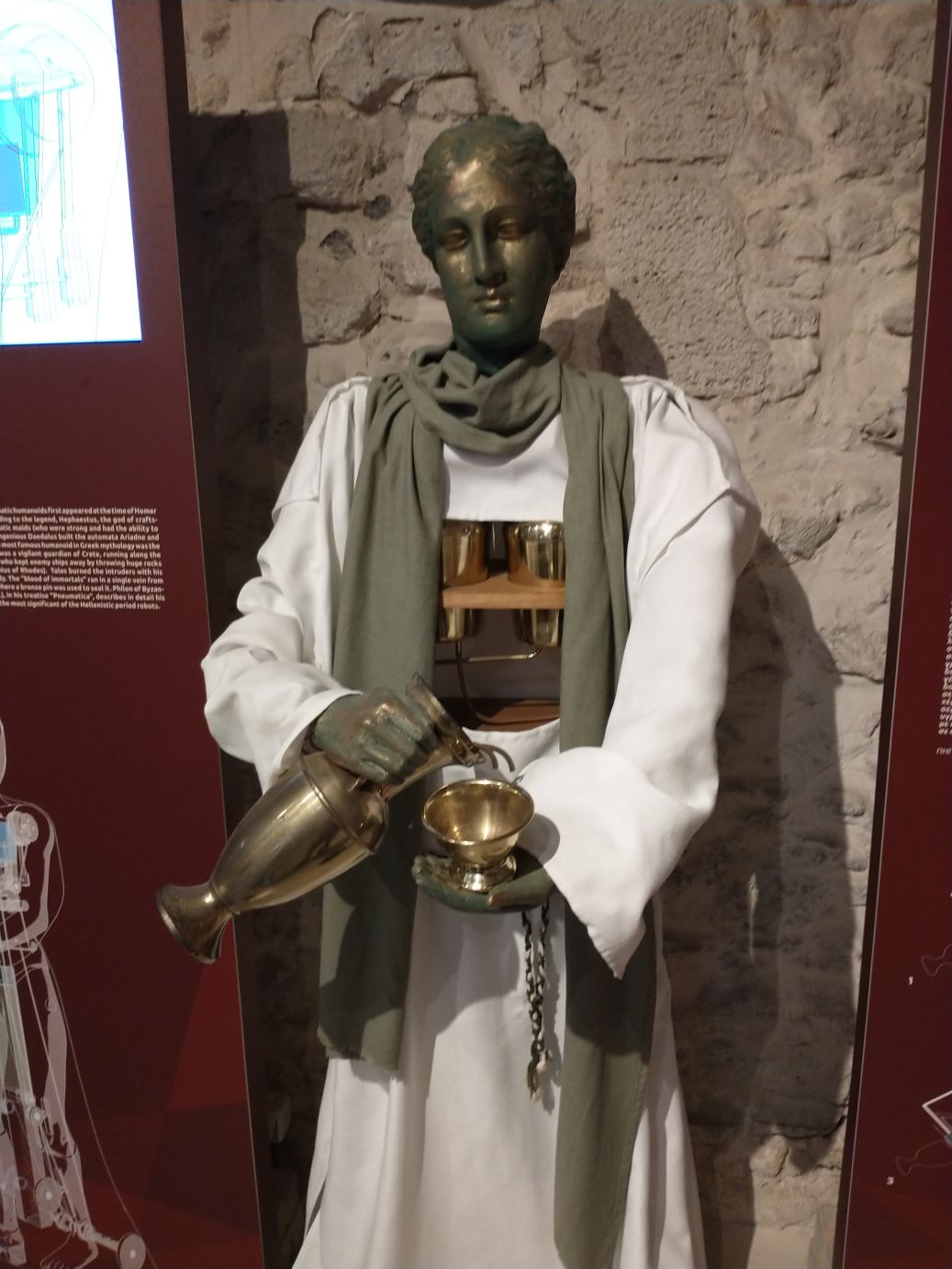 Our next and final stop for the day is the Museum of Ancient Greek Technology, which is sort of on the way back to the ship. Ok, yeah, another technology museum. Yawn. But, wait, no, not at all! This is a fascinating collection of seriously ancient technology that shows how the ancient Greeks had developed so many different inventions and processes that we still use today in one way or another. Pulleys & belts. Pistons & cylinders. Gears & perpetual screws. Sprockets & roller chains. Bolts & Nuts. Fascinating. Most intriguing was how they figured out hydraulics, and used it to power a telegraph machine, the first worldwide telecommunication device. They created “automatons” that used hydraulics to power movement and sound – One of the examples here is the chirping birds and returning owl. The birds chirp, but then get frightened and stop when the owl turns to them.
