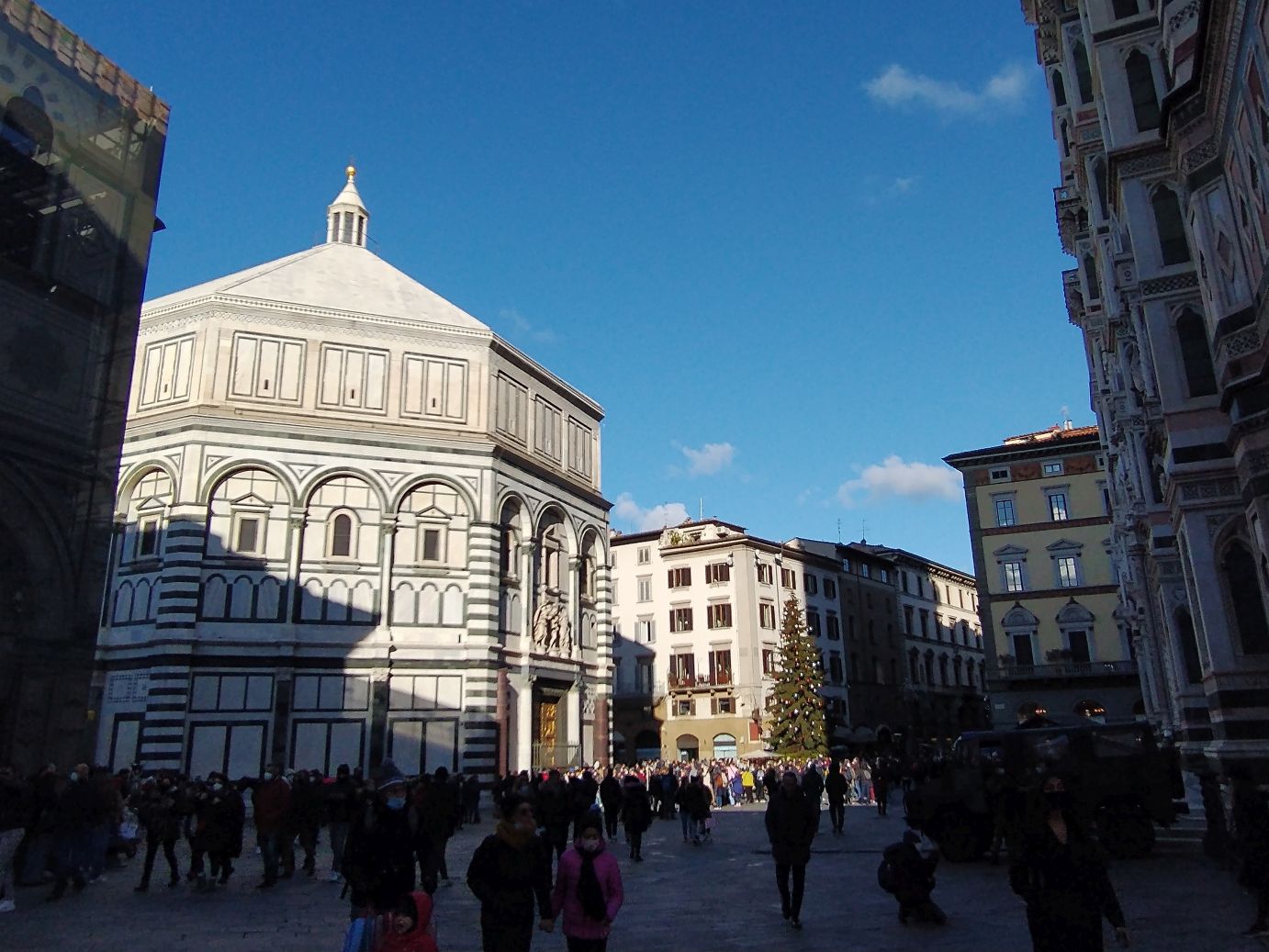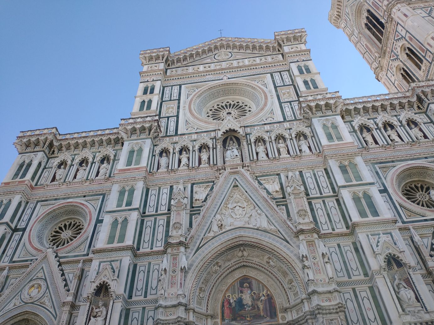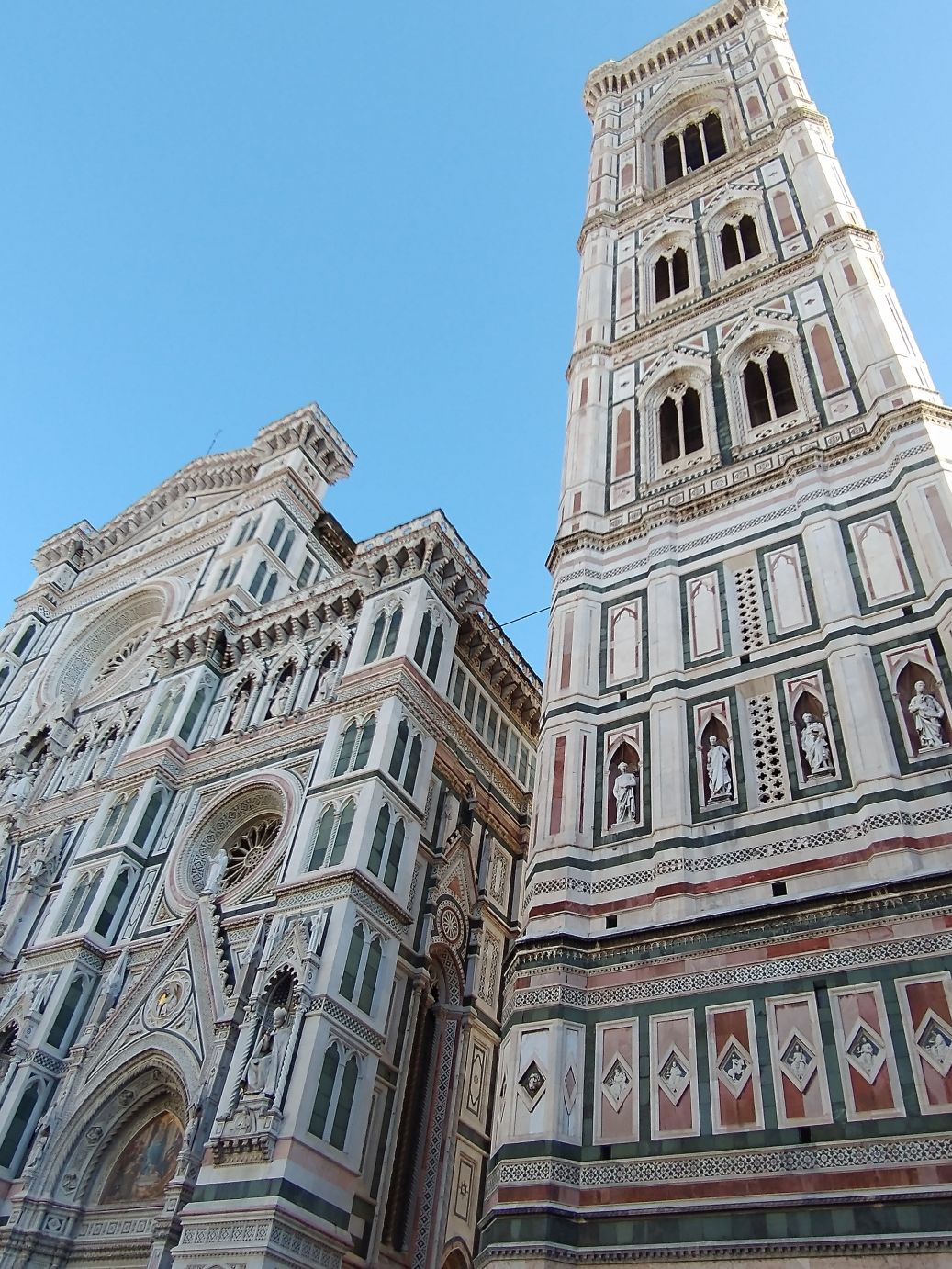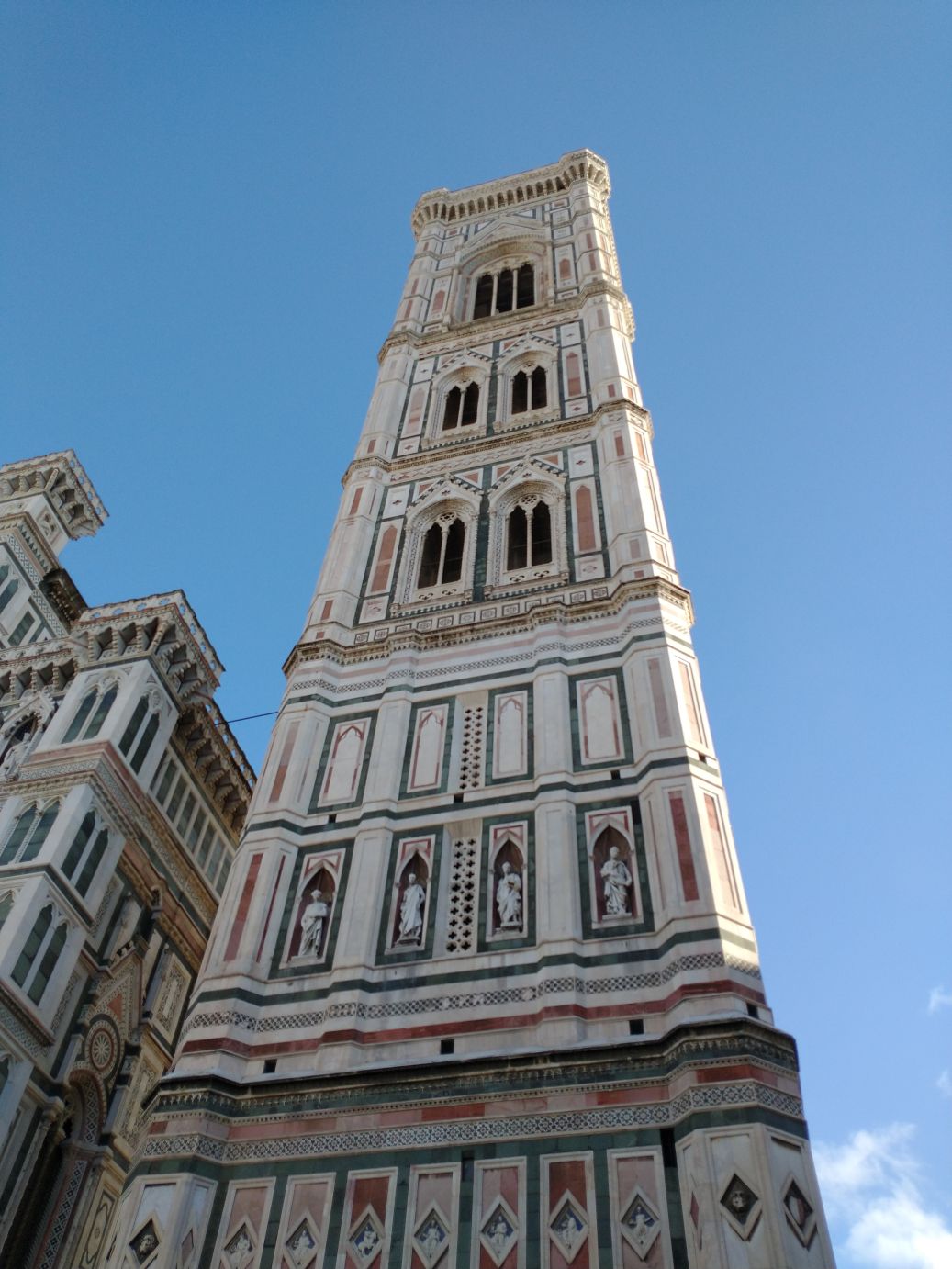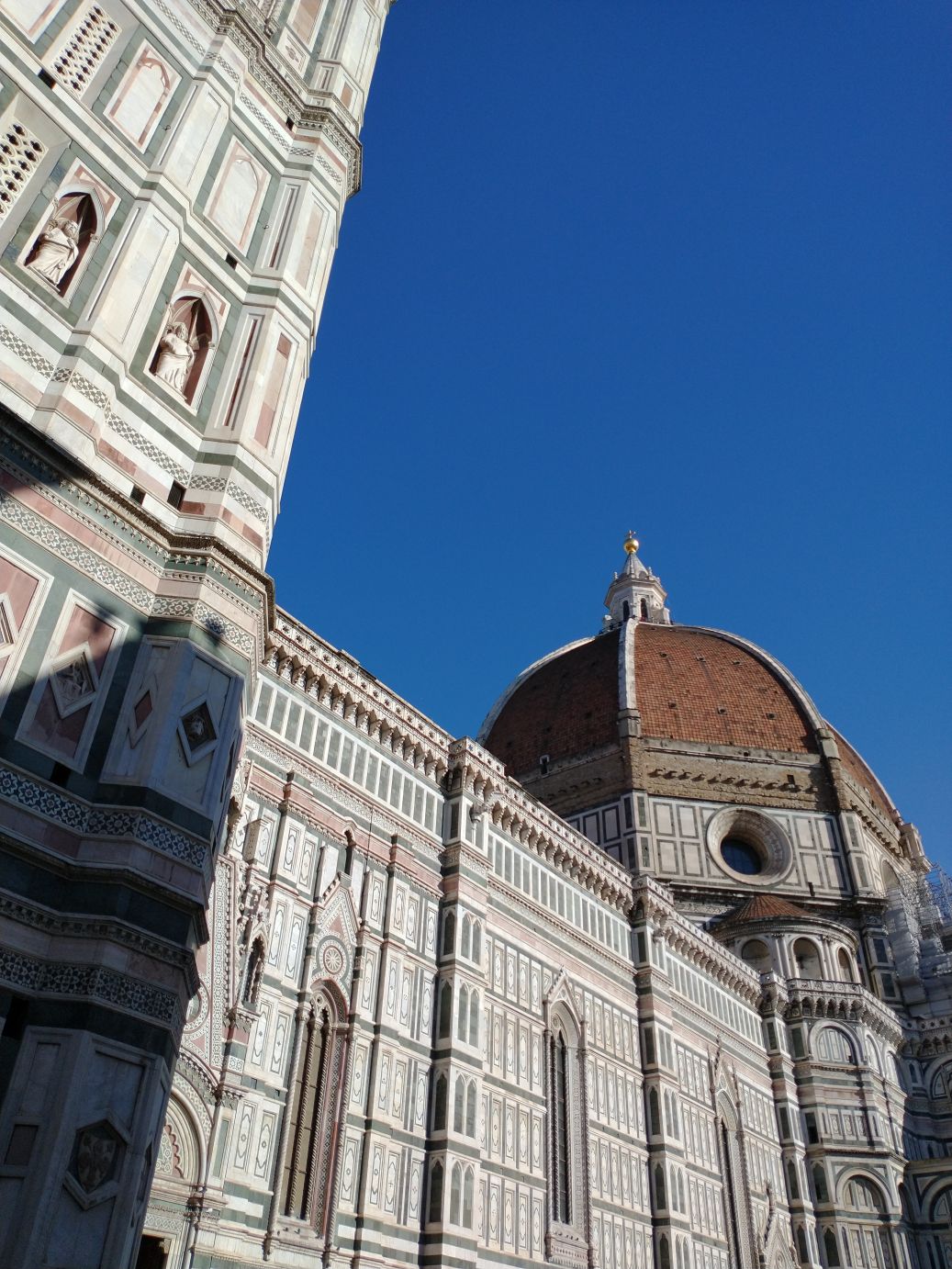 We finally make it to the square, and oh my God! The people! It is jam packed with people. You could barely take a selfie if you wanted to – although the stick does make a good weapon! LOL. We’ve been so spoiled with the lack of people everywhere we have been so far, this is a huge shock to the system. You can barely take a picture, let alone a selfie. Sharif has given us 20 minutes to roam before herding us to the restaurant for a snack (yay! This was not mentioned in the description, so we are thrilled; I had actually brought a couple of apples and some bread with us just in case we didn’t have time for food – on a 7 hour tour, we’d need some little snack) and we use our time as wisely as possible, getting away from the bulk of the crowds to try to snap some photos of the Duomo and bell tower.