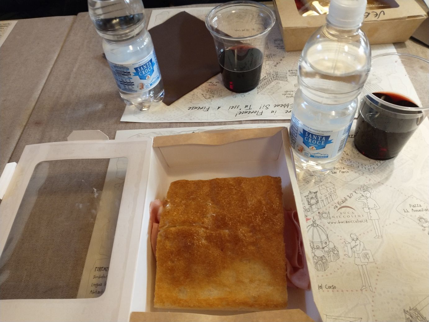We get the scoop on bathrooms from Sharif, and Ed pops in the upstairs room while I follow everyone downstairs to save seats. We have a lovely snack (and it is what the Italians eat as their snack between breakfast and lunch) of mortadella sandwich on this special bread (forgot the name) along with a really nice chianti wine. And for me to say it is a really nice wine, you know it must be good, because as everyone knows, I don’t like reds at all.