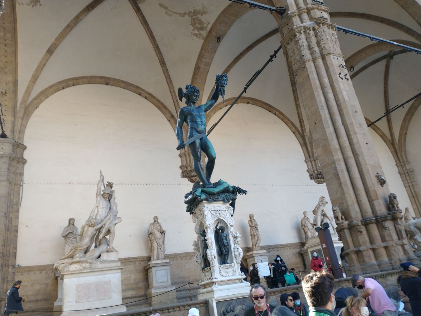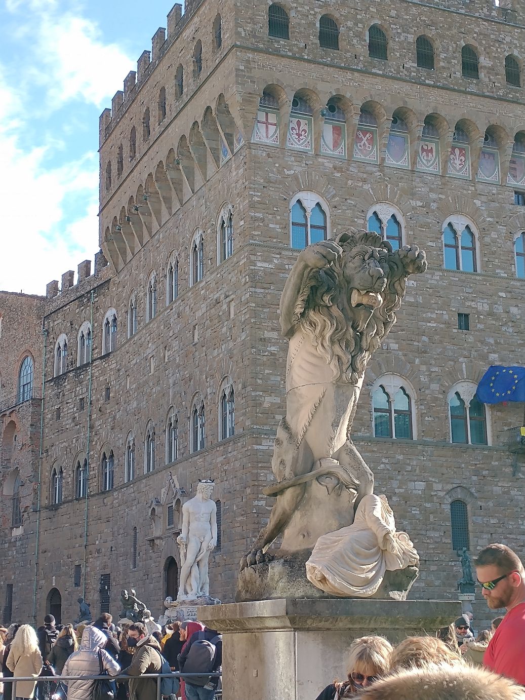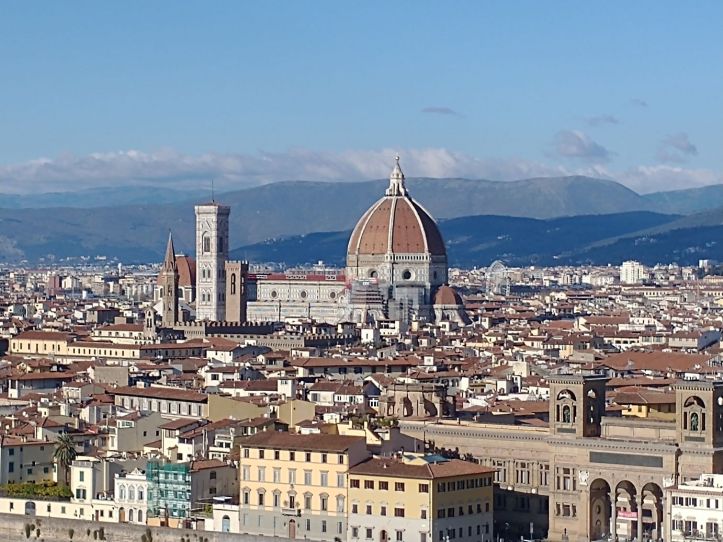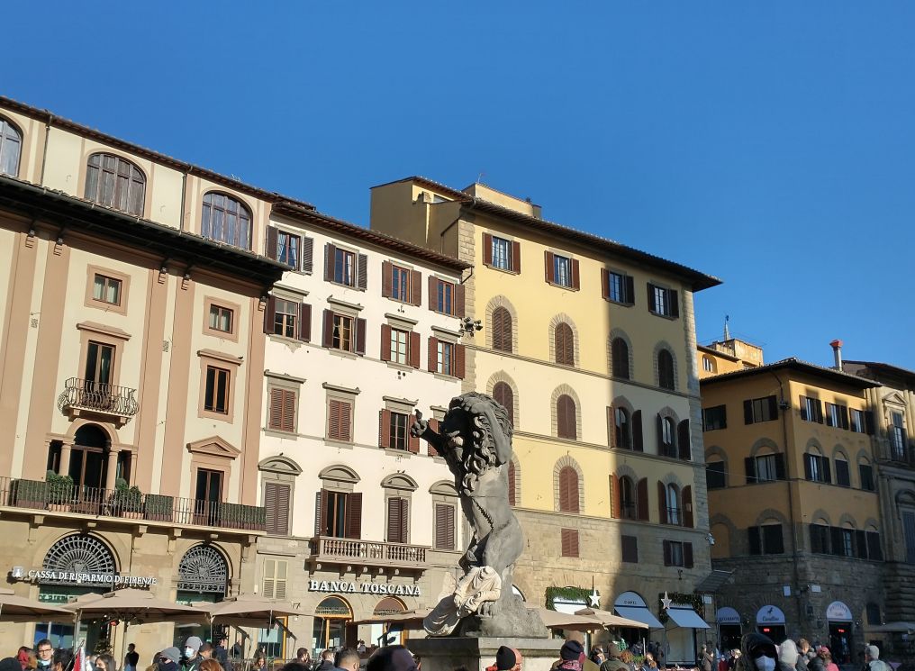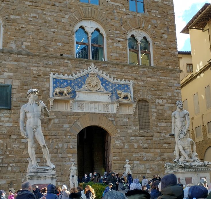 As we are there, a taxi pulls up and takes one of the other bus passengers back to the bus – apparently they couldn’t walk any further. One down, however many more to go. The group finally coalesces around Sharif and we head off to Uffici square to view the David statue, with more free time that we use to walk around the block, perusing things at the little market stalls and remembering our first time in Florence where had the most expensive cappuccino ever -8 Euros each. Found the restaurant right on the square where we remember.