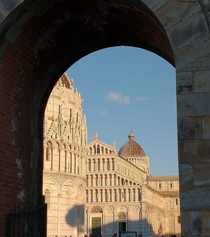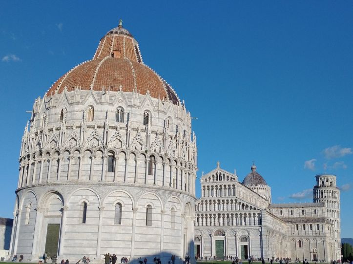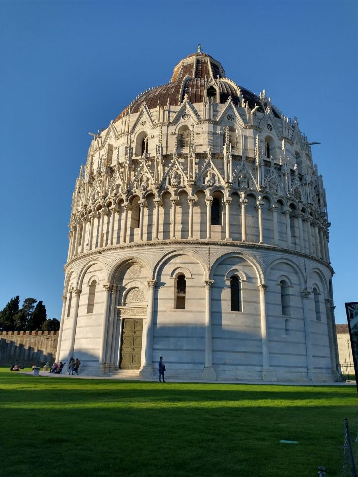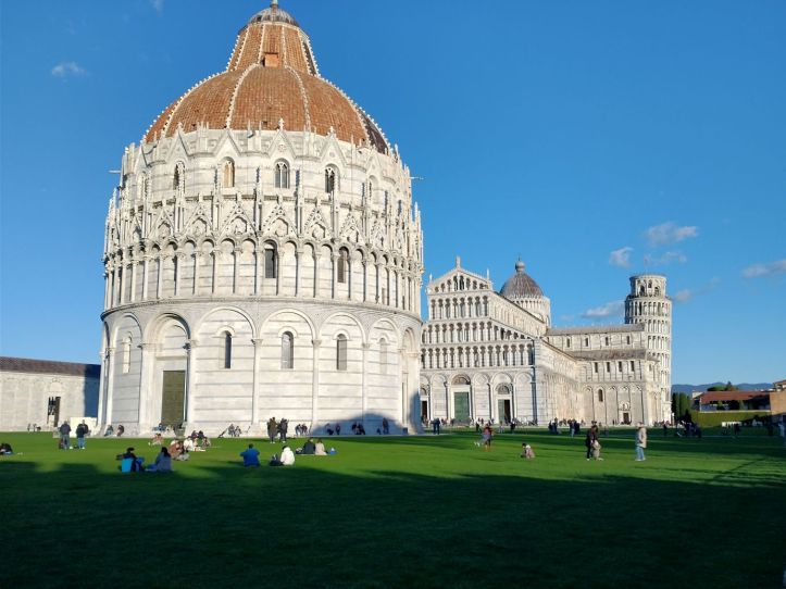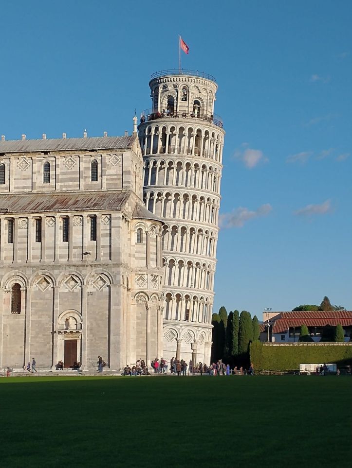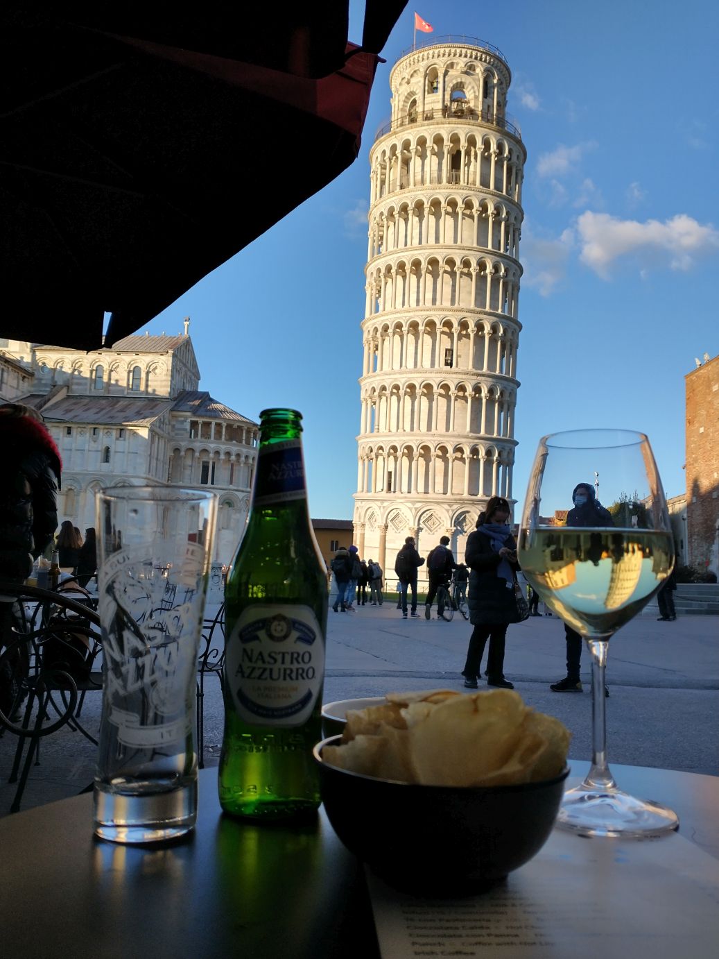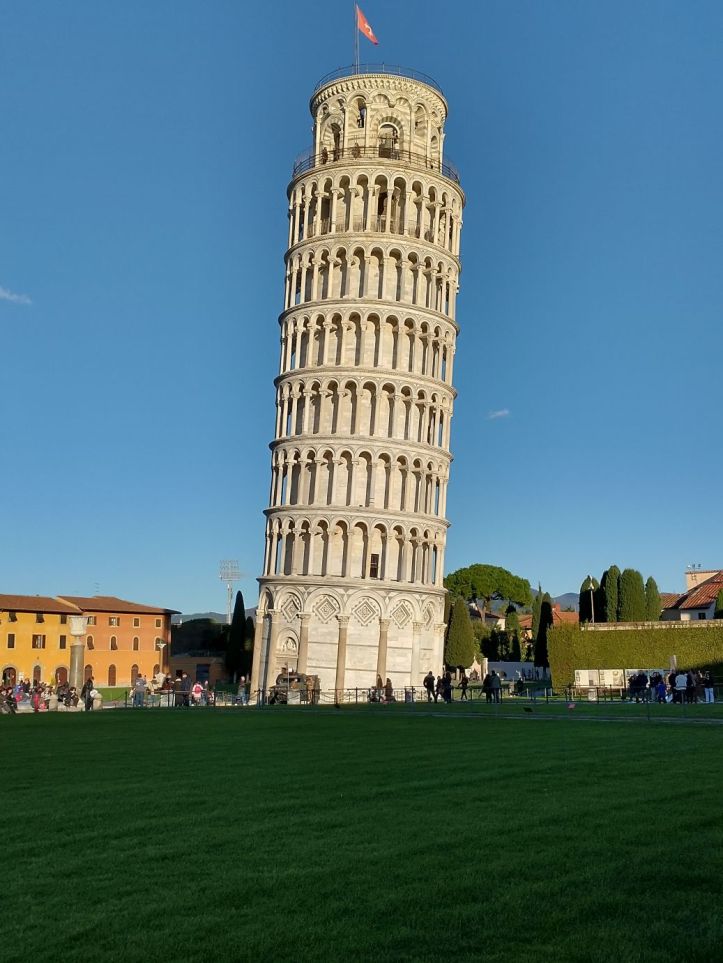The ride to Pisa is easy, but here again, the walk into town is not. Another taxi is arranged for our mobility challenged guests and the rest of us follow Sharif to the gates of the historical city. We have 40 minutes here, which is great. There is enough time for photos and a beverage stop! We figure it will be expensive – it’s Pisa – but what the heck. We find a table right across from the tower and settle in for a nice wine and beer – plus little drink snacks. And bonus – the cost is reasonable! So we relax and people watch as we sip our drinks, finally leaving the cozy little table to join the waddlers back at the gate for our ride home.
