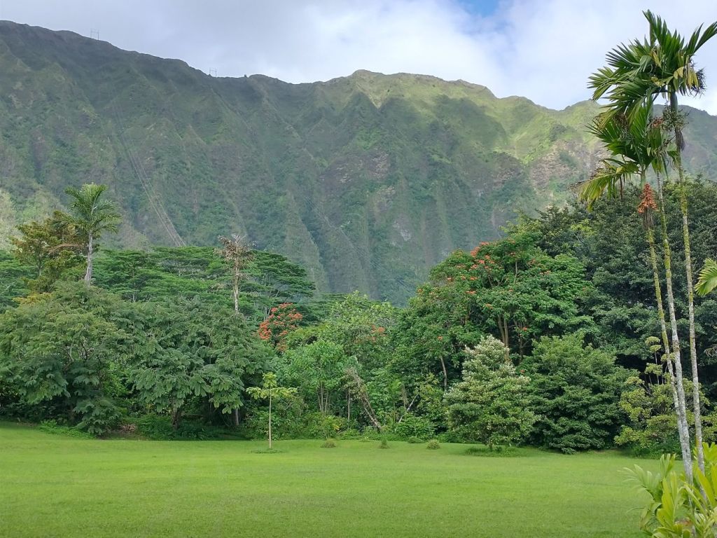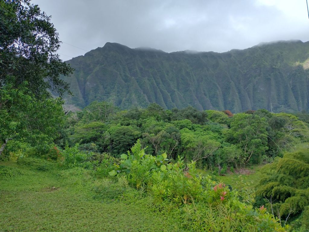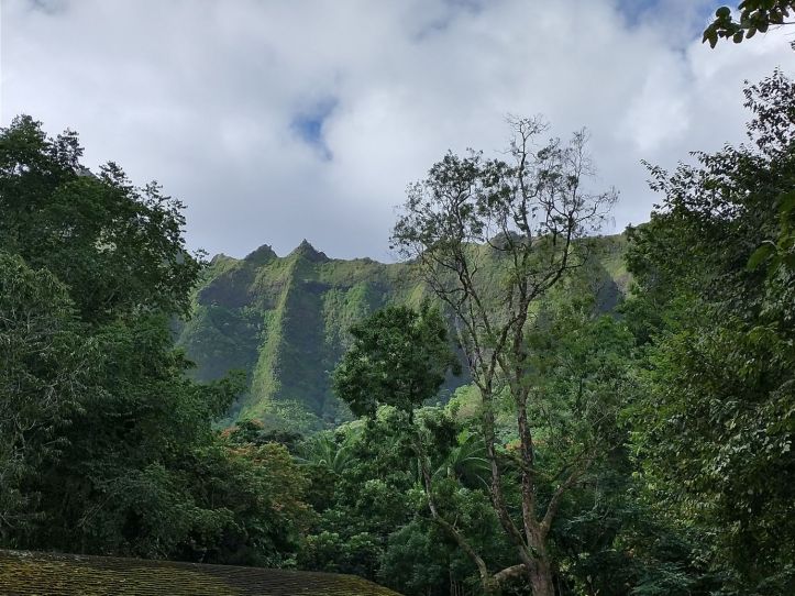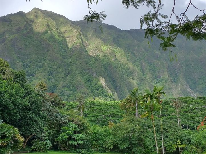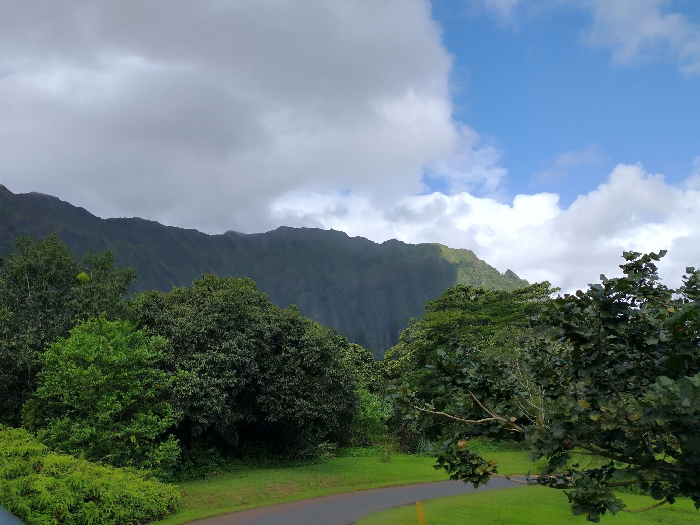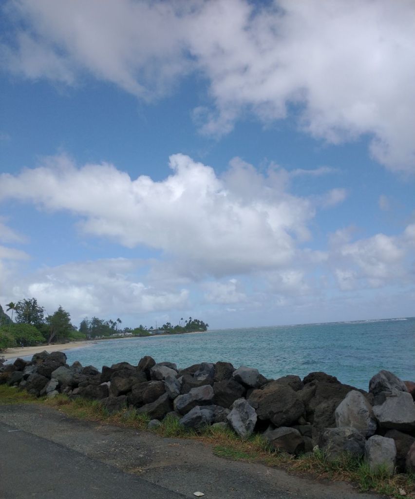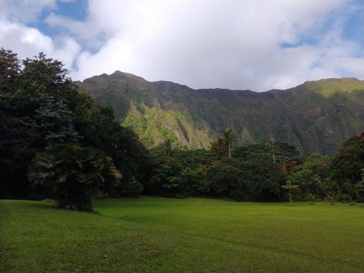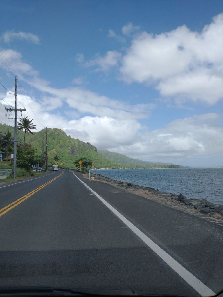 Back on the road, we hit the free way that takes us up and around the North Shore – with gorgeous vistas at the Kualoa Ranch (big tourist attraction, Jurassic park rides, horseback riding, ATV, etc. – but still pretty – above the parking lot)….