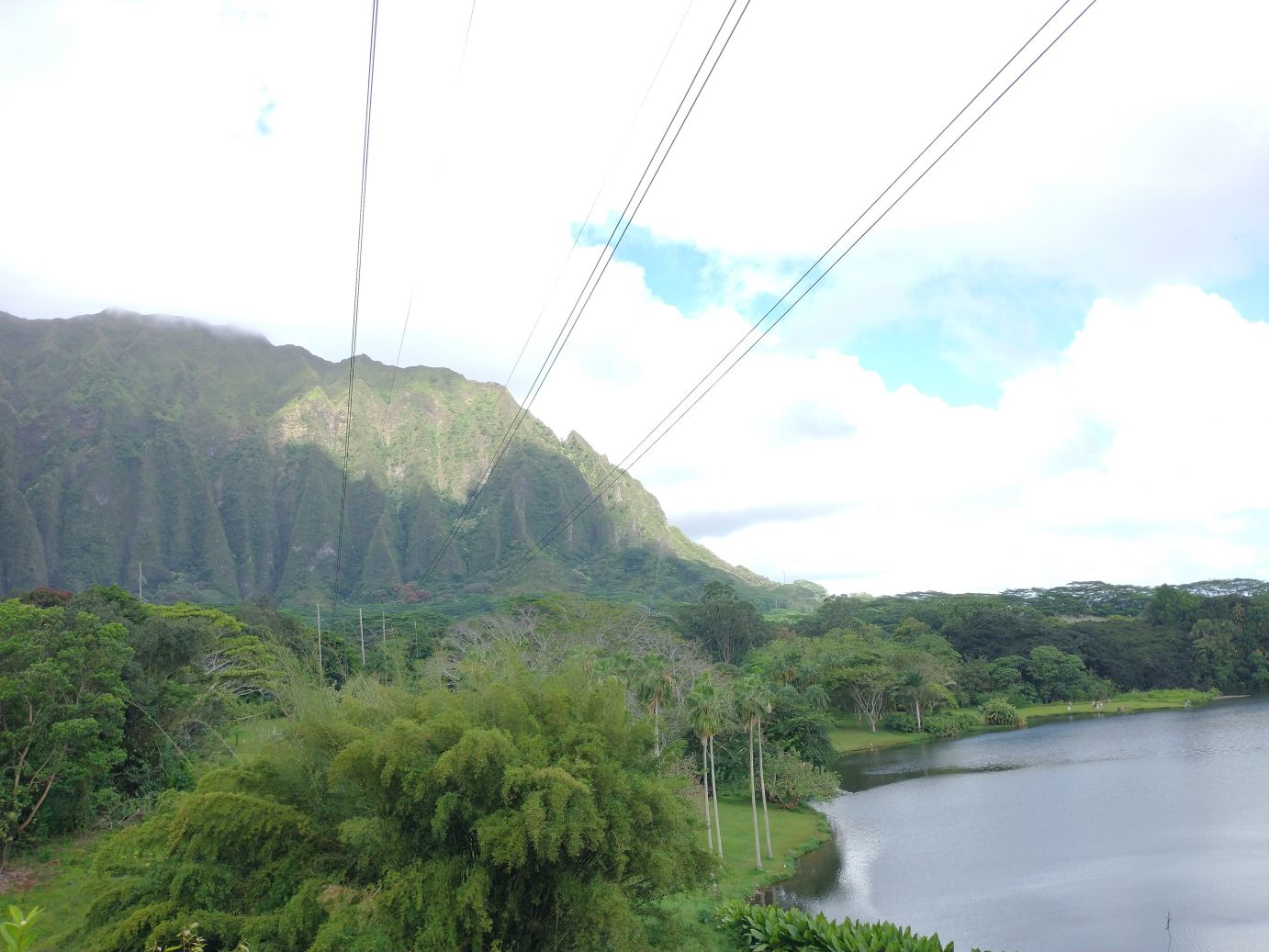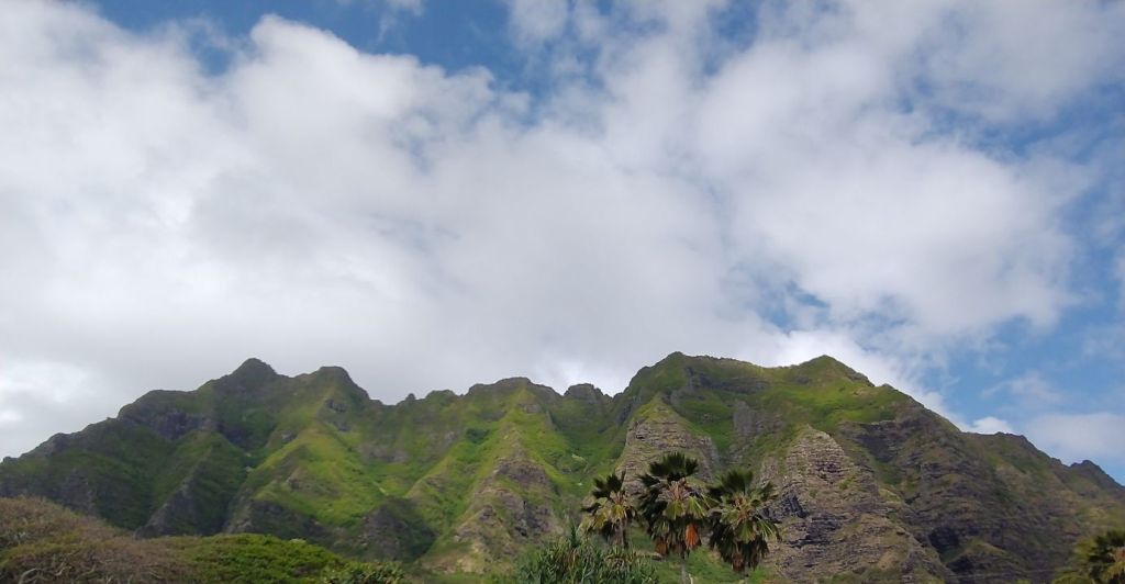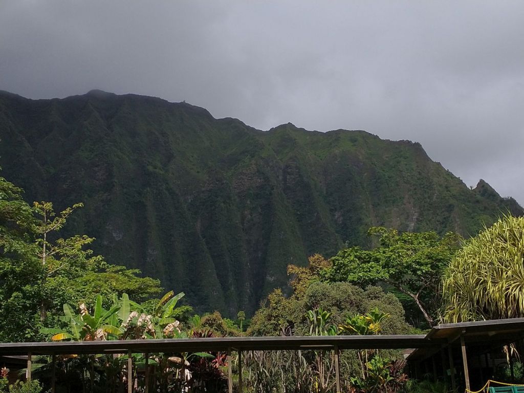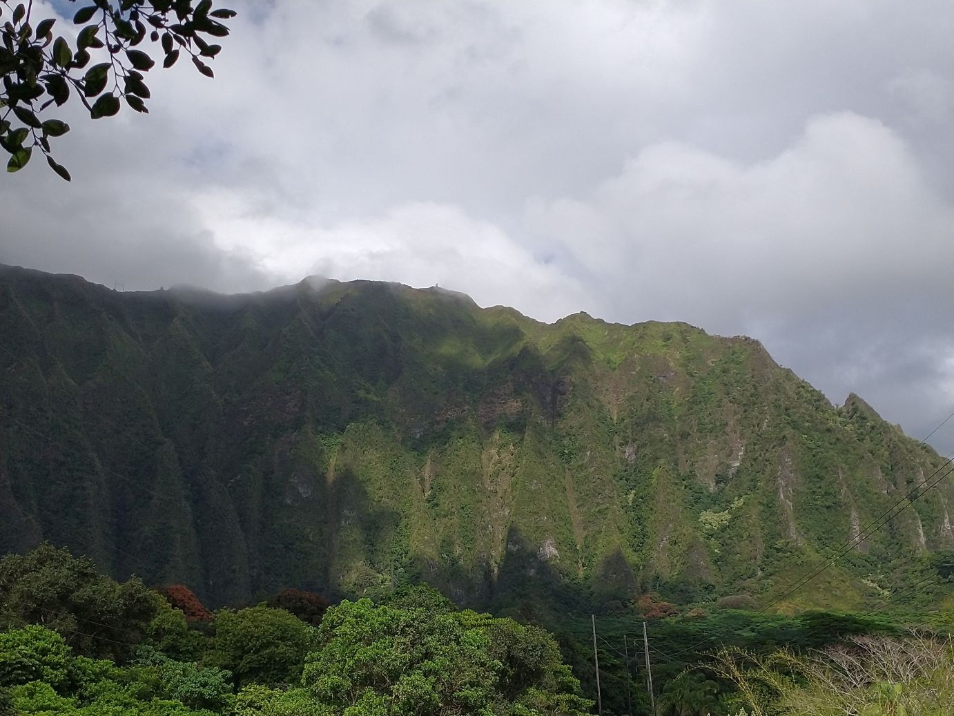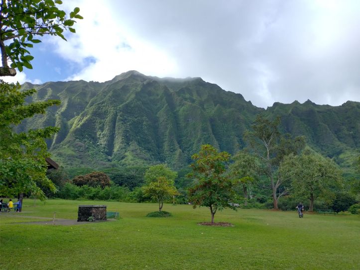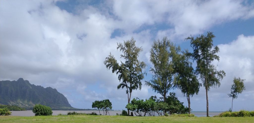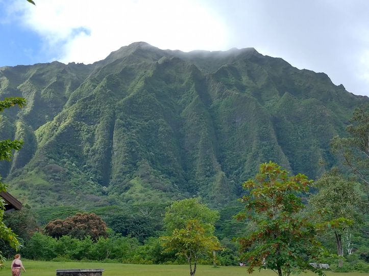 Back on the road, we hit the free way that takes us up and around the North Shore – with gorgeous vistas at the Kualoa Ranch (big tourist attraction, Jurassic park rides, horseback riding, ATV, etc. – but still pretty – above the parking lot)….