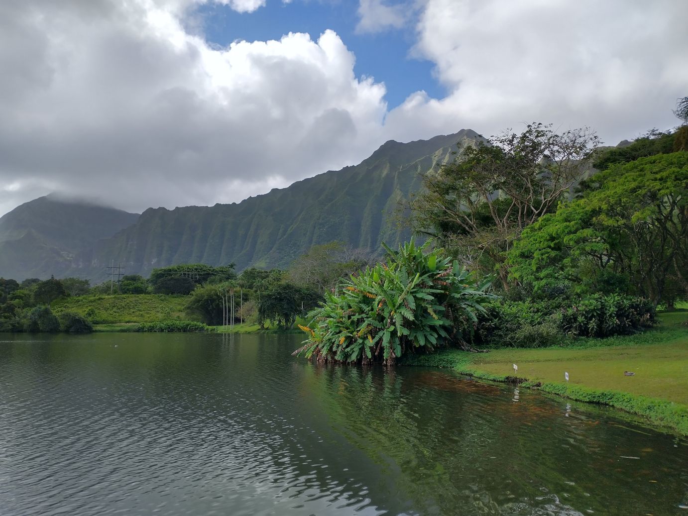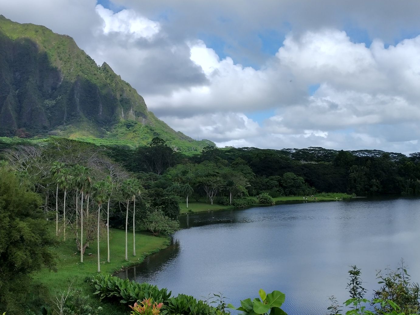 We head down to the lakefront, intending to walk all the way around as we have done in the past, but which is no longer an option. The path is closed and there is a bunch of earth moving or farming equipment on the other side of the lake. So, we content ourselves with hanging out on this side of the lake, snapping shots up the Pali cliffs and generally just enjoying the scenery and the weather.