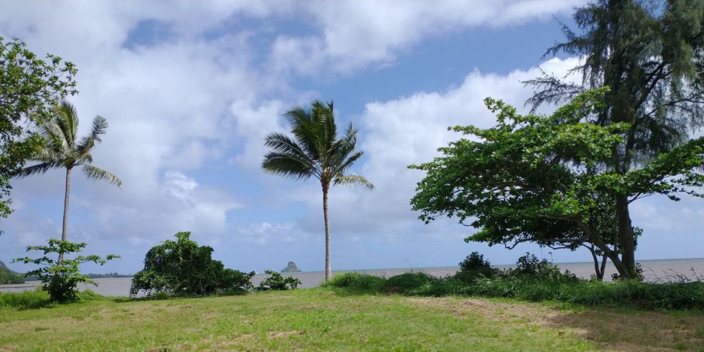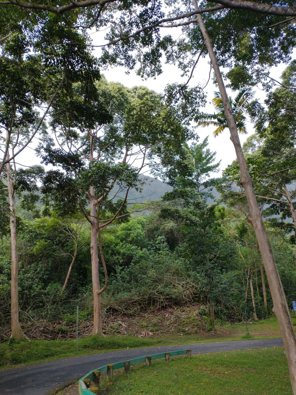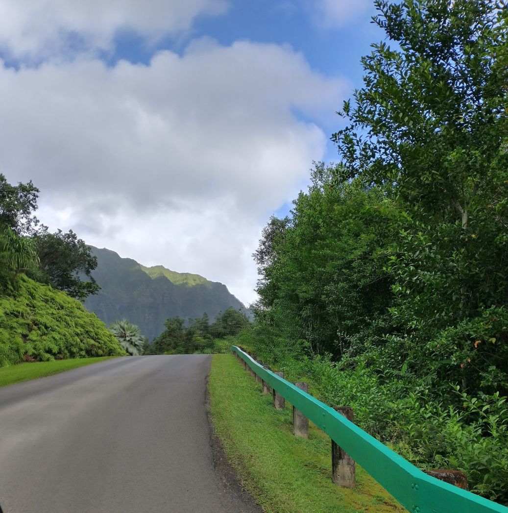 Retrieving the car, we head out to the far end of the park, hoping to walk a little bit more, hopefully on a paved, or at least dry path. The gardens actually have the road closed before the end, so we could only stop in the lot at Kahua Nui for photos.