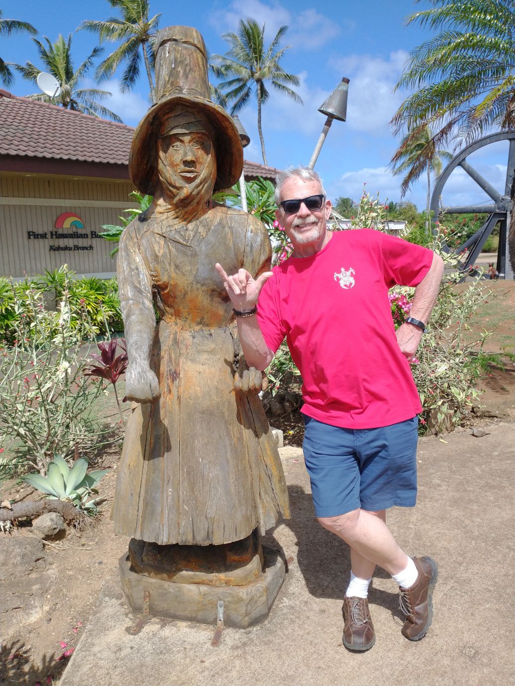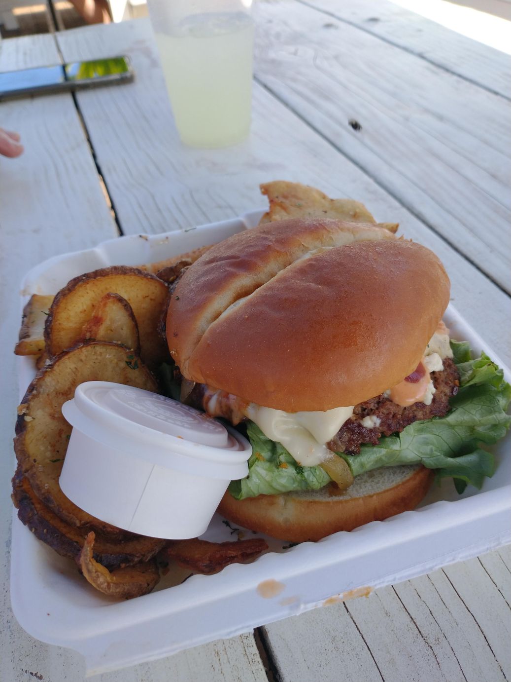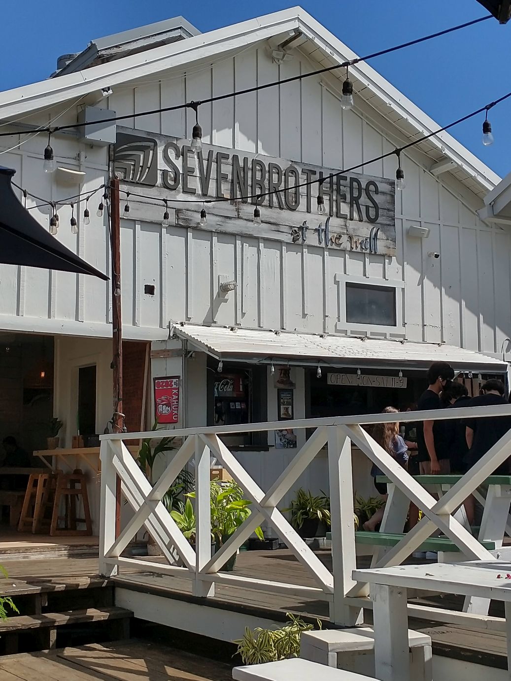 Well, there are plenty of other options. We wander around a bit, looking at the taco place, the poke place that normally opens at 11 (it is 11:30) but isn’t open until 12:30 today (pooh!) and various other things that really don’t strike our fancy. But, as we are heading across the parking lot toward the sugar mill we spy none other than Sevens Brothers!!! No way! Totally cool – it is Seven Brothers at The Mill! Perfect! We order a Deep Blue burger with crumbled blue cheese and bacon for Ed and a Teri Samoa burger dipped in teriyaki with pineapple, bacon and cheese on top. Decadent! But oh so very good!