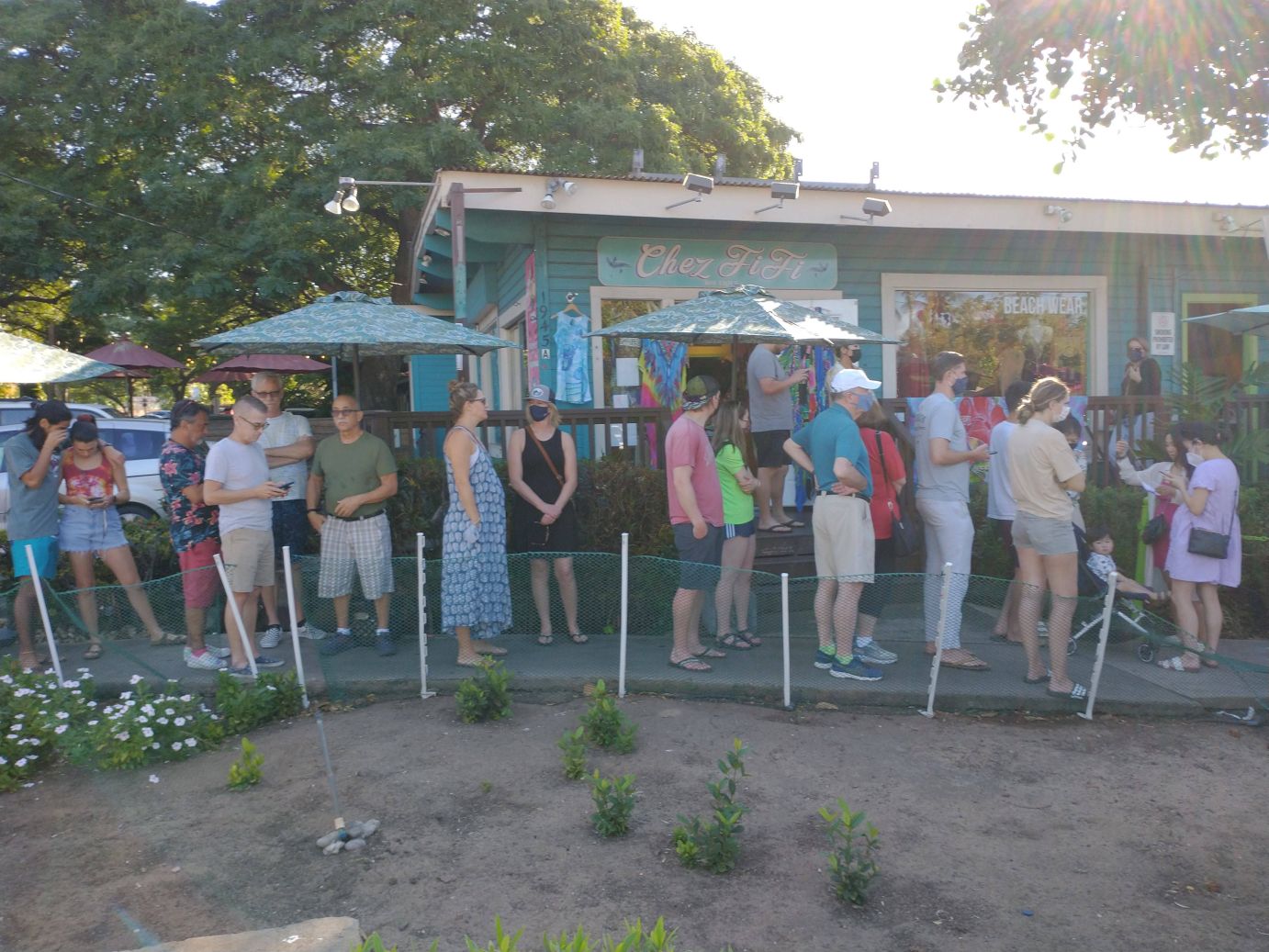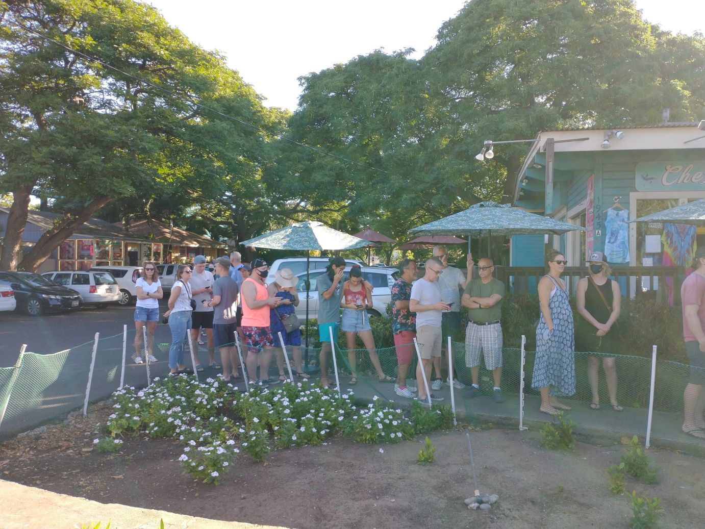 We manage to make the circuit, then stop at Foodland just to scope out any extras we may need, ending up with some garlic and soy sauce – garlic for the shrimp we got on special at Safeway and soy sauce for the poke. We strategize sauces for the Kalua pork, but figure we’ll wait to see what we think we need later. Then it is back out on the sidewalk heading home…and oh my God! There is a line at Kihei Caffe that stretches into the parking lot all the way back to Three’s restaurant. For breakfast? At the diner? Where seriously, there isn’t anything special, just typical breakfast diner food? We are honestly dumbfounded. Virtually all of these people are staying in condos with full kitchens. Going out for breakfast is fine, for sure, but to stand in line for an hour and a half or longer when cooking in is so simple? Dunno about that. We have to take a picture. What can I say???