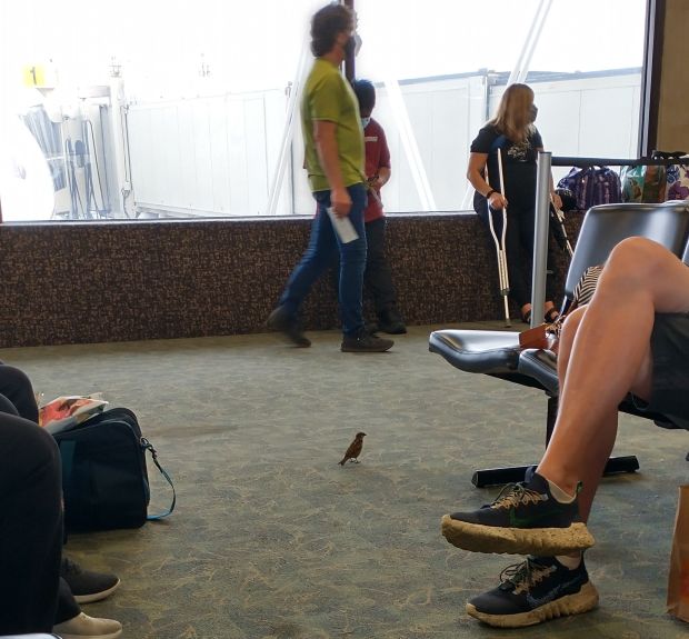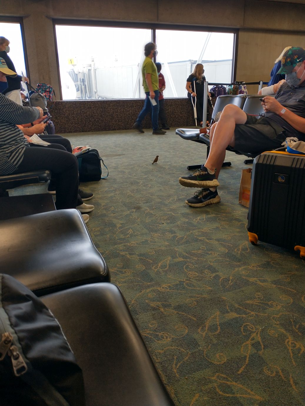Finally we can head to the gate, where stop at the restrooms to change into our winter gear (we both had on summer gear – shorts for Ed, sundress for me – so we wouldn’t overheat and sweat out our traveling clothes), then it is onto the actual gate where we hang out with a bird (yes, a bird – everything is open air here!) before boarding our Red-Eye to Chicago.