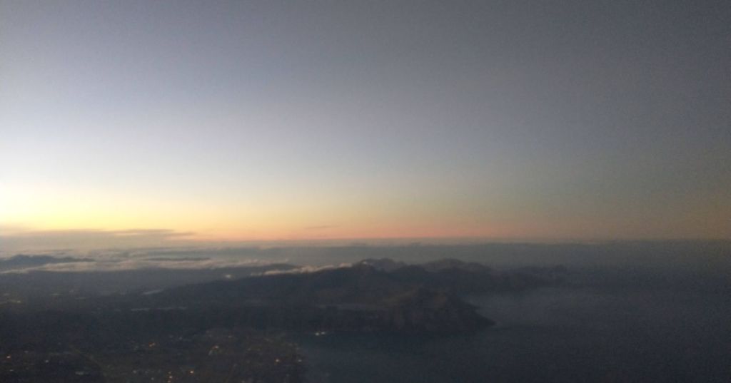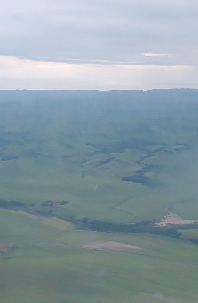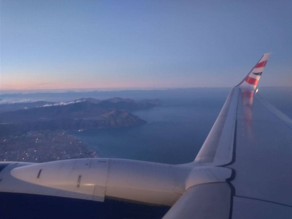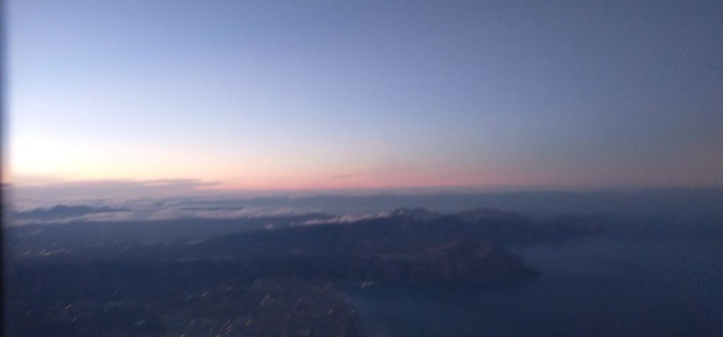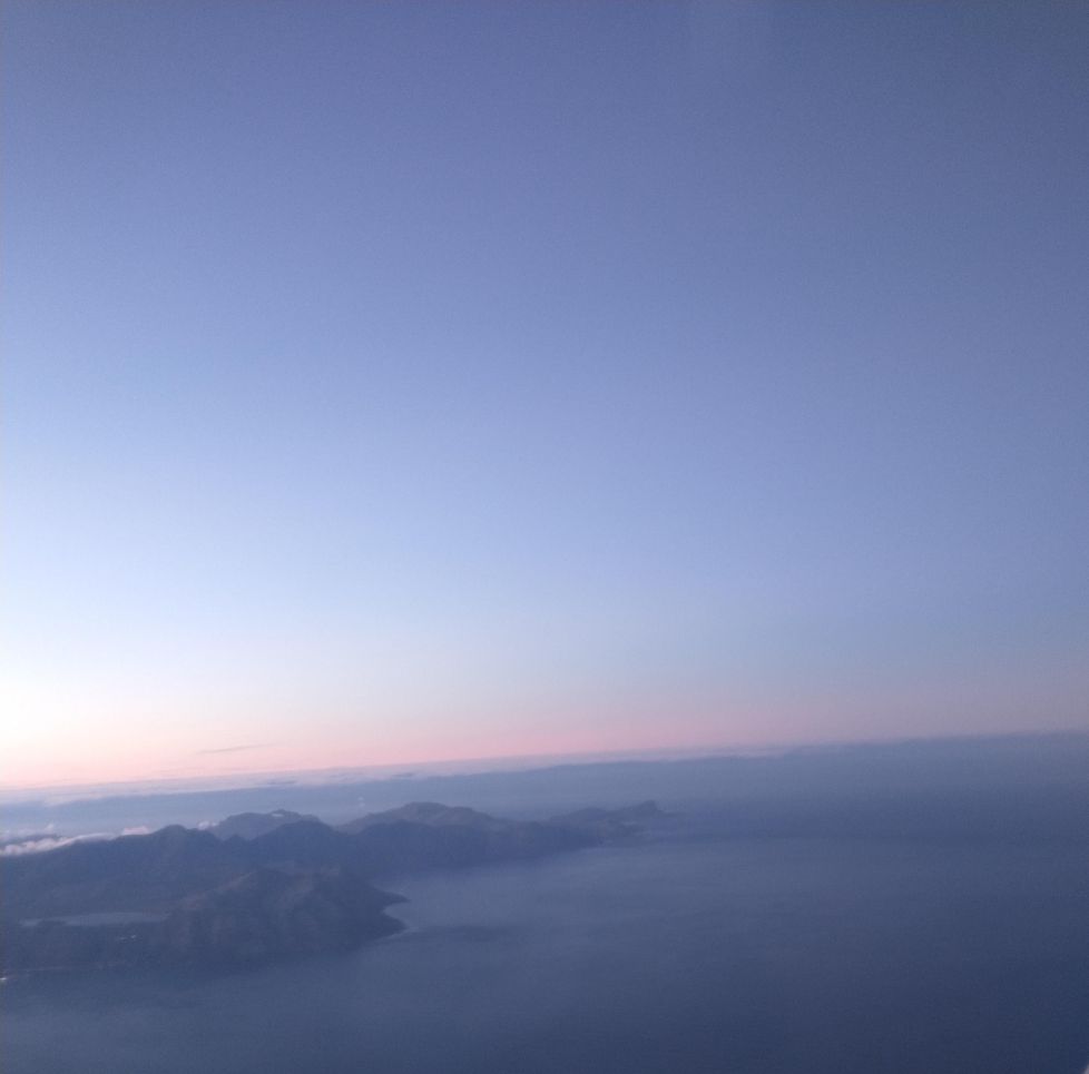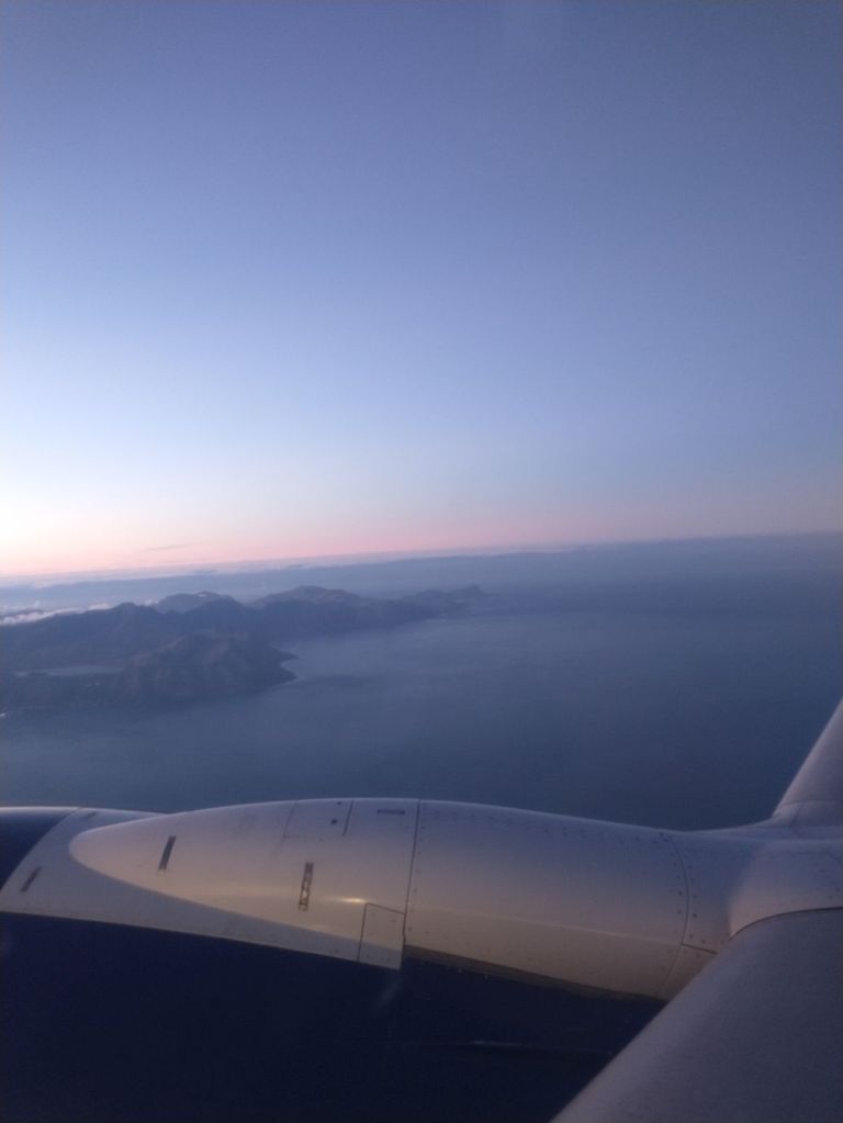 Pat, Ed and I and jumping out of our skins, this is so against our nature not to scrum the minute the flight is called, but we obediently listen to Charl and it does all work out fine. Especially since we have to take a bus to the plane! Michelle is sitting next to us in our row, and we spend most of the flight getting to know each other better and alternately snapping photos out the window! It’s a gorgeous sunrise!