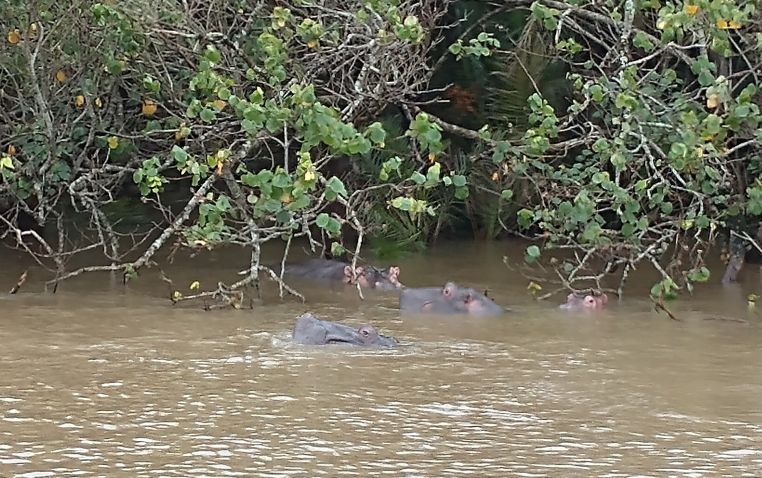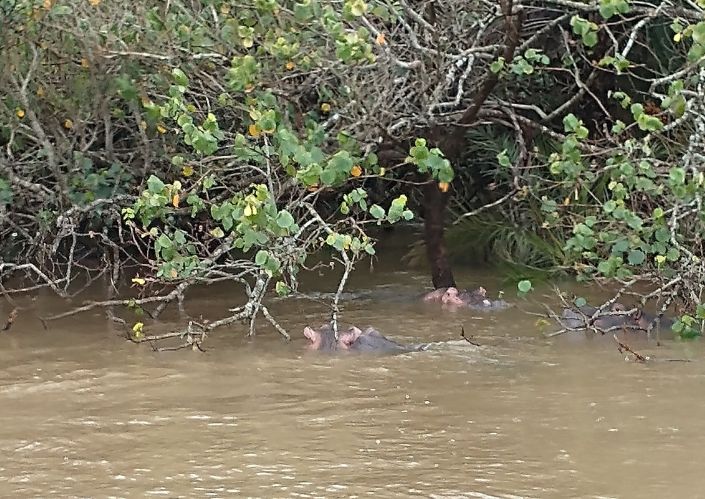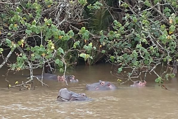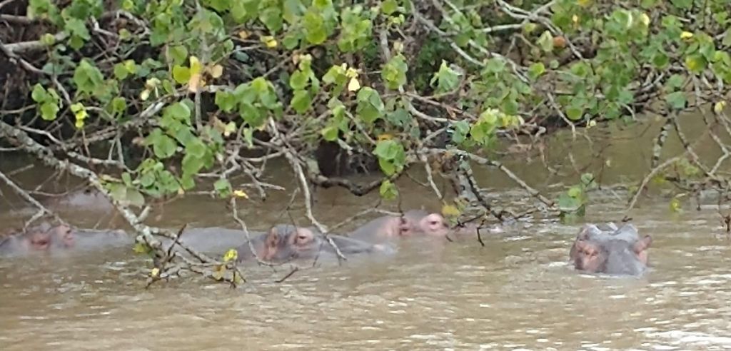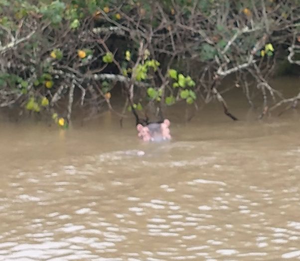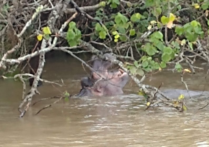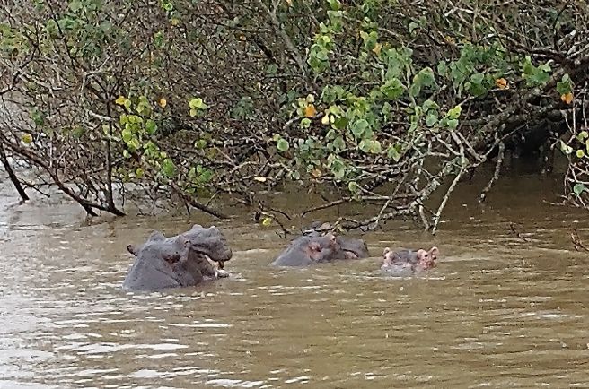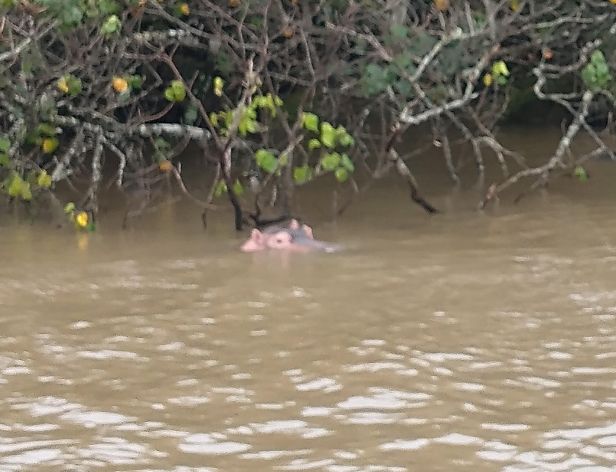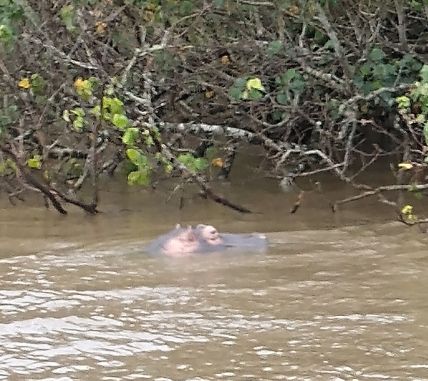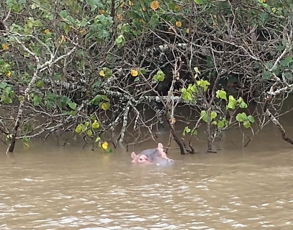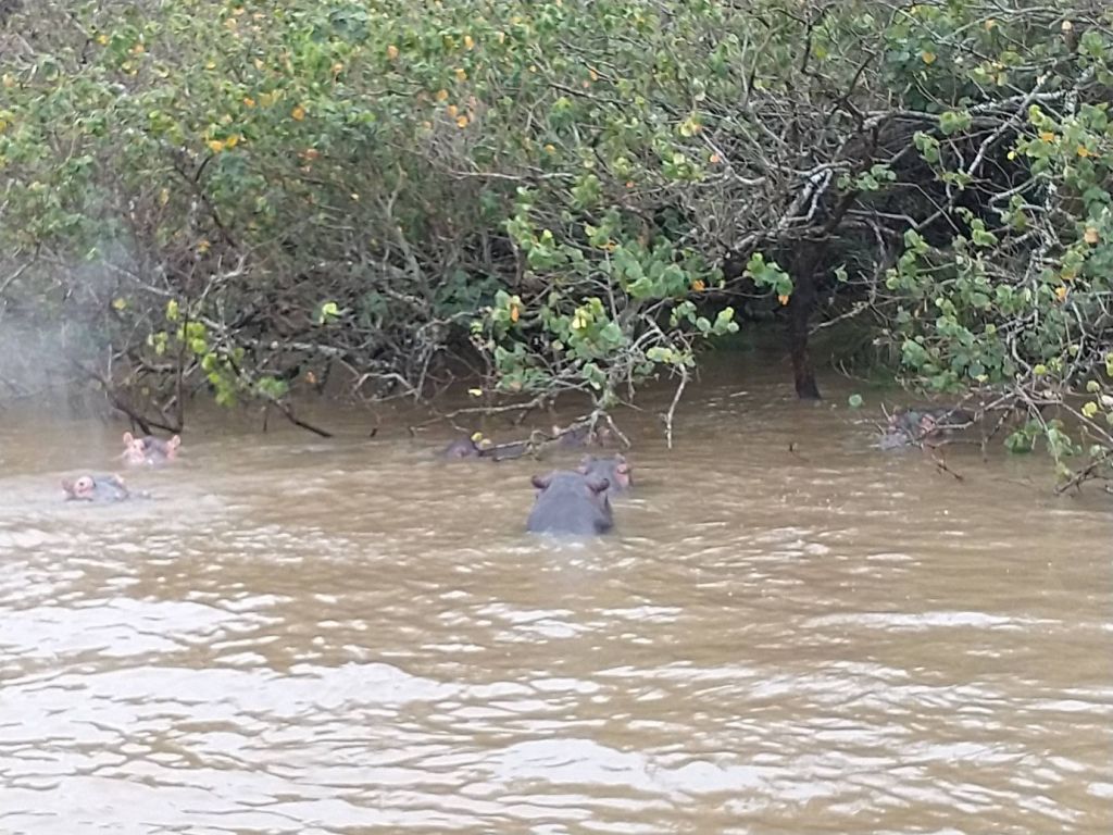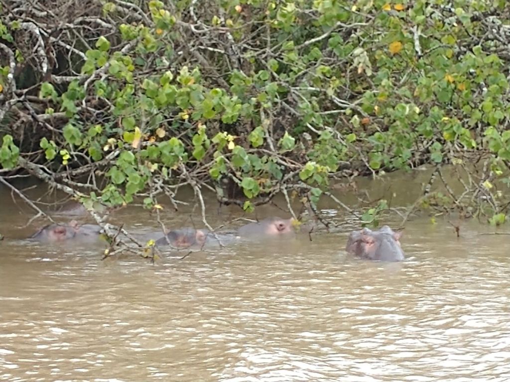 Jumping aboard the boat, we all snag seats downstairs, undercover and out of the rain. From here we spend a lovely hour and a half just gliding through the lake, searching the coastline for hippos. They are shy little (or I guess I should say big!) guys, but we manage to spot a few groups of them under the bushes that drape over the lake shores. Totally fun! Our first game sighting (penguins don’t count!!!).
