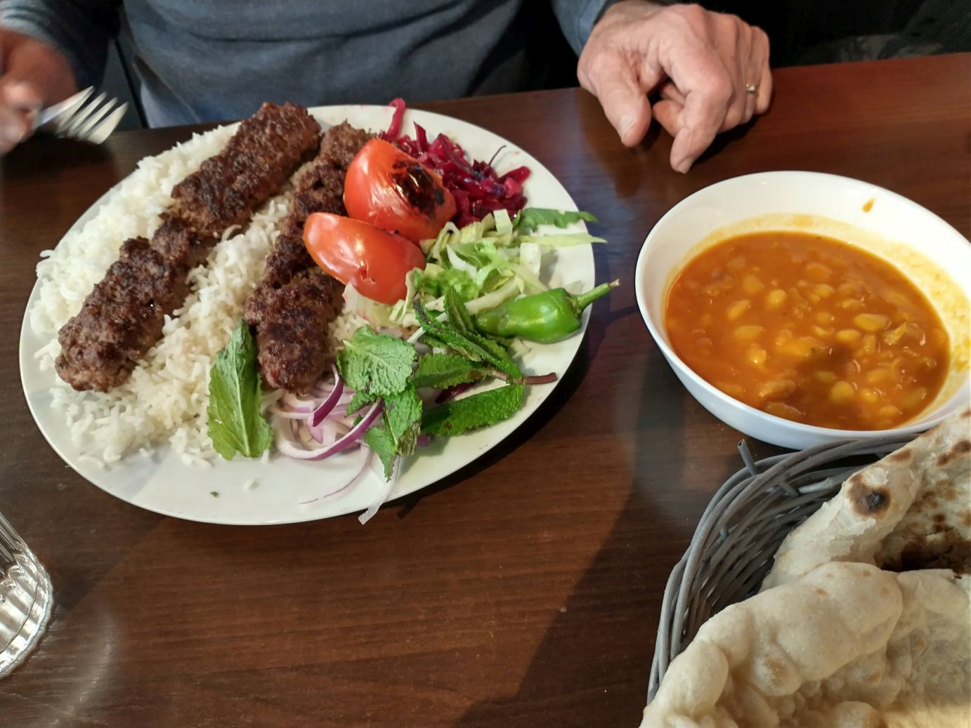 As it turns out, one of the best meals and experiences we could have. First of all, it is sort of an open kitchen and we can watch the chef (an older Iranian man) making everything, including the awesome pita bread! We order a shwarma pita (the last one!!!) and a kebob platter – both come with soup (which is surprisingly good chickpea soup, I think – and if I say its good, then you know it is – because I’m not a chickpea fan) and these huge pita breads. Oh my gosh. It is wonderful. As we sit there happily eating, people start to wander in – and every one of them is Iranian or least Persian of some sort, which makes us feel much better about our choice.