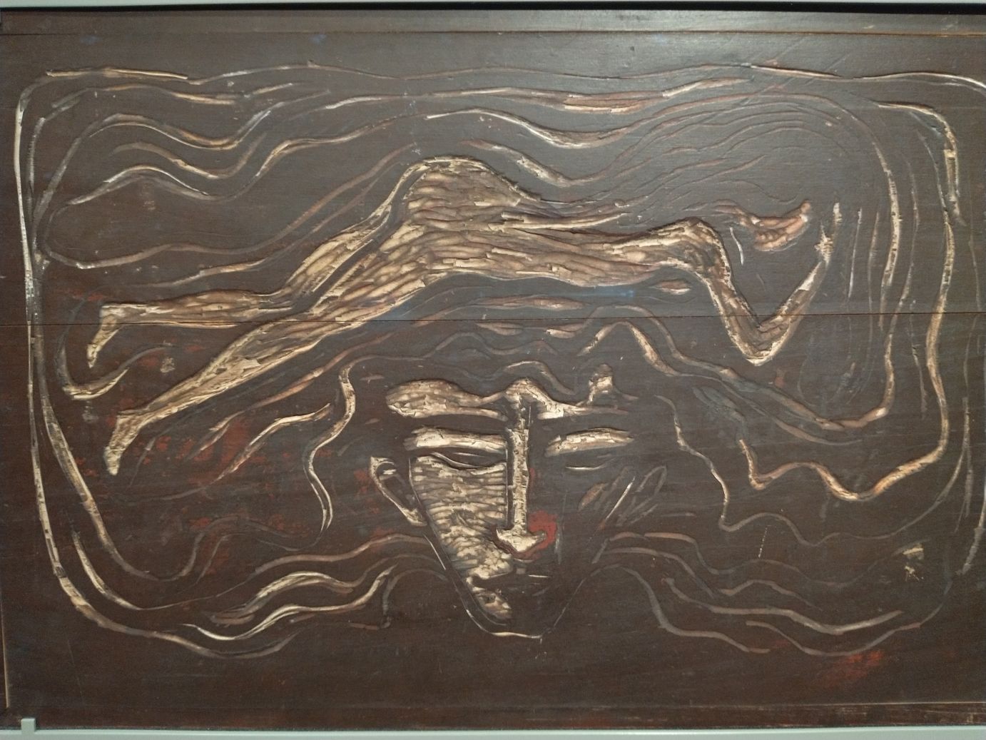 And, upstairs in that viewing area room there are also wood carving sketches. These are wood carving templates from his work which are oddly fascinating – for the technique as well as the subjects. Less graphic examples are actually carved into tables where you can take a sheet of paper and rub wax crayons over the surface to reproduce the carving in relief. Which we do – and now have a lovely little handmade souvenir to take home.