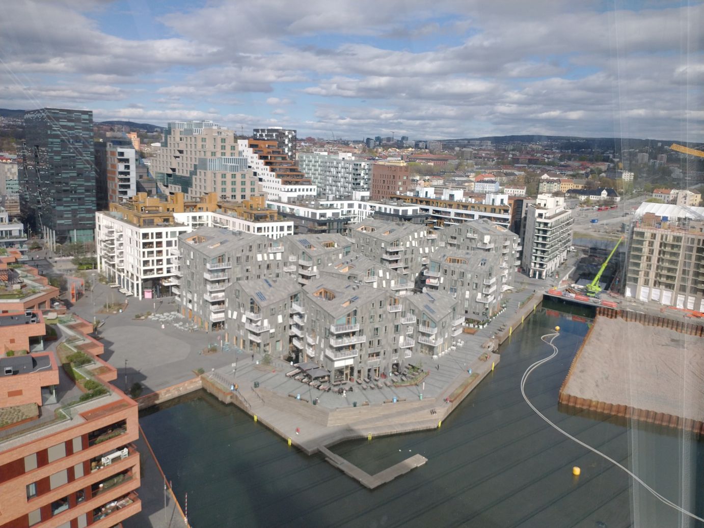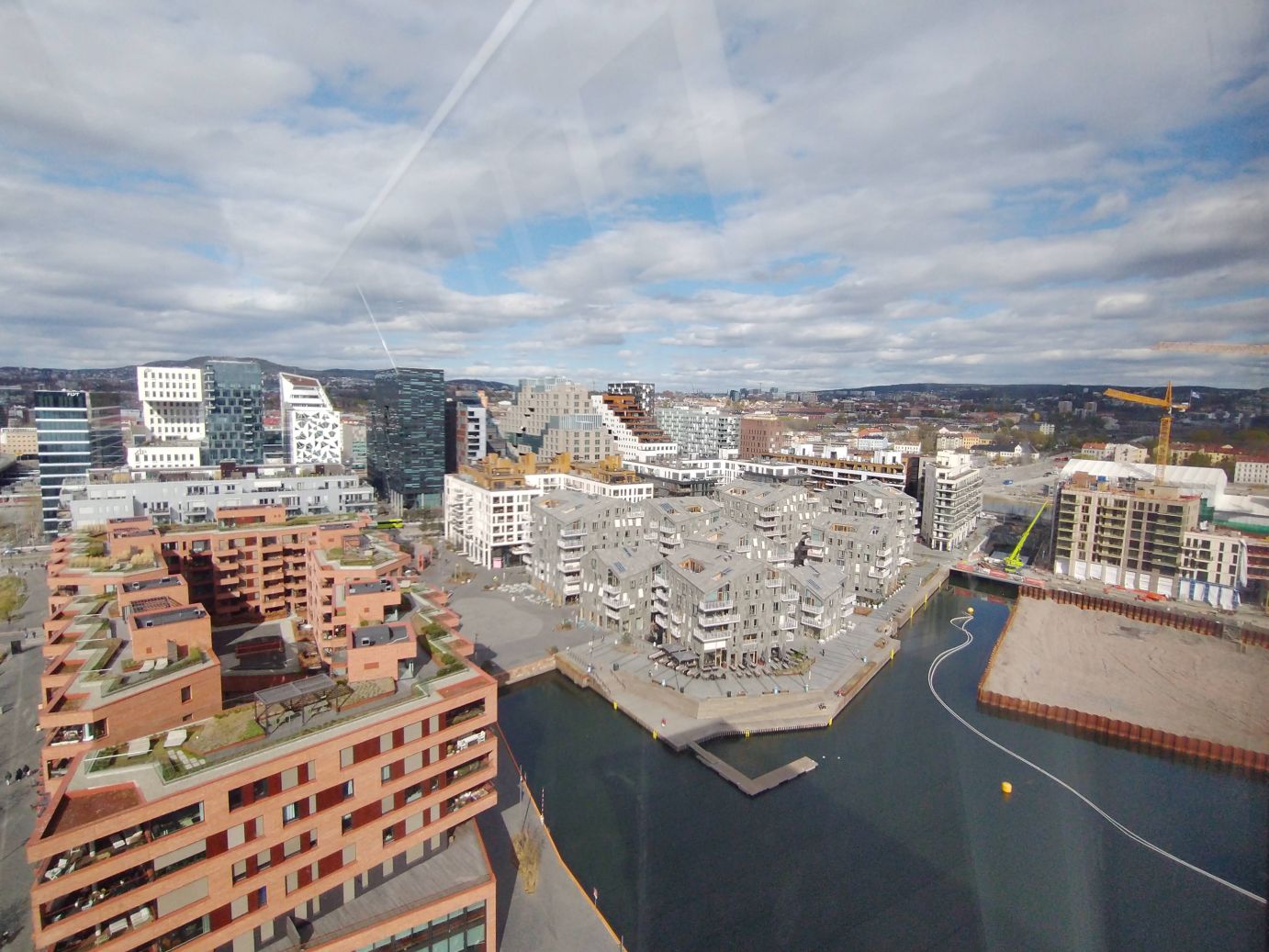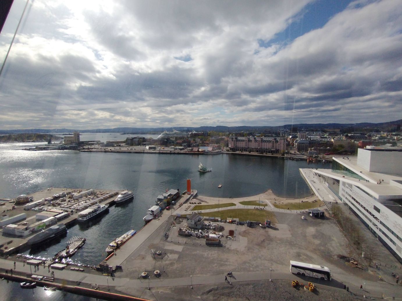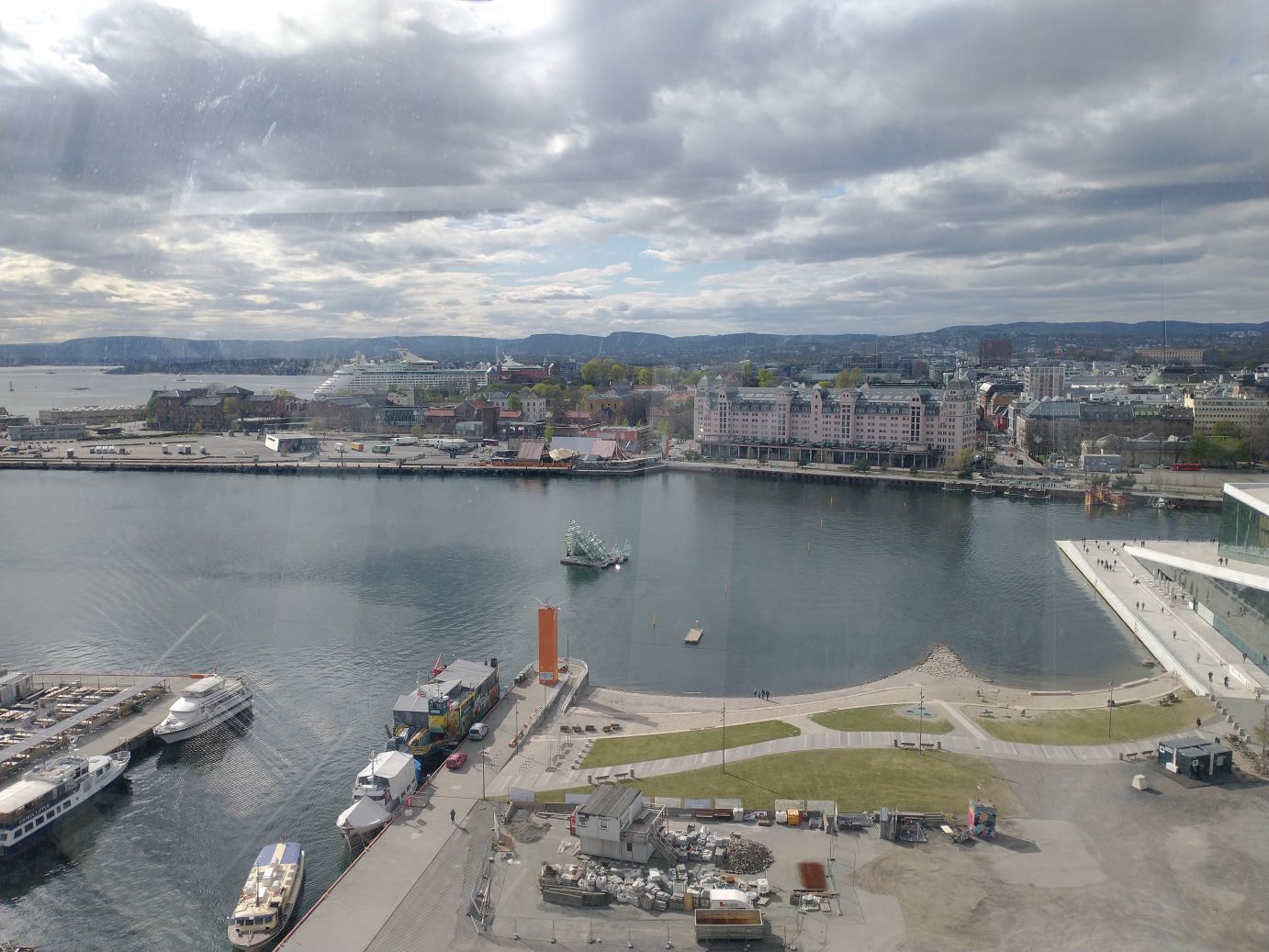 Then it is up to the rooftop bar which is sadly not open. We were hoping for an afternoon aperitif overlooking the city, but have to settle with just overlooking the city. All in all, not too much of a hardship. The views from up here are spectacular. The harborside with all its development, past the harbor out to the sprawling suburbs and mountains behind, and down in the harbor itself, that cool glass ship reproduction we saw from sea level on the way over.