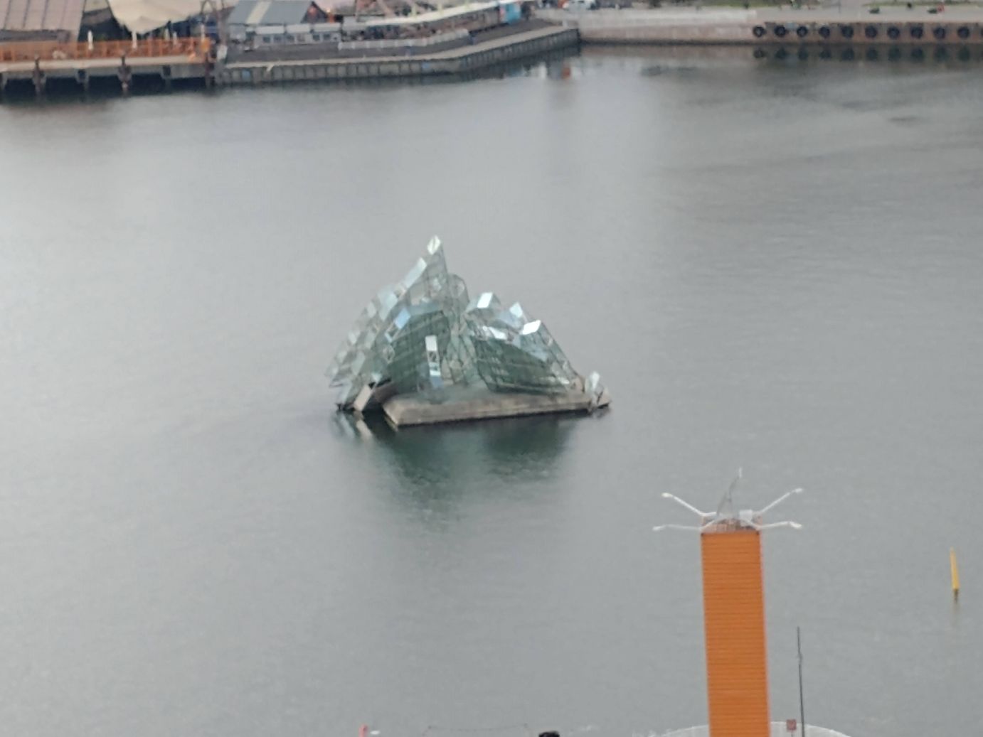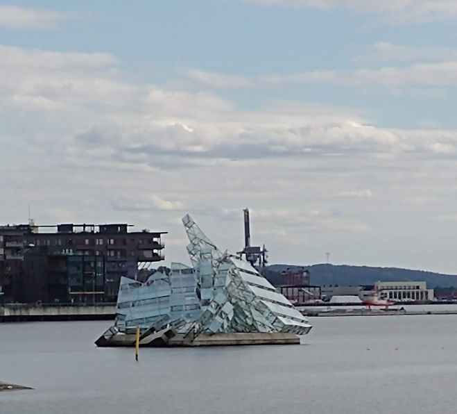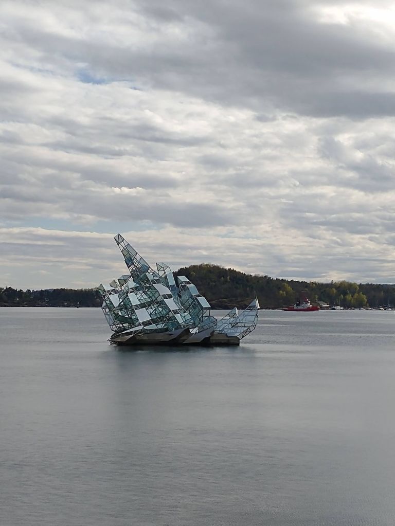 After The Scream, it is time to head home, and we do, walking along the harbor once again, taking more pictures of the glass boat in the water. The light is perfect for picture taking – and we decide it is a sinking boat, symbolic of….what? We don’t know. But that is our opinion.