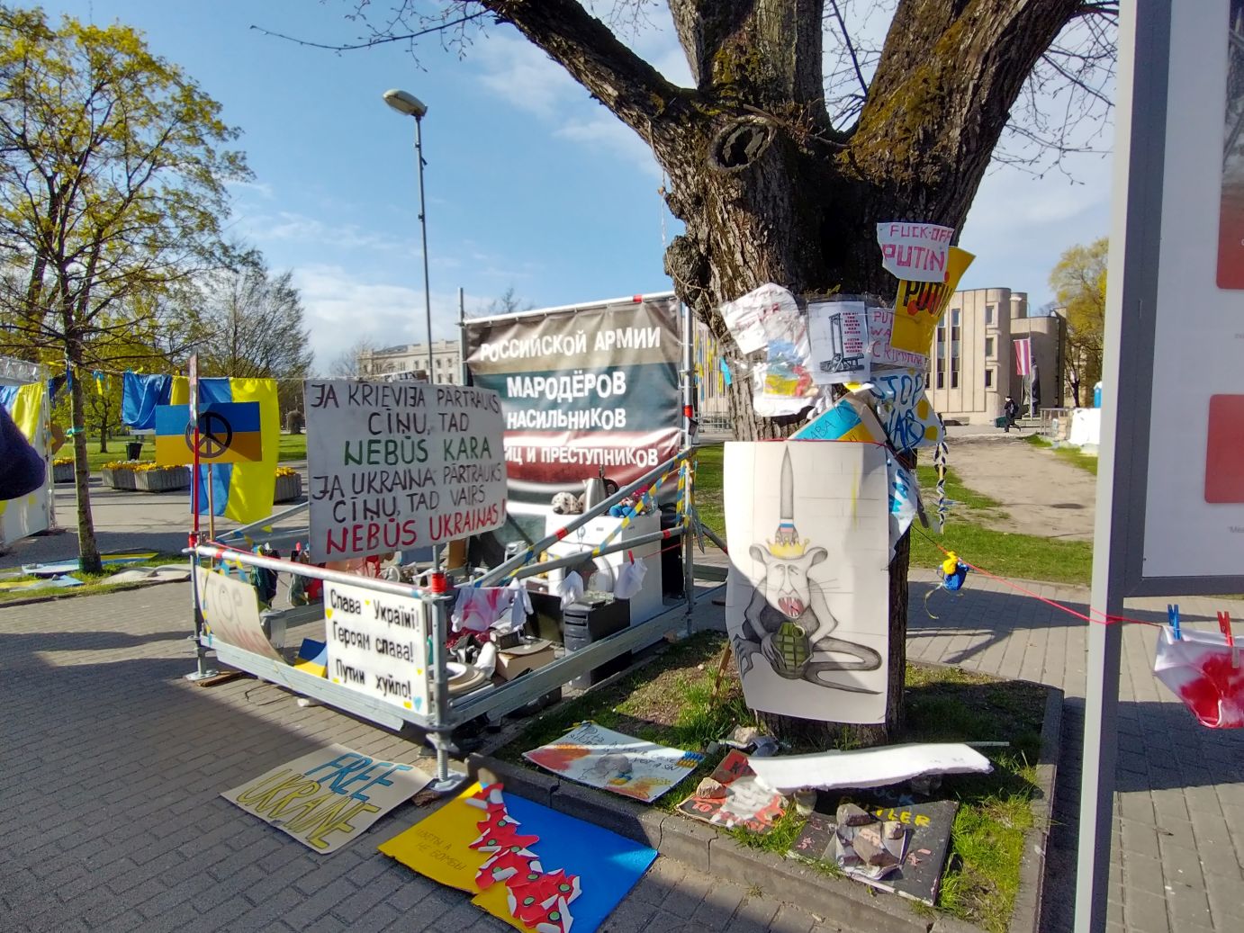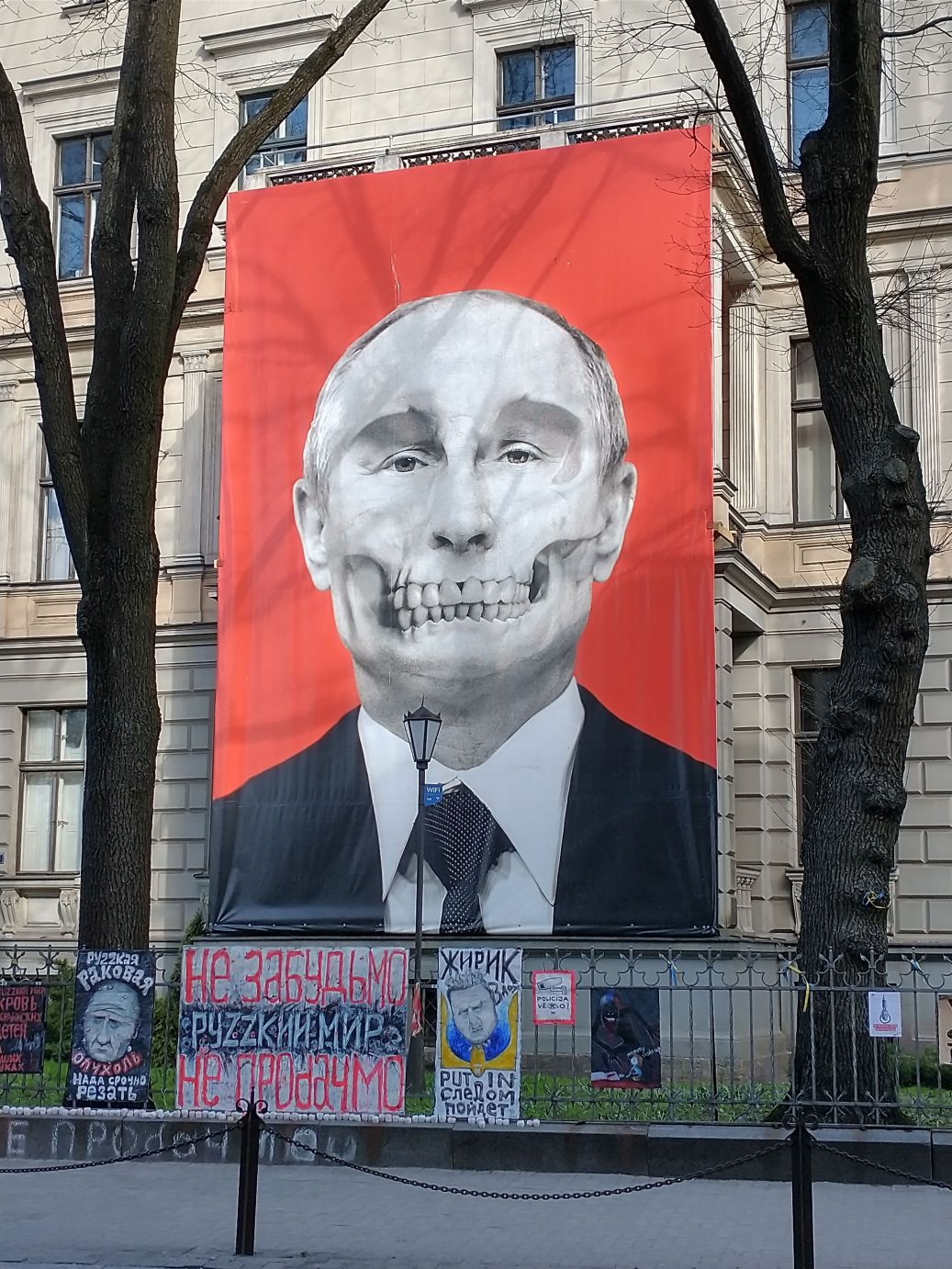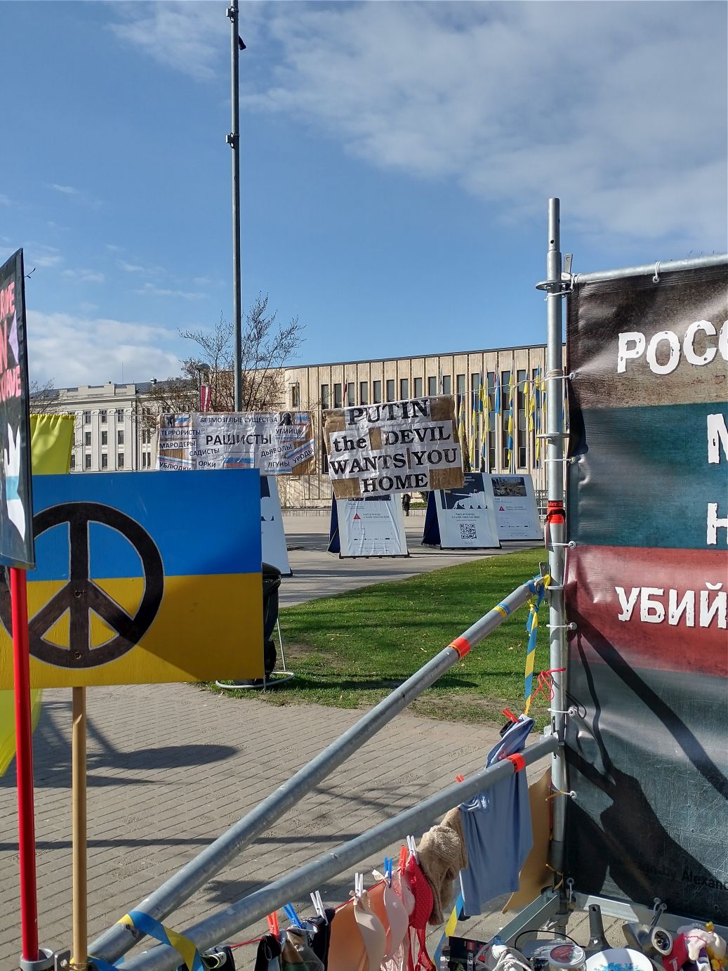 This part of our walk finished up near the Russian Embassy, where across the street, on the side of the Medicine history museum was this amazing poster protesting against Russia and Putin. And right across the main street, on the grounds of the Congress Center, were tons more Ukrainian support and Russian protest signs,