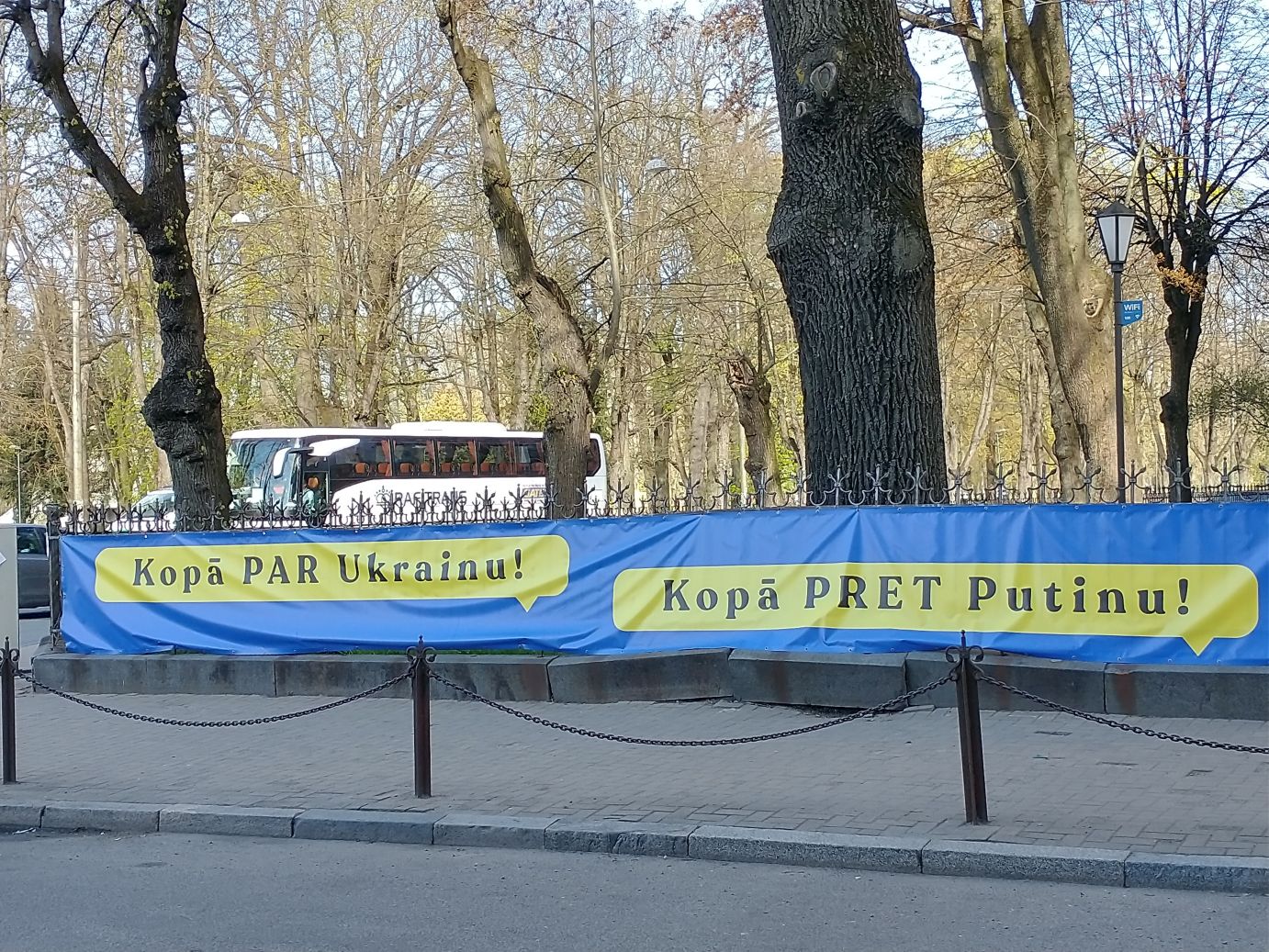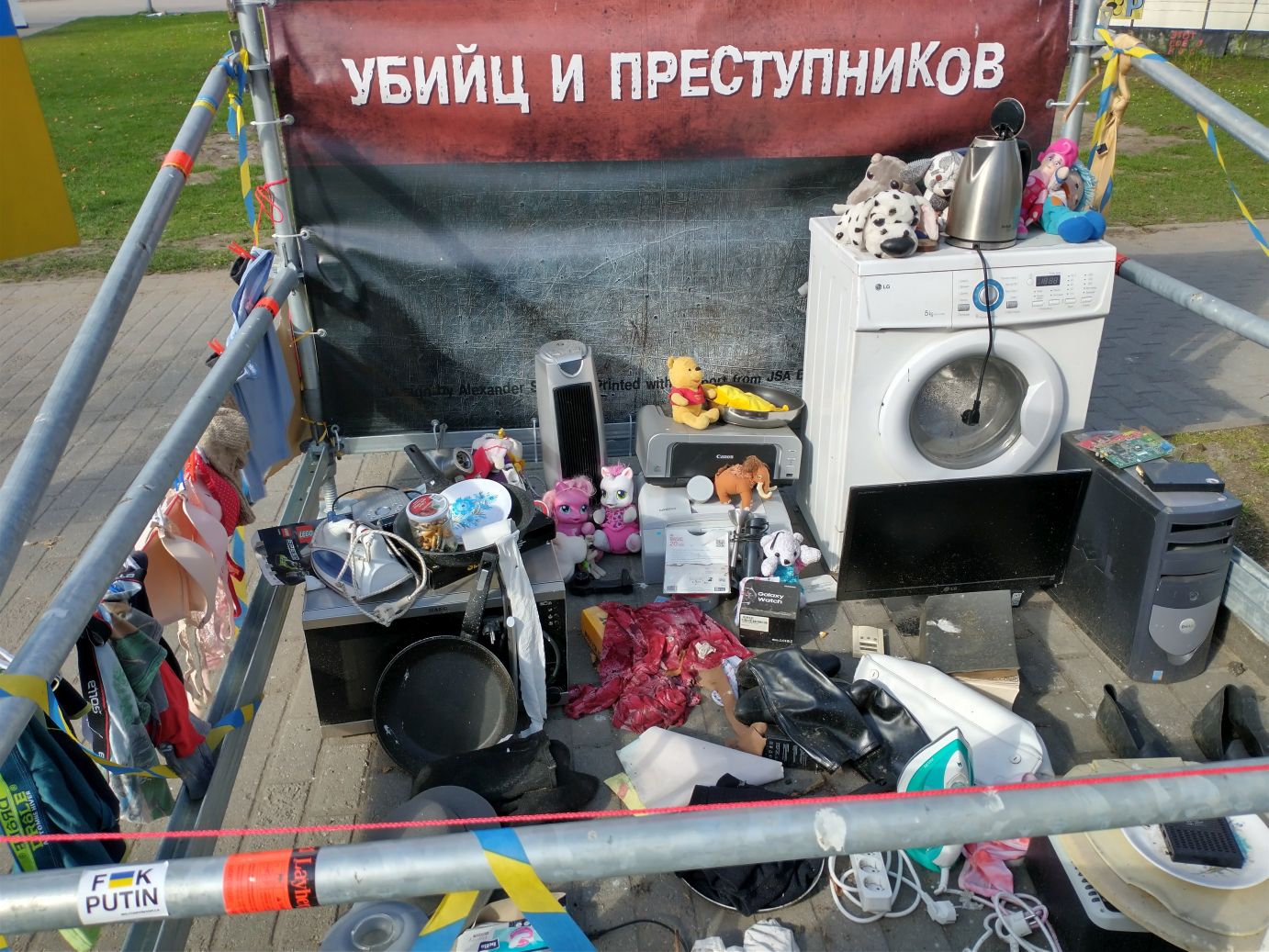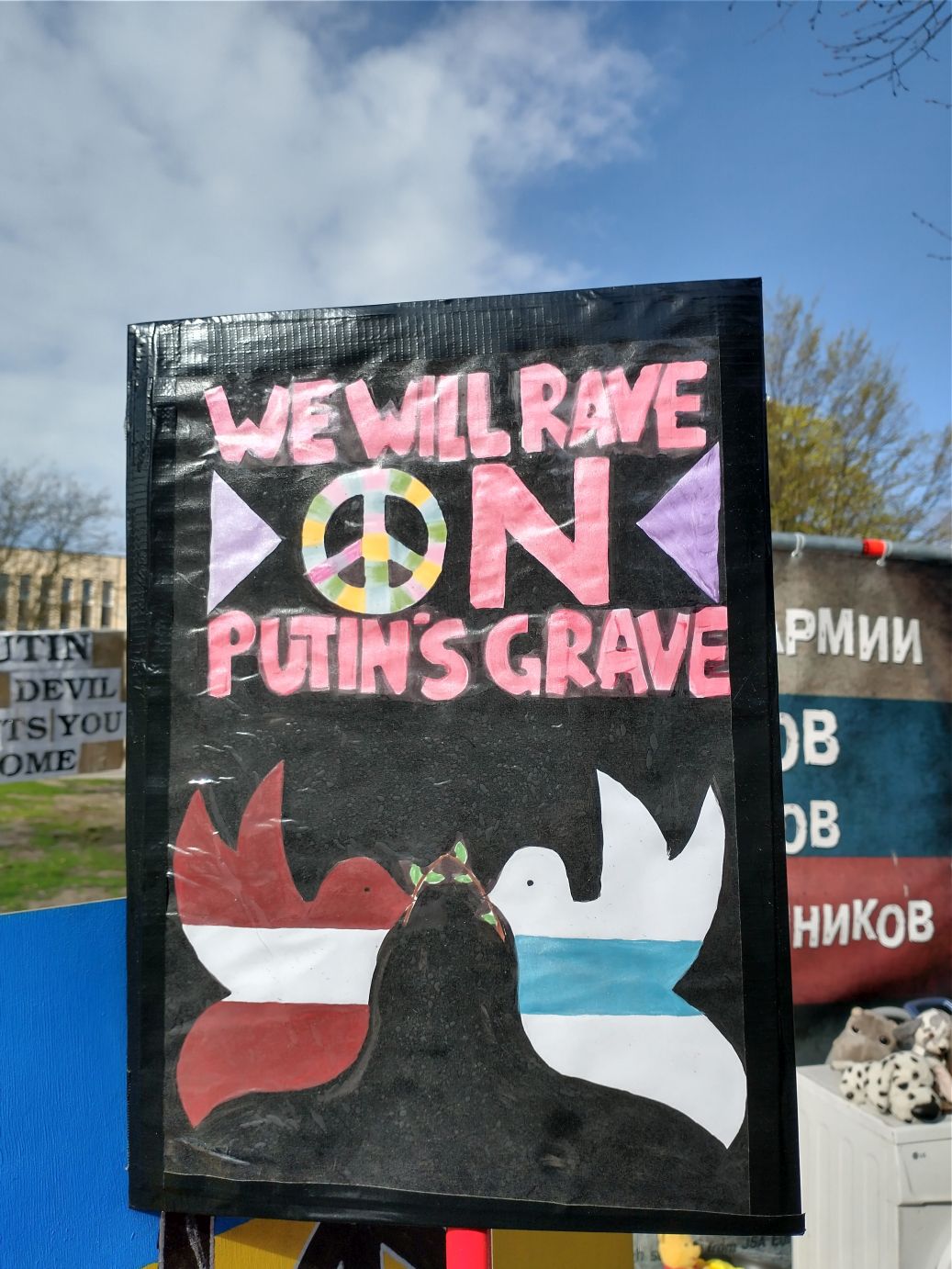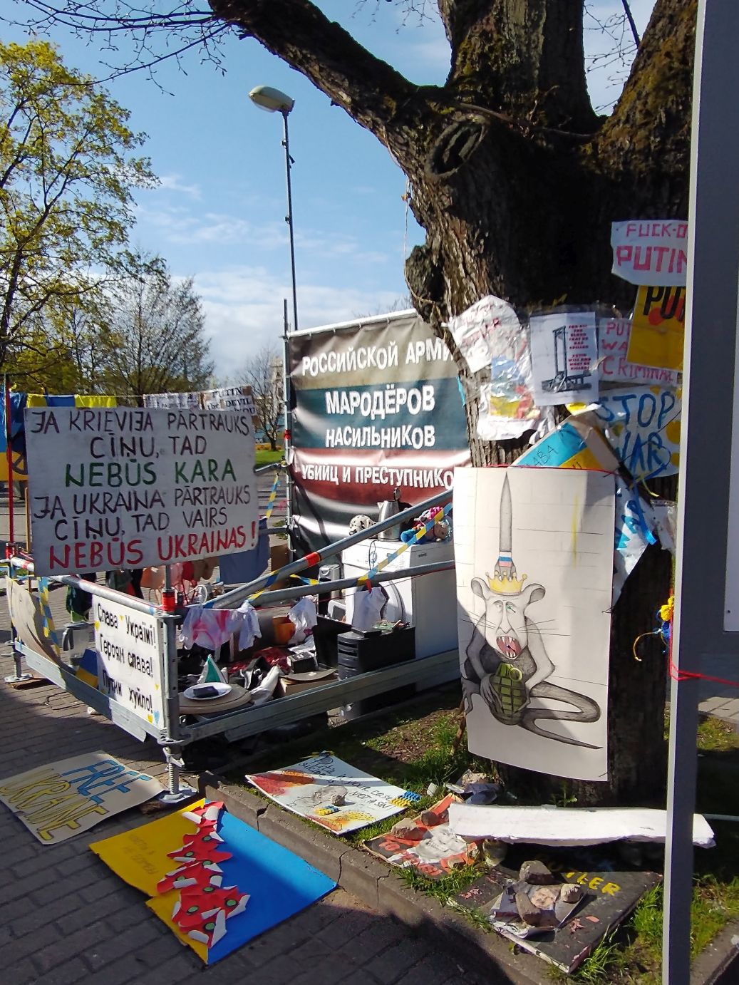 This part of our walk finished up near the Russian Embassy, where across the street, on the side of the Medicine history museum was this amazing poster protesting against Russia and Putin. And right across the main street, on the grounds of the Congress Center, were tons more Ukrainian support and Russian protest signs,
