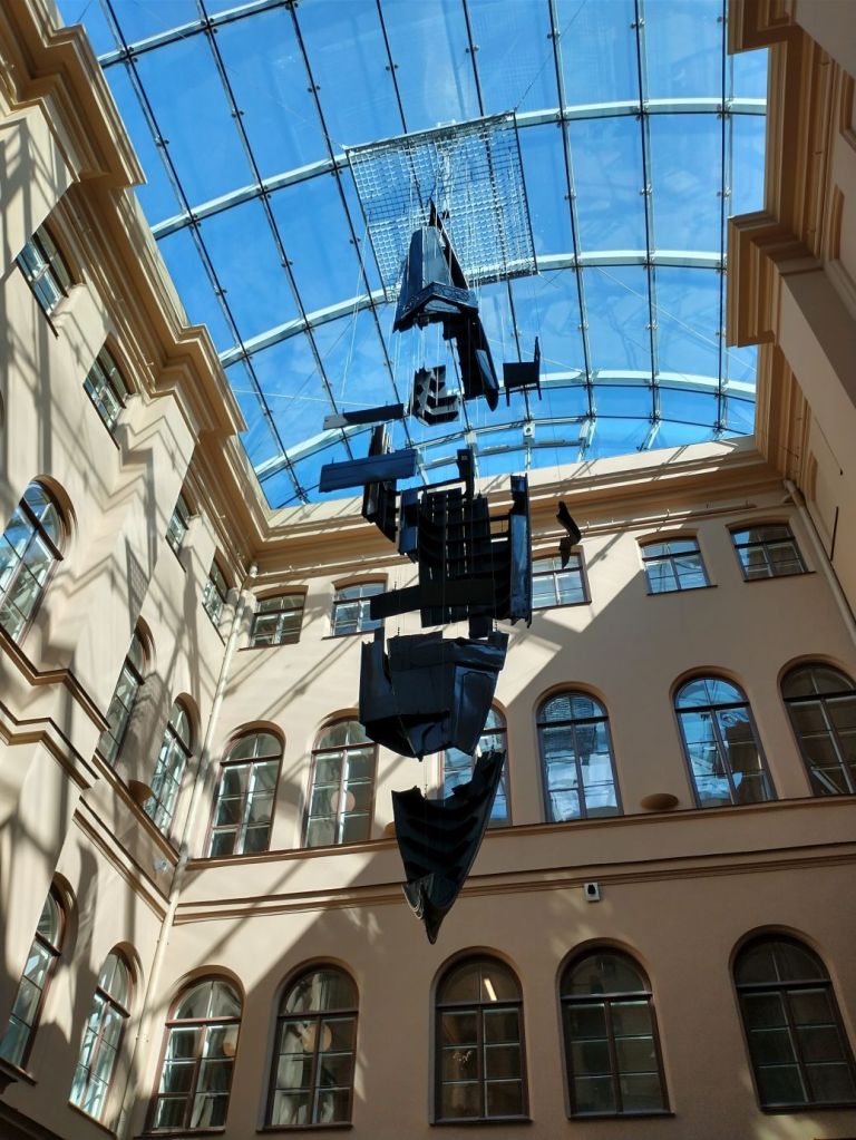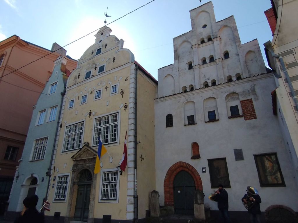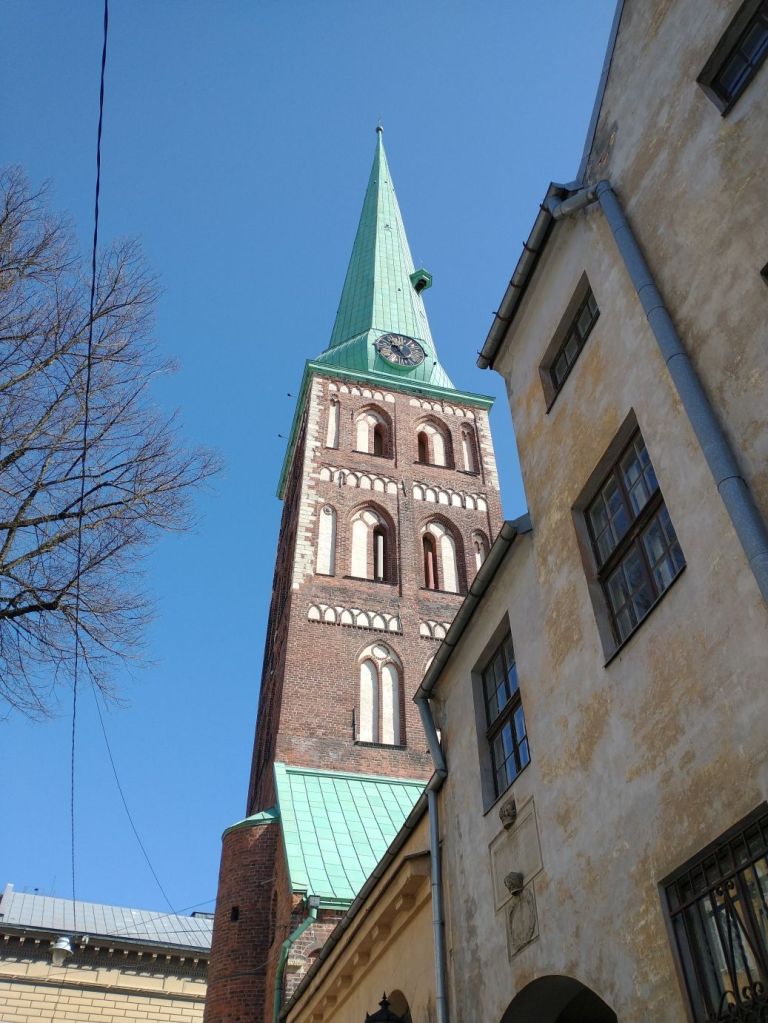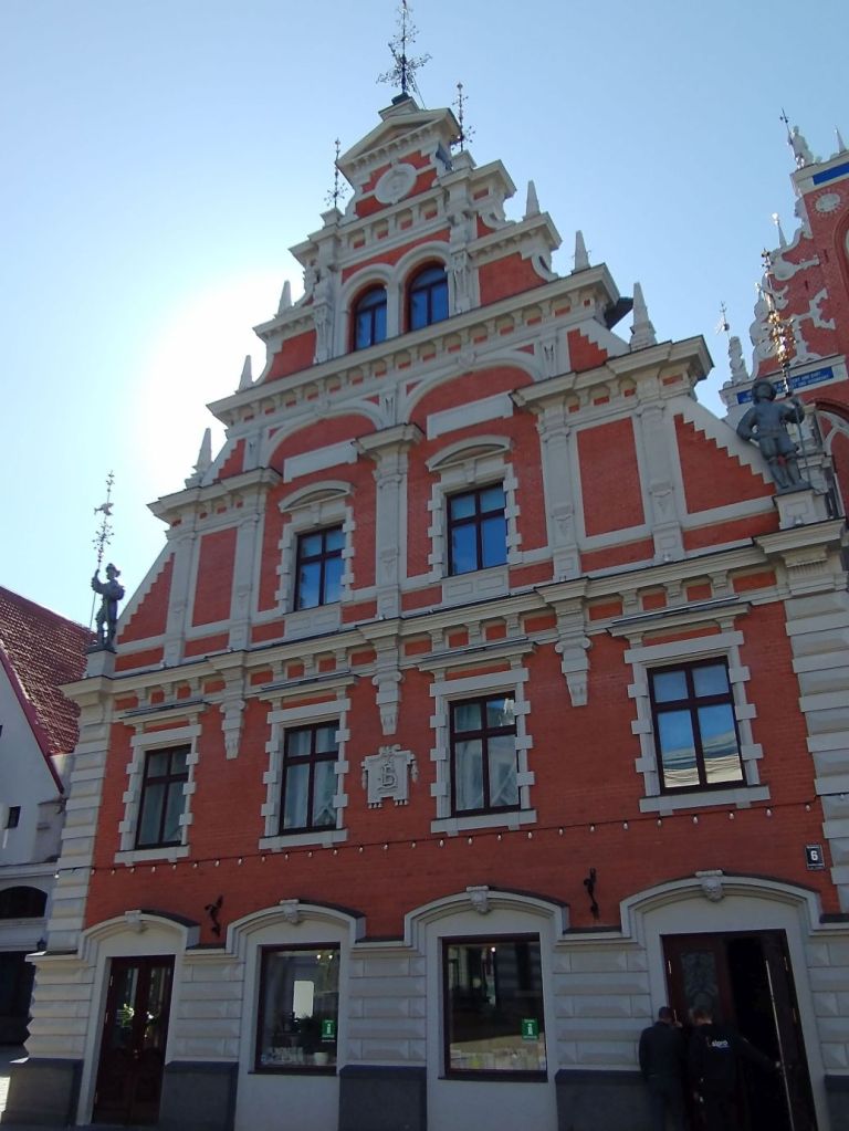 …then back to the House of Blackheads to complete our tour in the old town, stopping at the Riga Cathedral, the Art Museum, with the intriguing sculpture hanging in the lobby, for a rest stop, then onto to the Three Brothers houses, the oldest structures in Riga, past St. Jacob Catholic Cathedral with the impressive spire towering over everything,