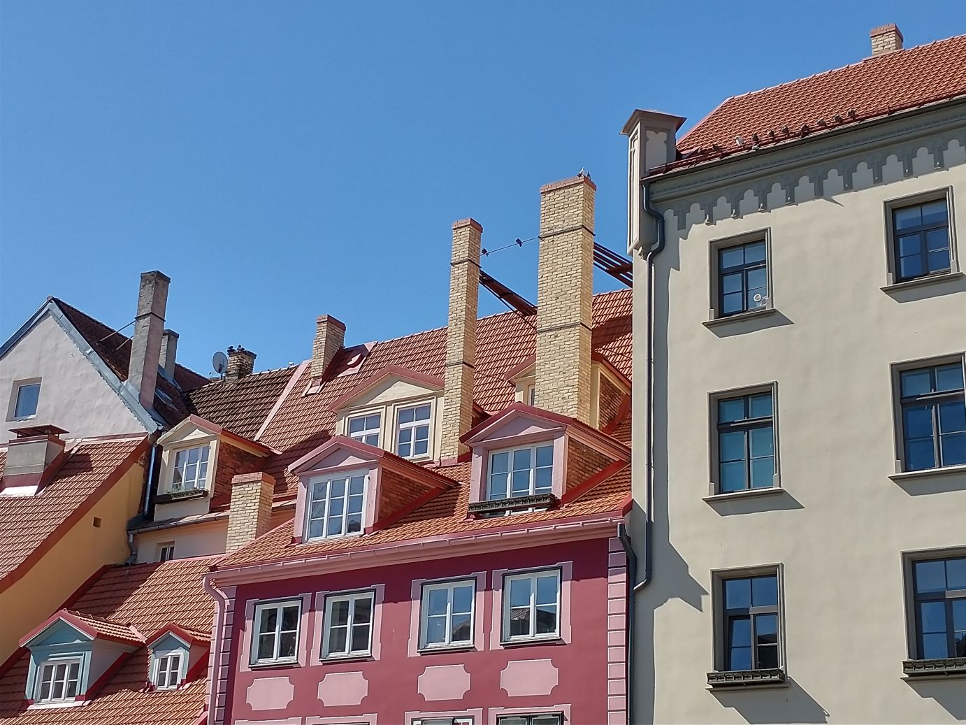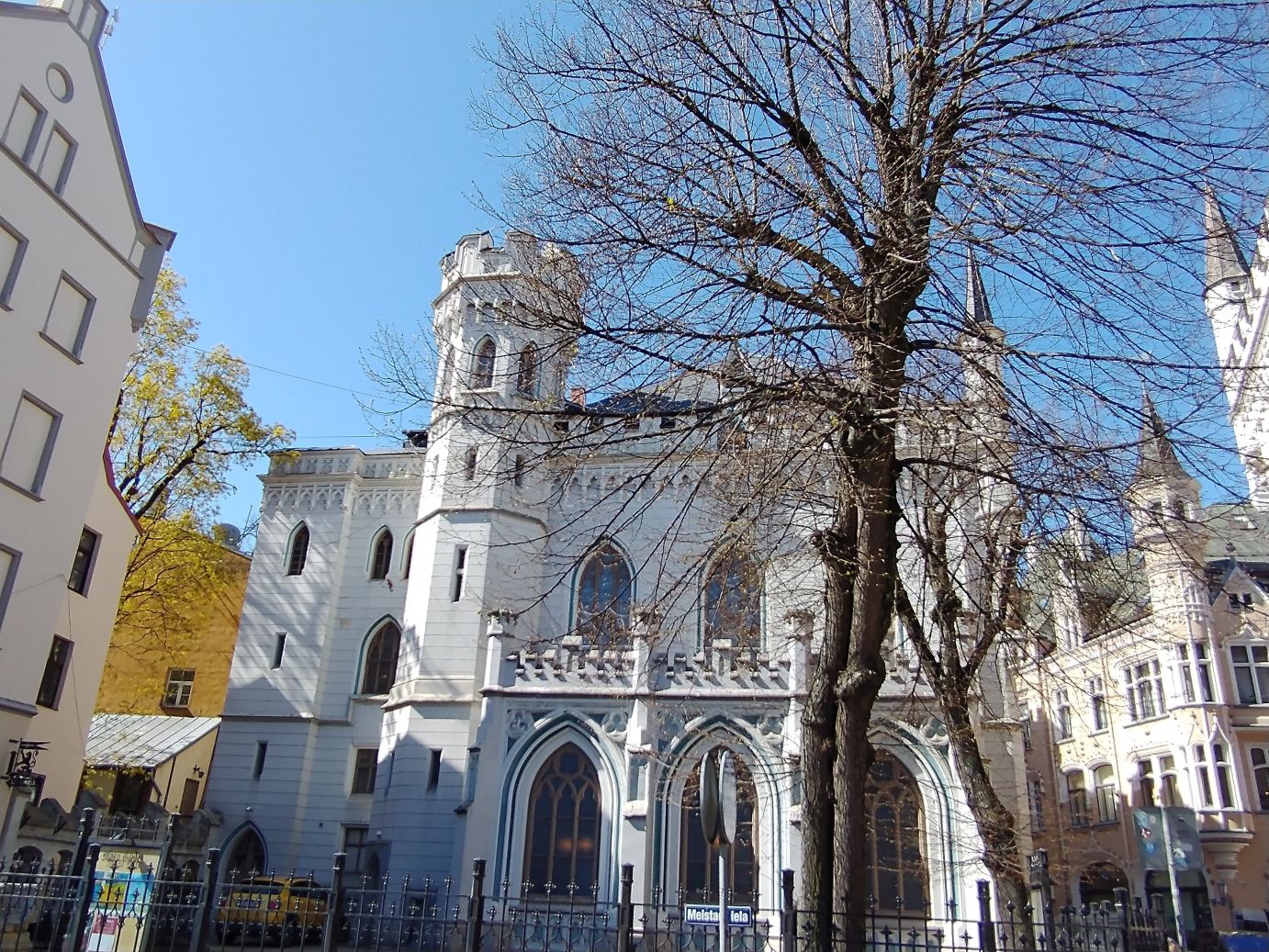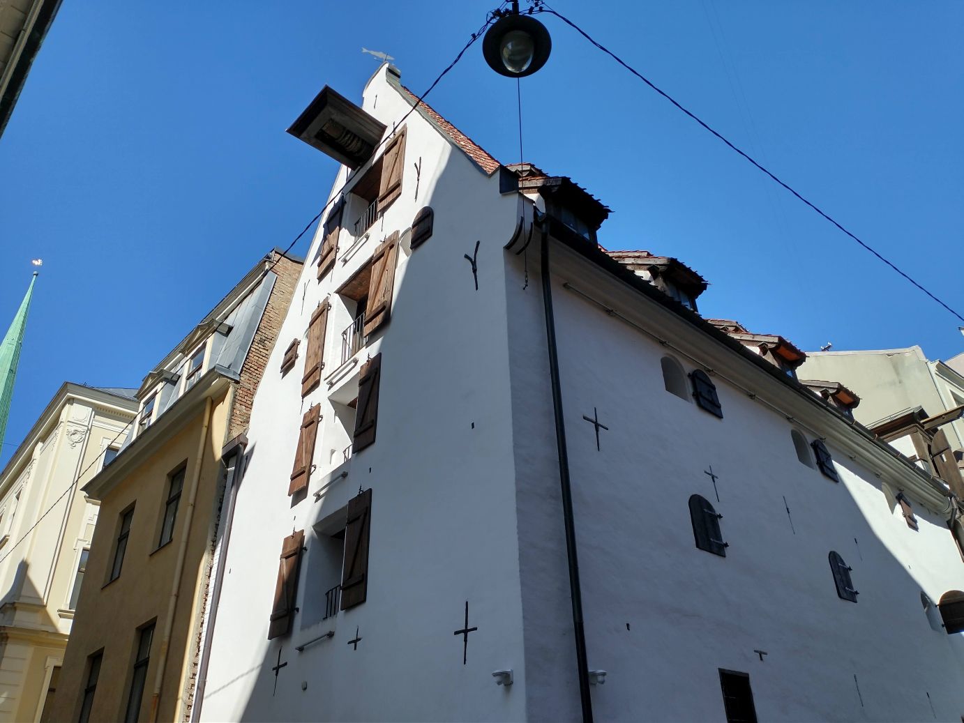 …then back to the House of Blackheads to complete our tour in the old town, stopping at the Riga Cathedral, the Art Museum, with the intriguing sculpture hanging in the lobby, for a rest stop, then onto to the Three Brothers houses, the oldest structures in Riga, past St. Jacob Catholic Cathedral with the impressive spire towering over everything,