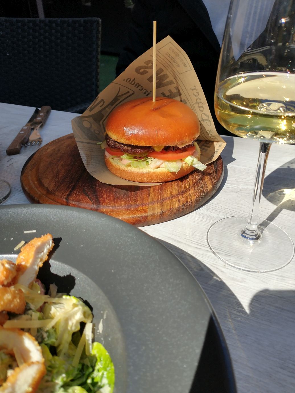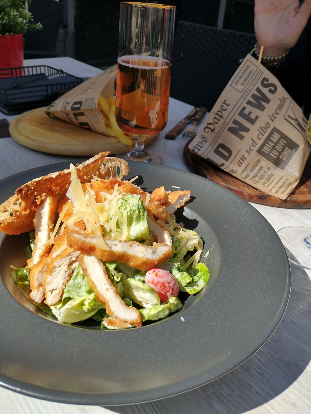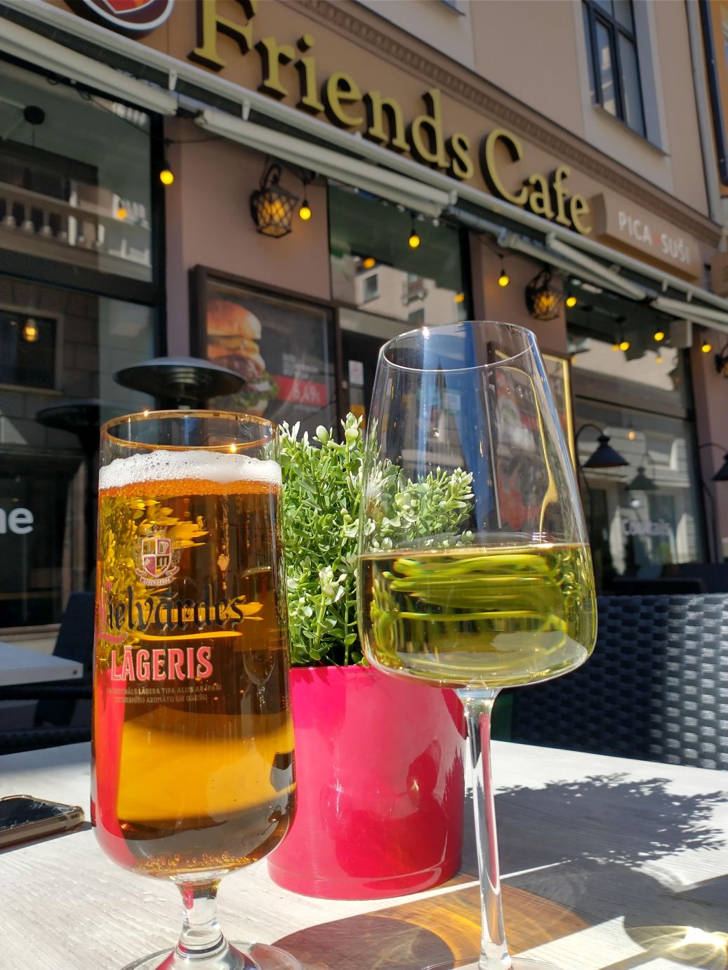 Now that the students are ascending the stairs to these floors, we make our escape, stopping on the first floor for the explanatory exhibits, but quickly heading outside into the fresh air. There was allegedly a photography museum very close to this museum, but we never found it. The maps showed it as right on the corner, but neither GPS was accurate, and we finally gave up in dismay and headed out to lunch, settling on a cute restaurant we had passed earlier called Friends Cafe. Here we spent a pleasant time snacking on chicken Caesar salad, a burger and wine and beer, of course!