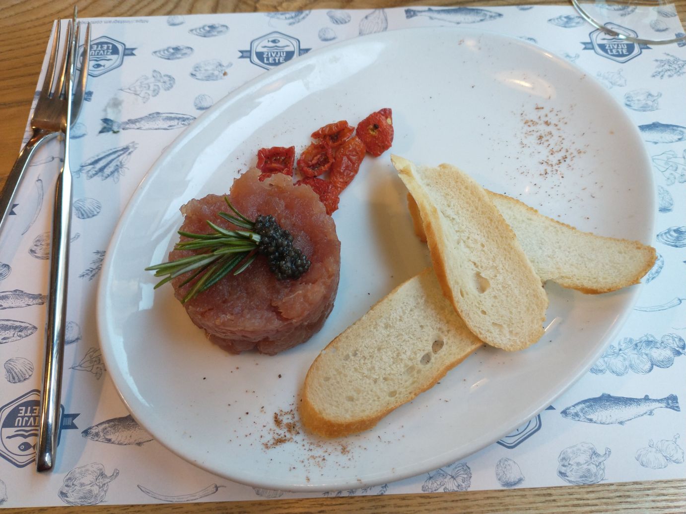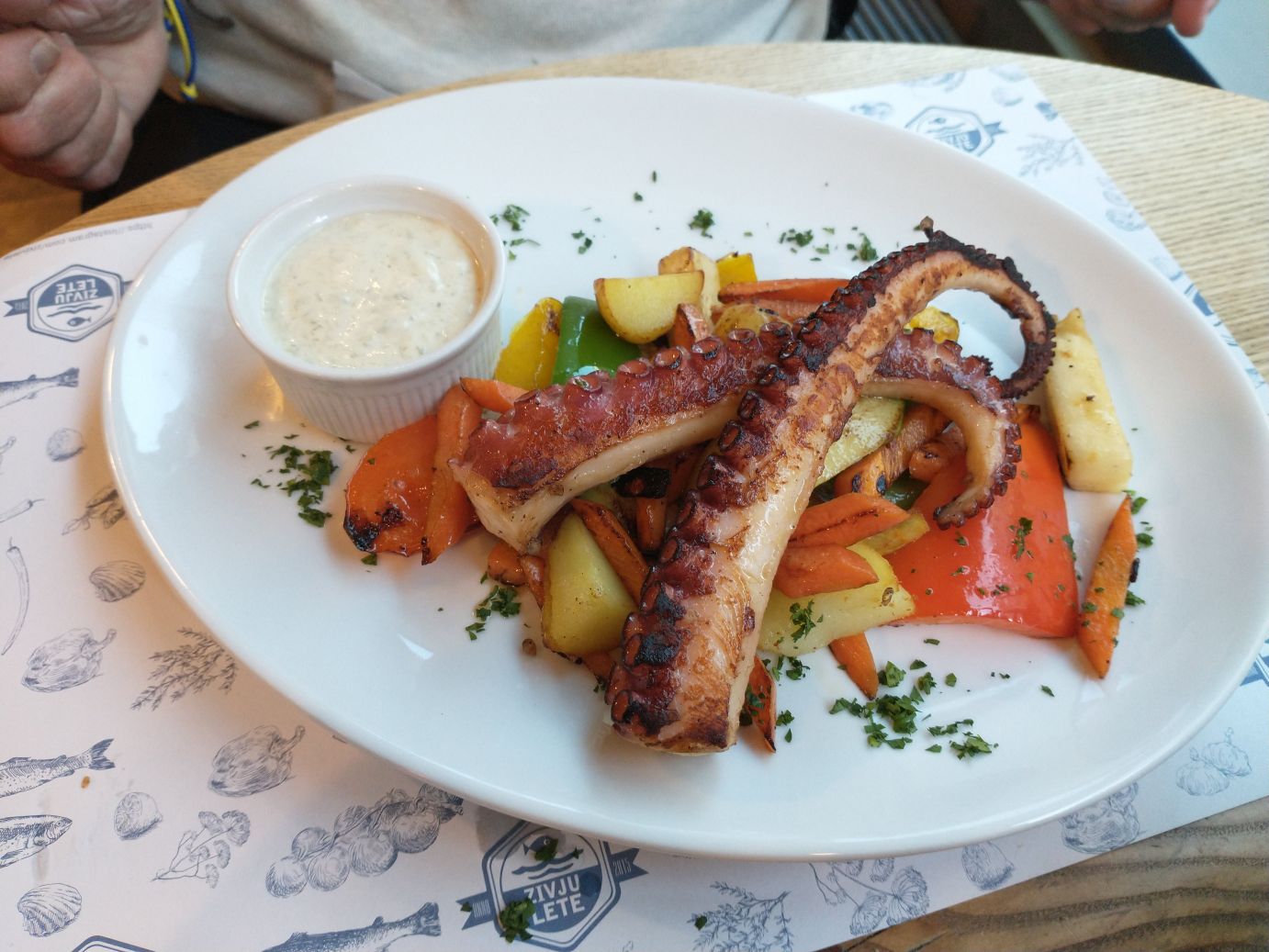 Later we again had drinks in the sky bar, took more pictures, spent some nice time with a couple of others in our tour group, then made our way back out to Zivju Lete, the restaurant for this evening where we feasted on a wonderful meal of smoked tuna dip (complimentary), tuna tartare, fried squid rings and grilled octopus. Lovely.