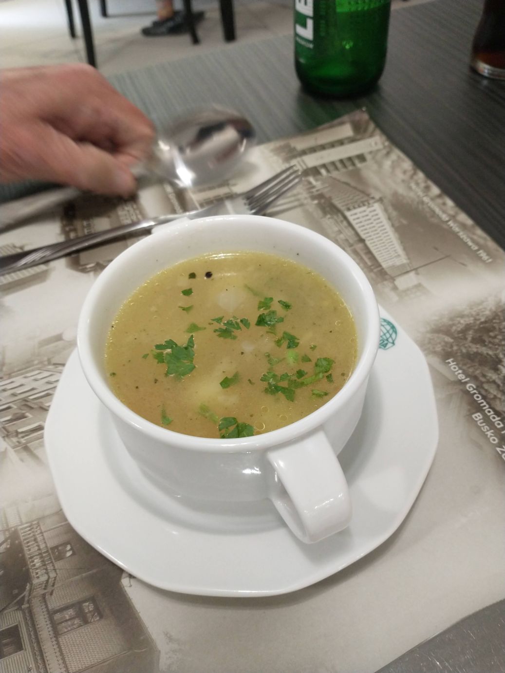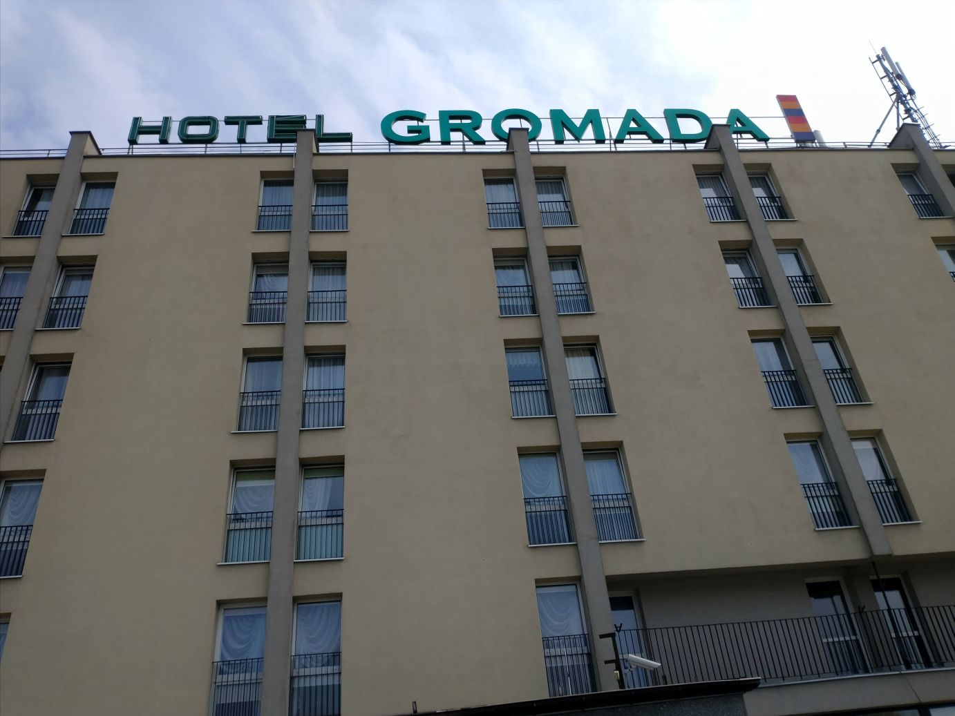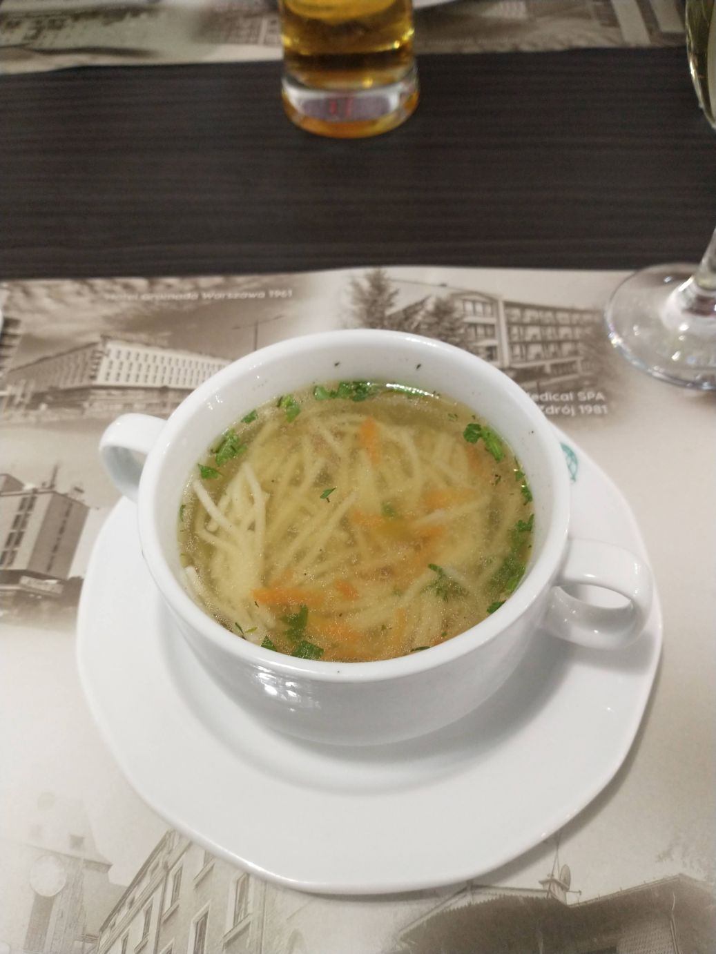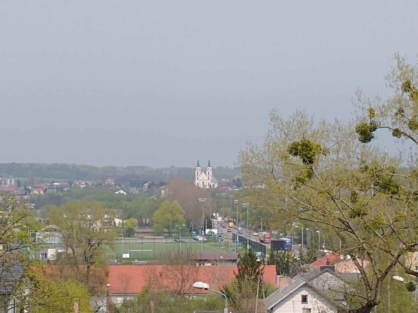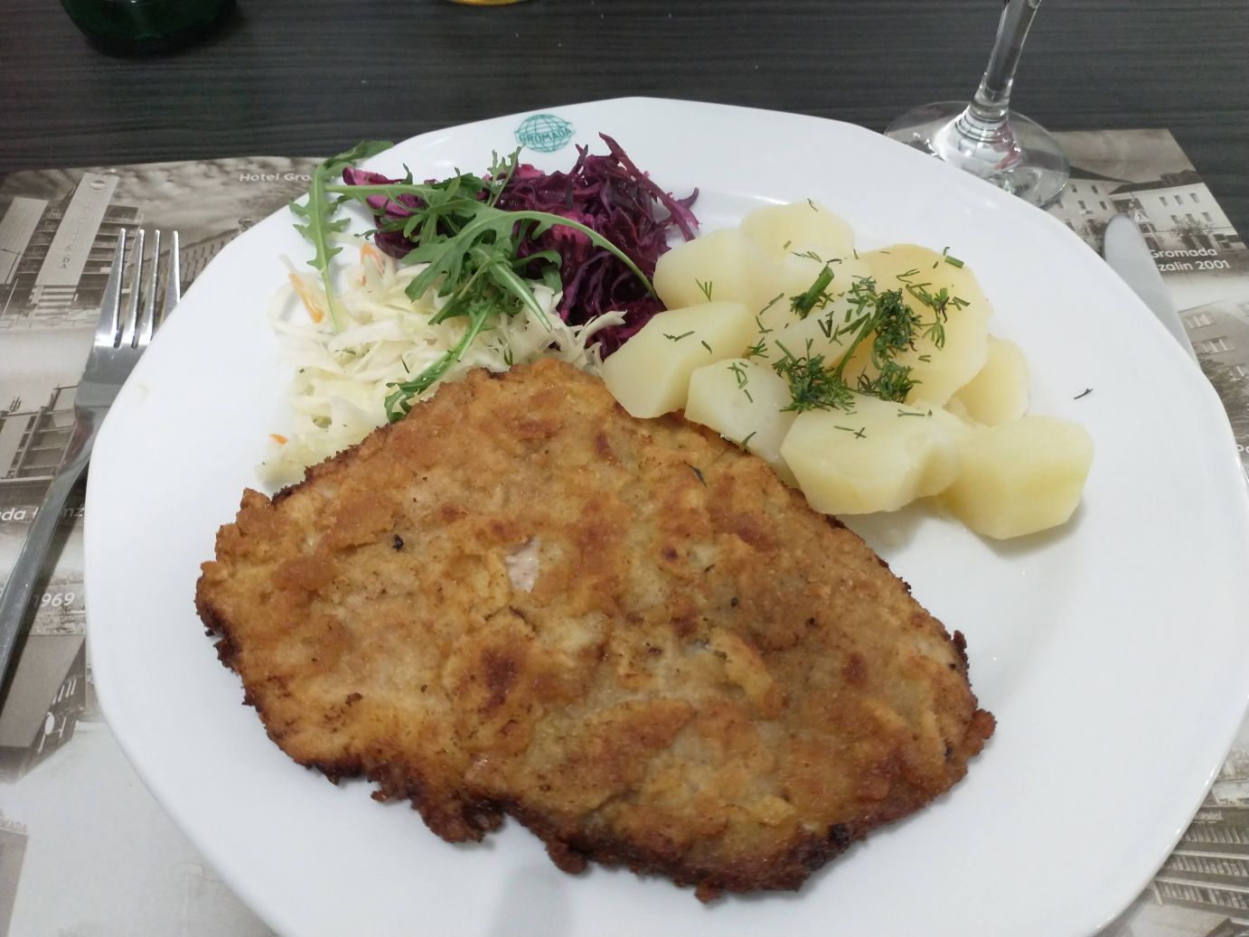 We hit the Polish border around 11, then continue pressing on along our back roads to the lunch spot – Lomza – where we eat at the Hotel Gromada, an old communist hotel. Food was good – two types of soup (I had vegetable noodle, Ed had the meat version) and Pork Schnitzel along with some sort of apple tart and ice cream for dessert. Stretching our legs after lunch, we have a few minutes to take some pretty scenic photos across the city skyline, and then, well, it is back on the bus for more hours of driving.