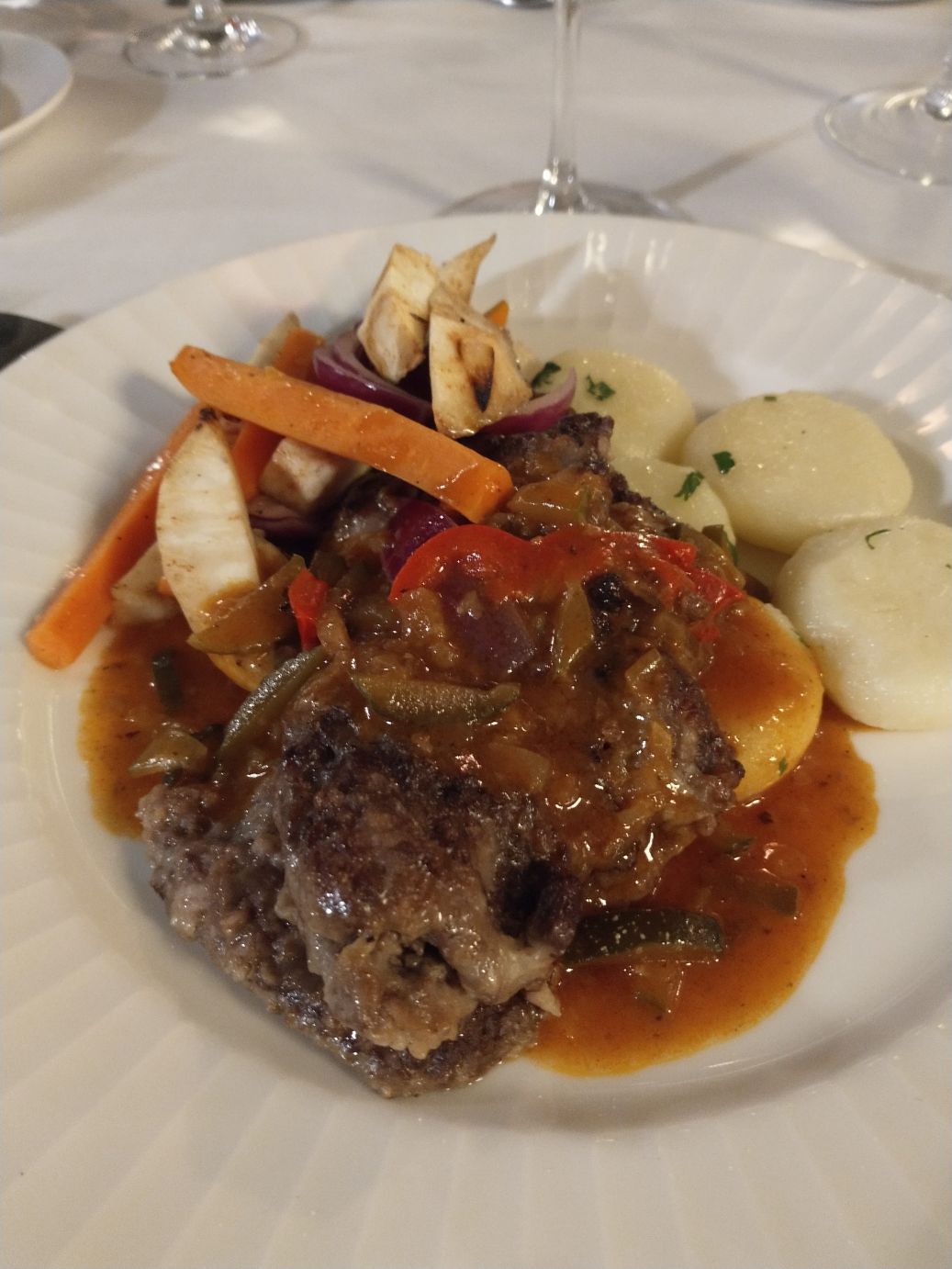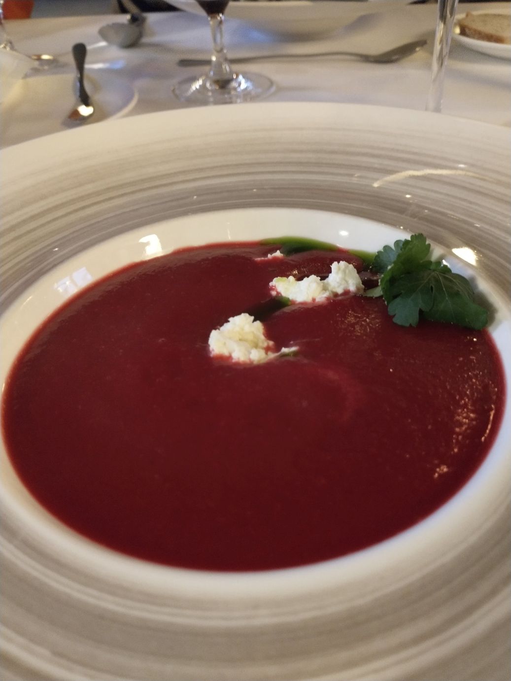 Then it was time for the food, which was excellent. Beet soup poured over goat cheese and basil olive oil, fabulous pork loin steaks smothered in a yummy sauce and a nice cheesecake with ice cream for dessert.