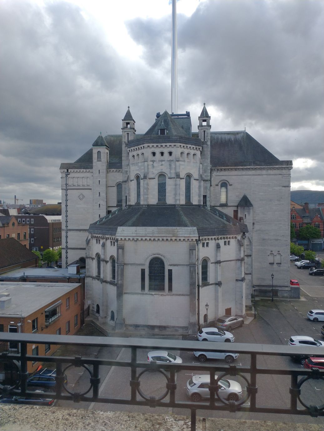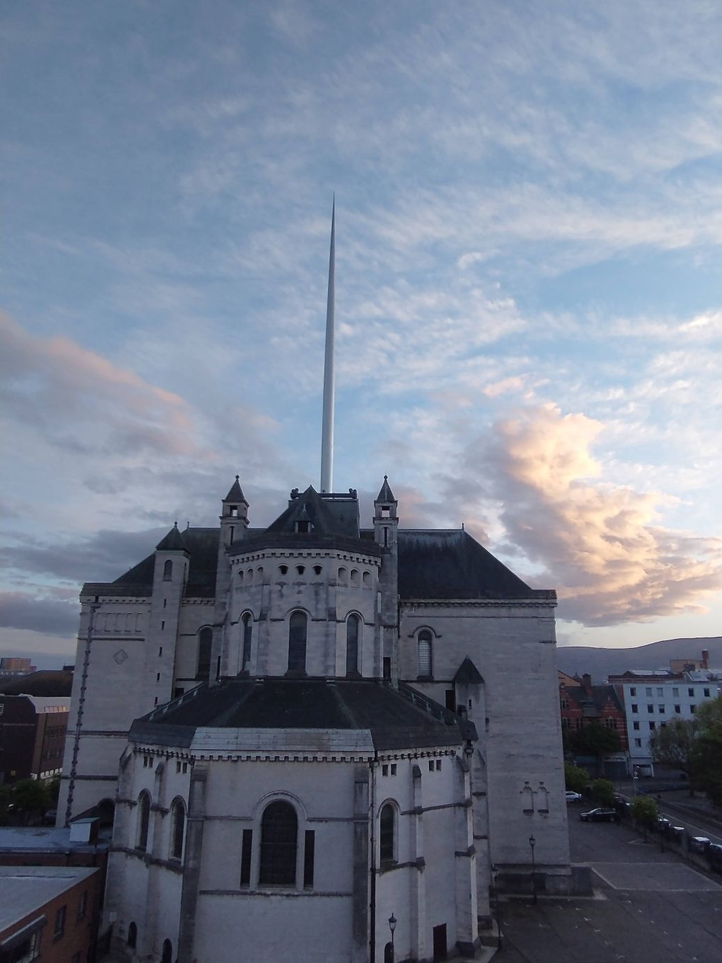….and we made it safely to Belfast right on time. The taxi queue was crazy long, so it took us a while to get on our way to the condo, but once in the car, we were there in no time. A very cute little place on the top floor of a building overlooking the Belfast Cathedral with the Spire of Hope. (The Cathedral is sinking and on such soft soil that it cannot withstand the added weight of a bell tower or spire. The city held a contest to design a lightweight spire – the spike you see coming out of the top of the Cathedral – and placed in there in 2007. It was a time of redevelopment in Belfast, so the council decided to name the spire, The Spire of Hope. History lesson complete!)