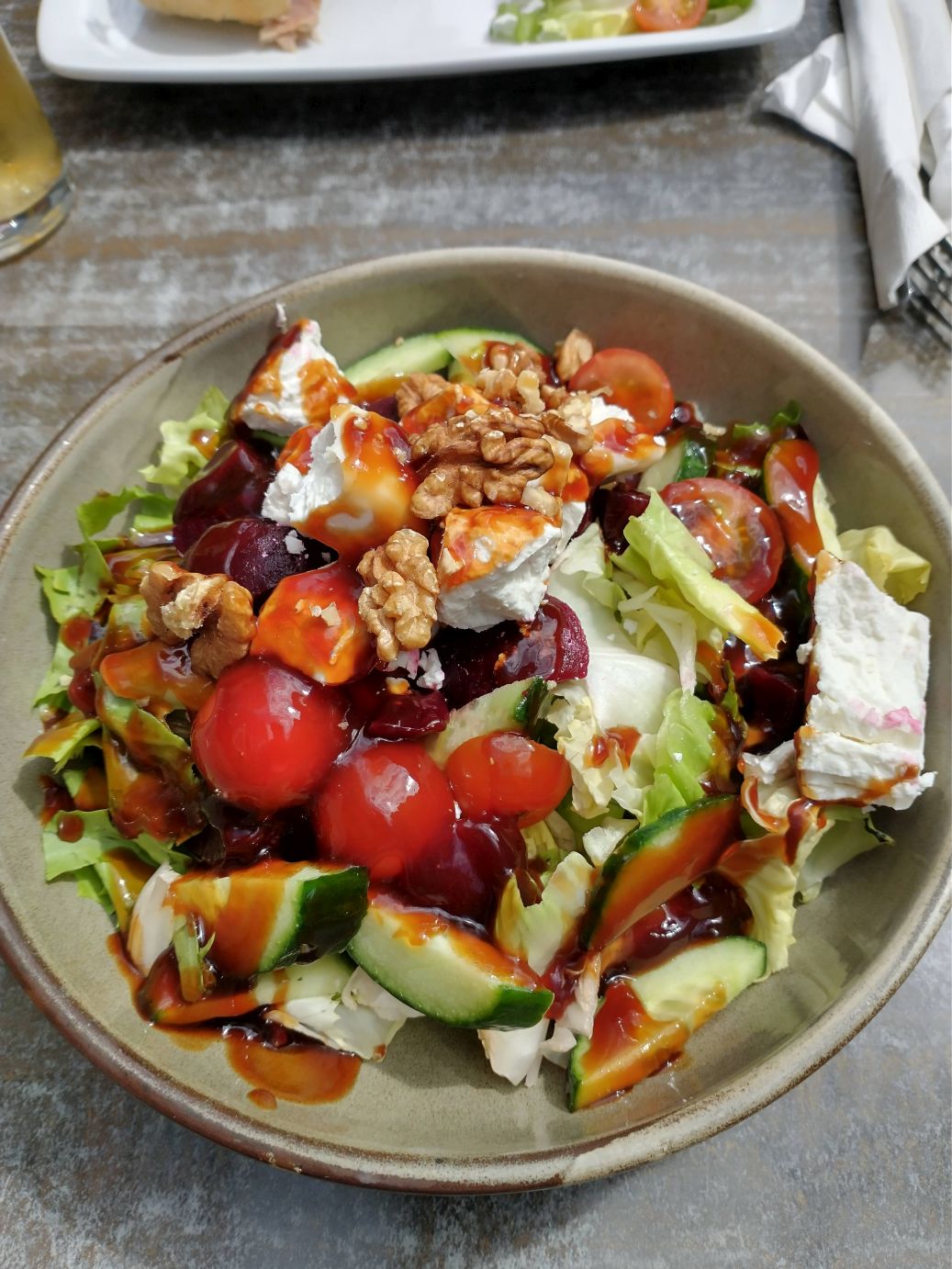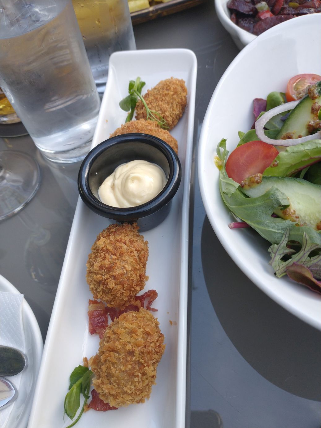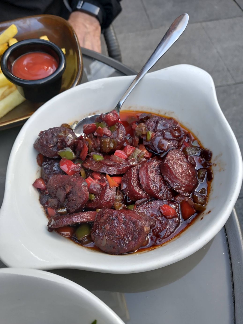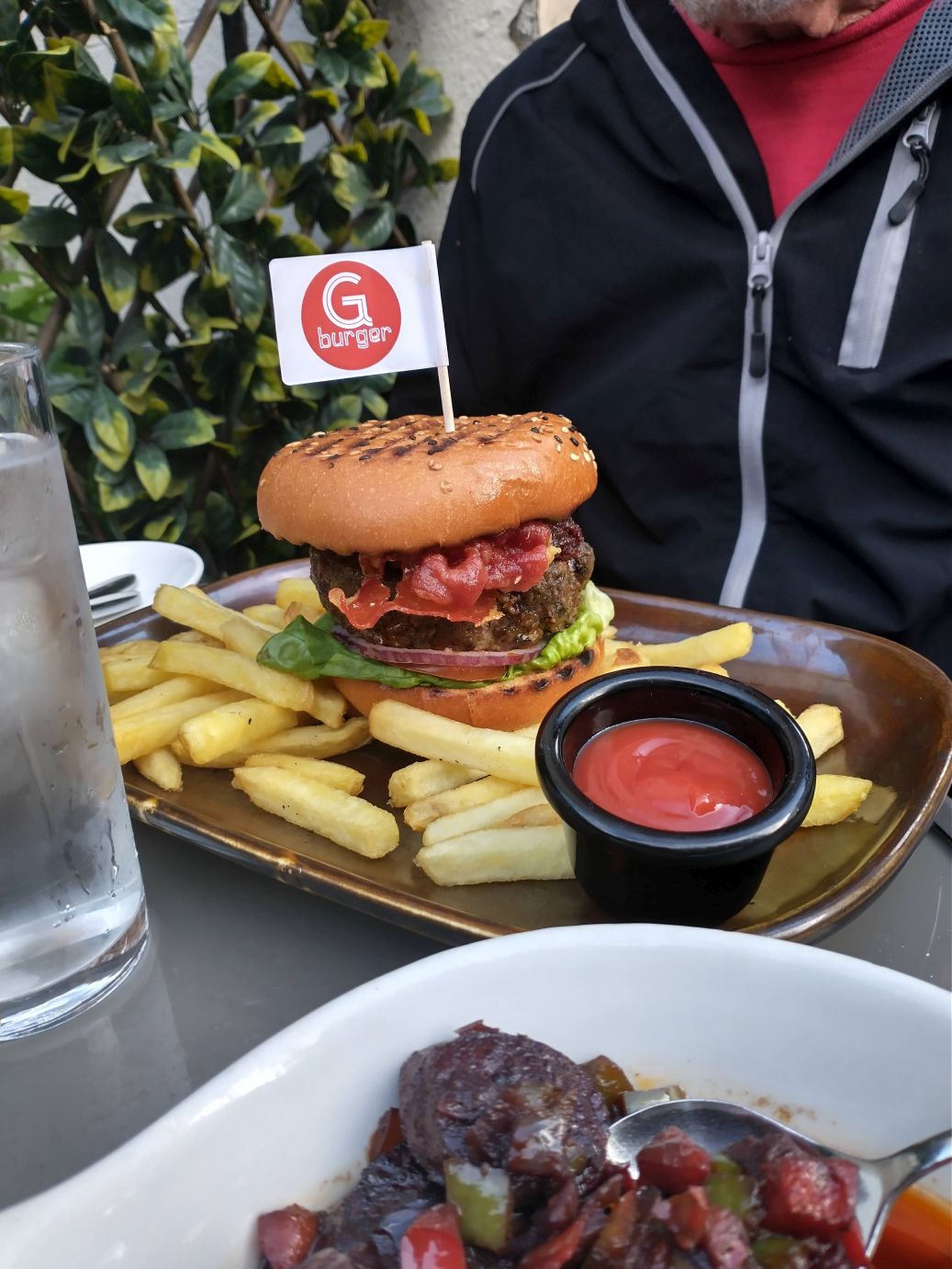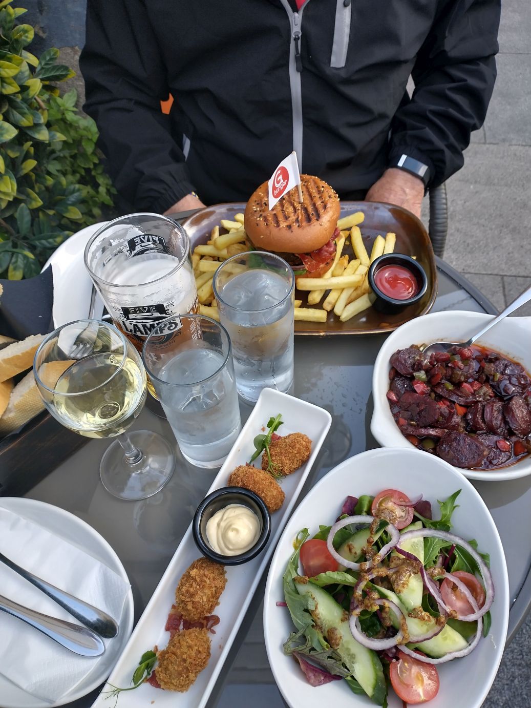 The service is slow, but as we have nothing else planned this evening, we don’t care. We get our drinks then hang out and wait for our sweet waiter (who really is quite sweet) to bring our croquetas de Jamon, Chorizo en Vino, side salad and monster Salamanca Burger made with beef, pork and chorizo. It’s a feast!