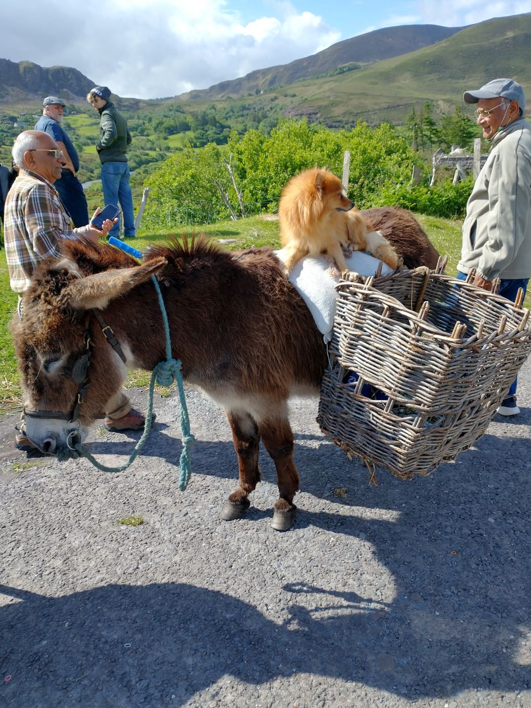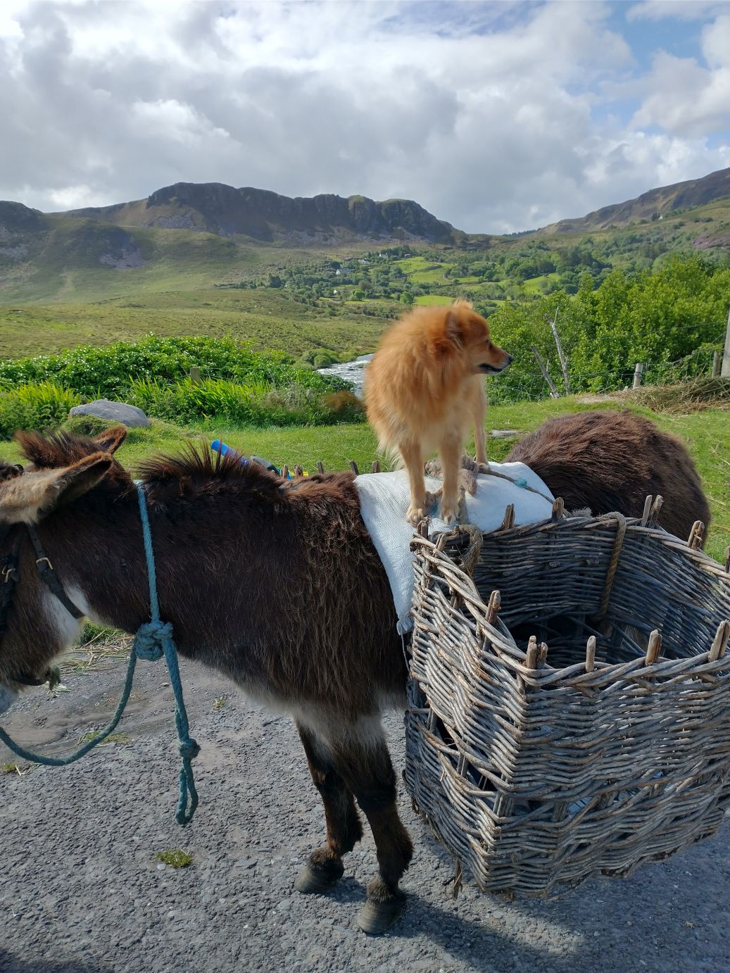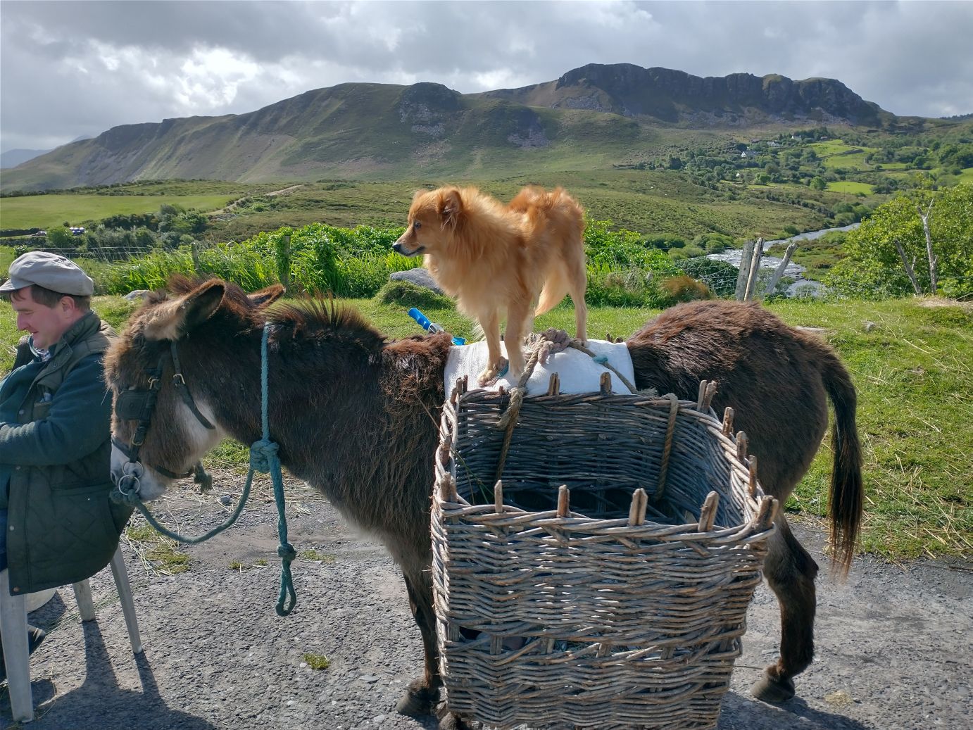 Beyond the incredible scenery, there is a man with donkey – and a dog sitting atop it! – selling St. Bridget’s crosses made out of reeds. He’s actually making the reed crosses right there, which is fascinating in and of itself, but I’m captivated by the dog! He is so cute, just sitting there on that donkey, not caring one whit that we are there or around. And then he stands up! Aw, just leave me here all day to watch him please.