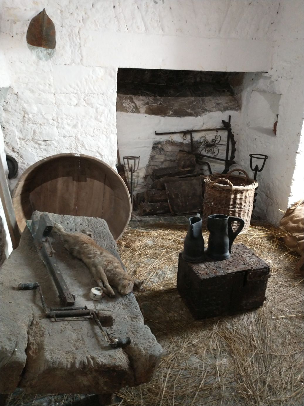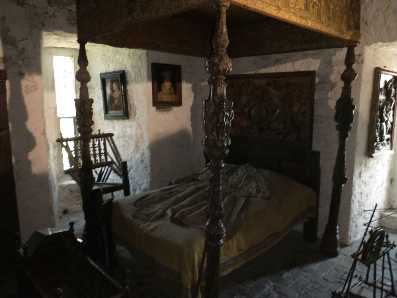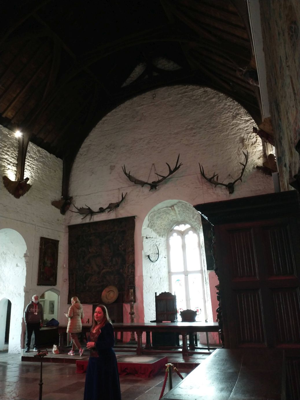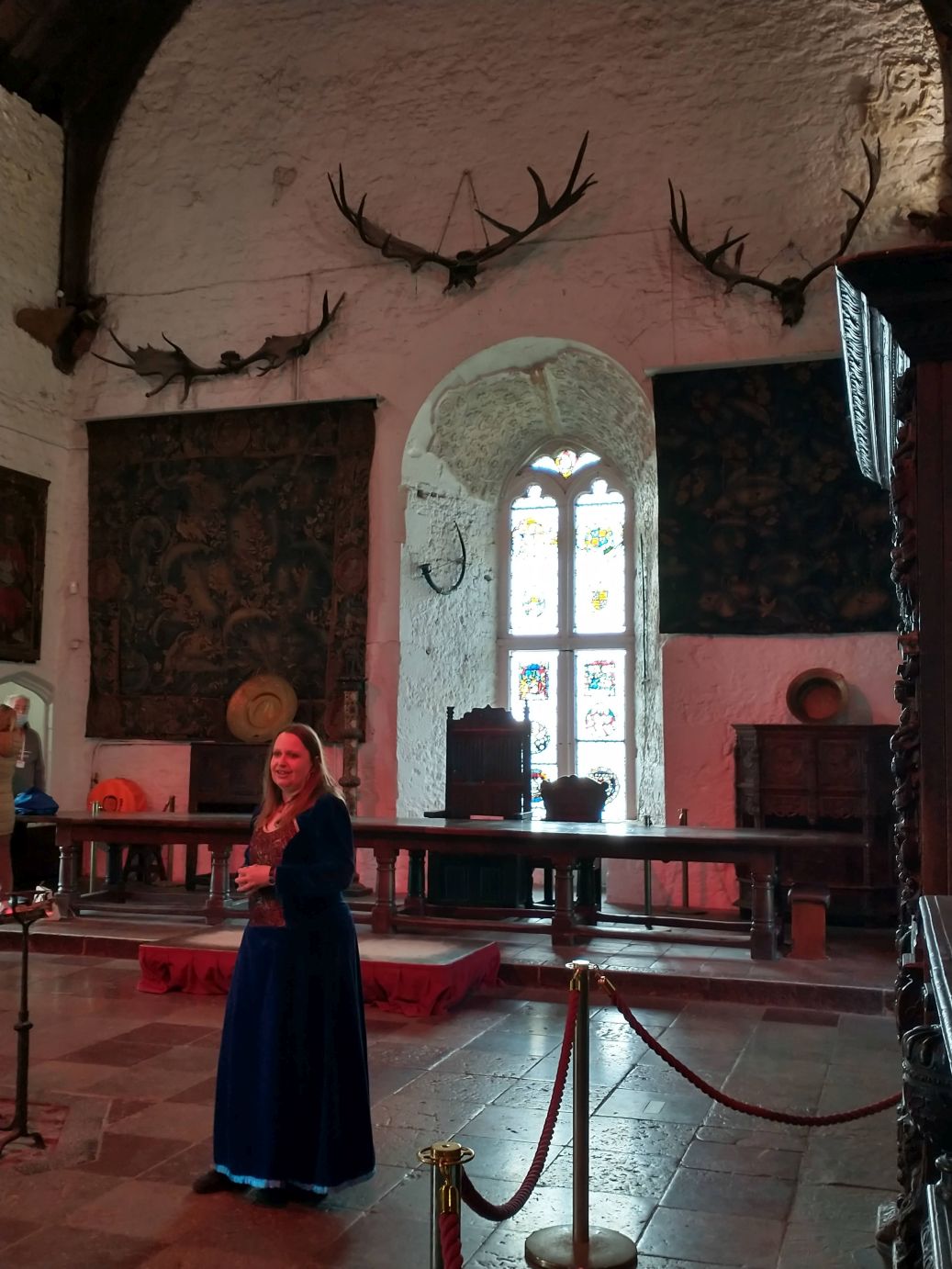 The park itself is in a lovely setting, all green and tree filled, sitting alongside a lovely small river. So the scenery is lovely, and the Castle is pretty cool – regally standing at the end of the village. Because we are a “large” group we get a presentation by the local tour lady, and do spend a bunch of time wandering around the four floors of different rooms. (I really don’t think that is a dead cat in the last photo – I think maybe a bunny, just so you know.)