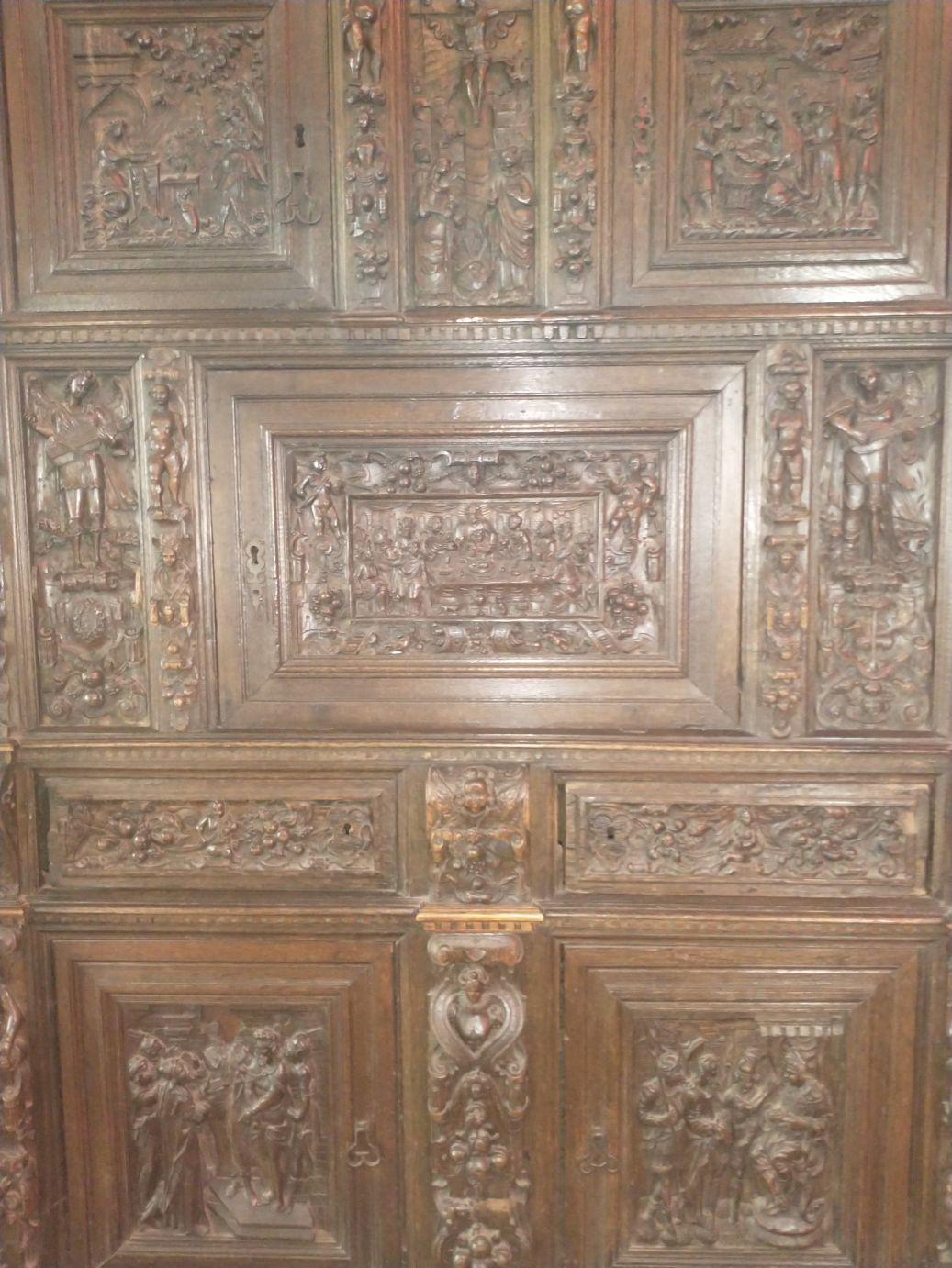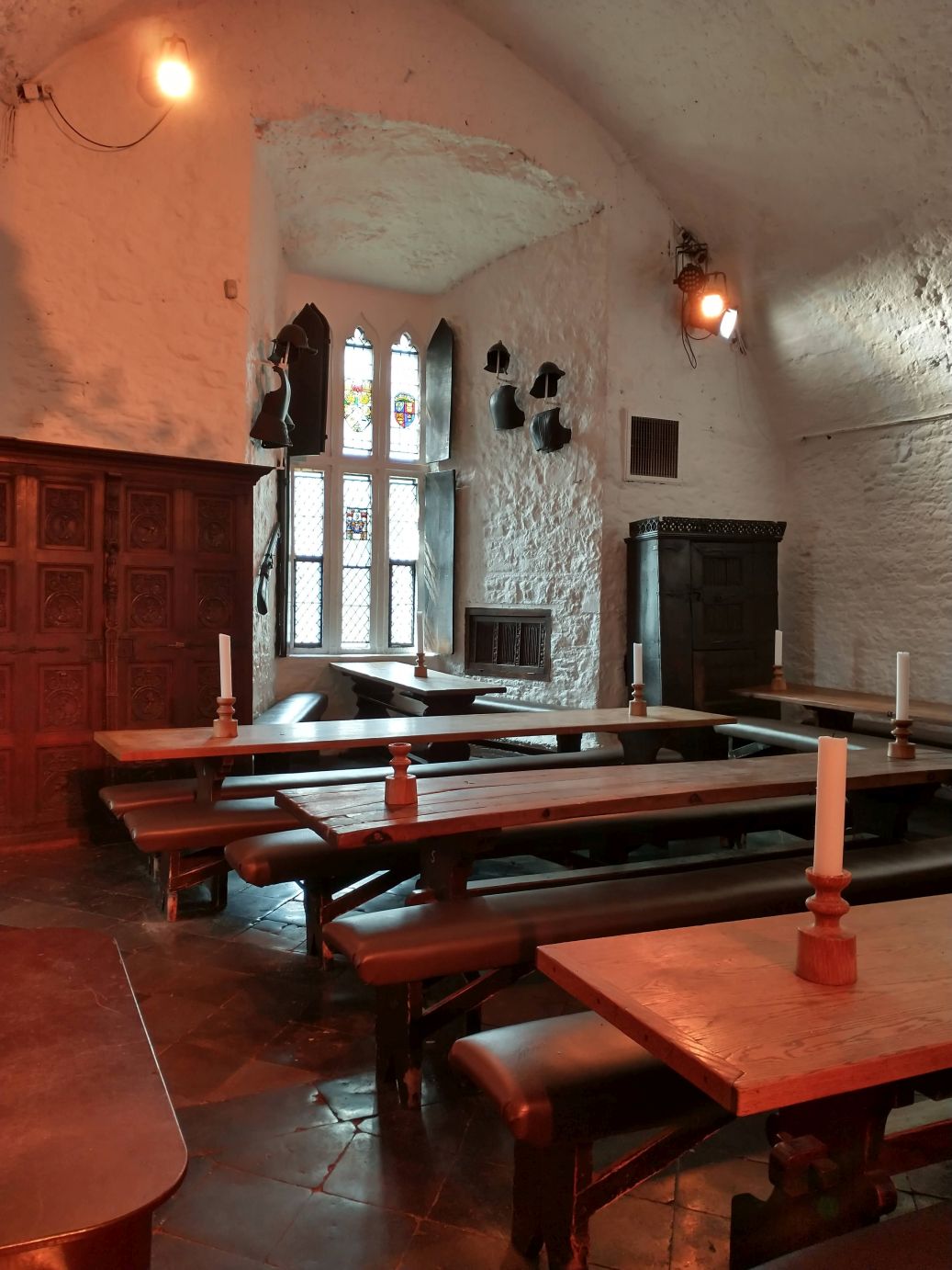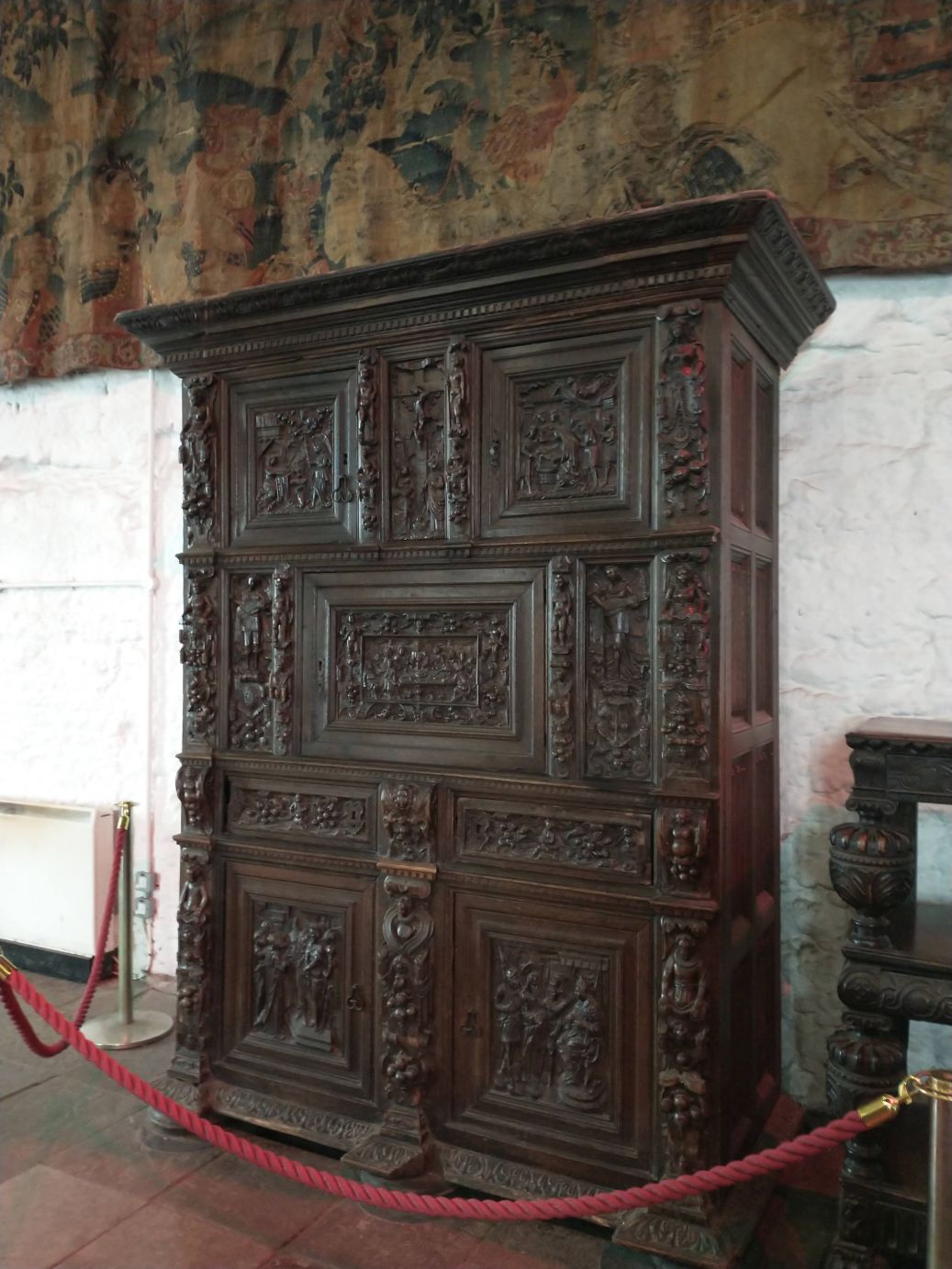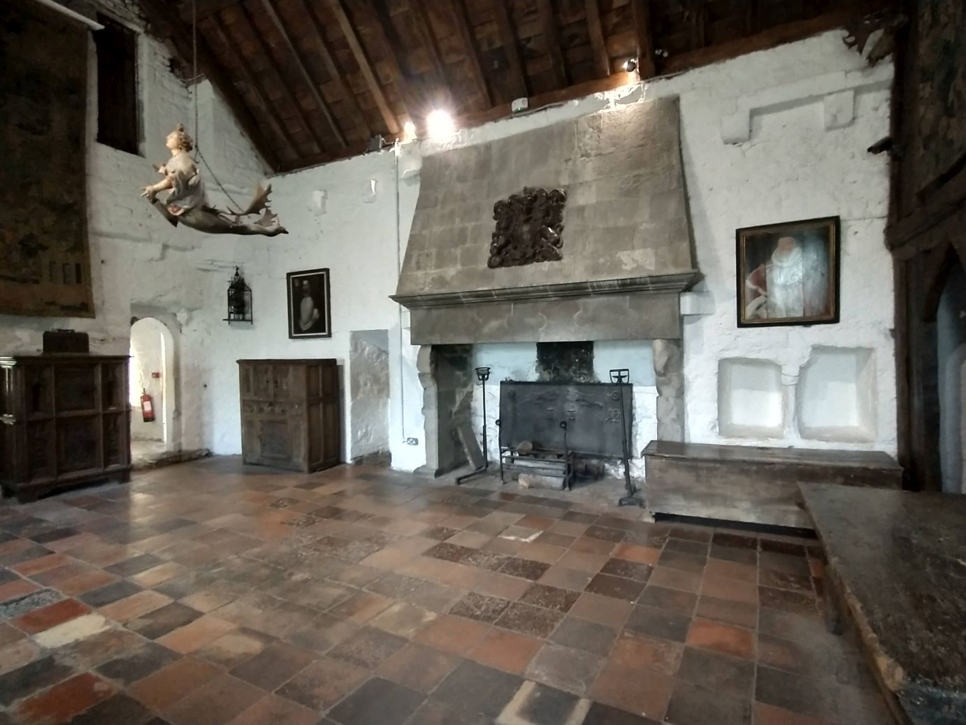 The park itself is in a lovely setting, all green and tree filled, sitting alongside a lovely small river. So the scenery is lovely, and the Castle is pretty cool – regally standing at the end of the village. Because we are a “large” group we get a presentation by the local tour lady, and do spend a bunch of time wandering around the four floors of different rooms. (I really don’t think that is a dead cat in the last photo – I think maybe a bunny, just so you know.)