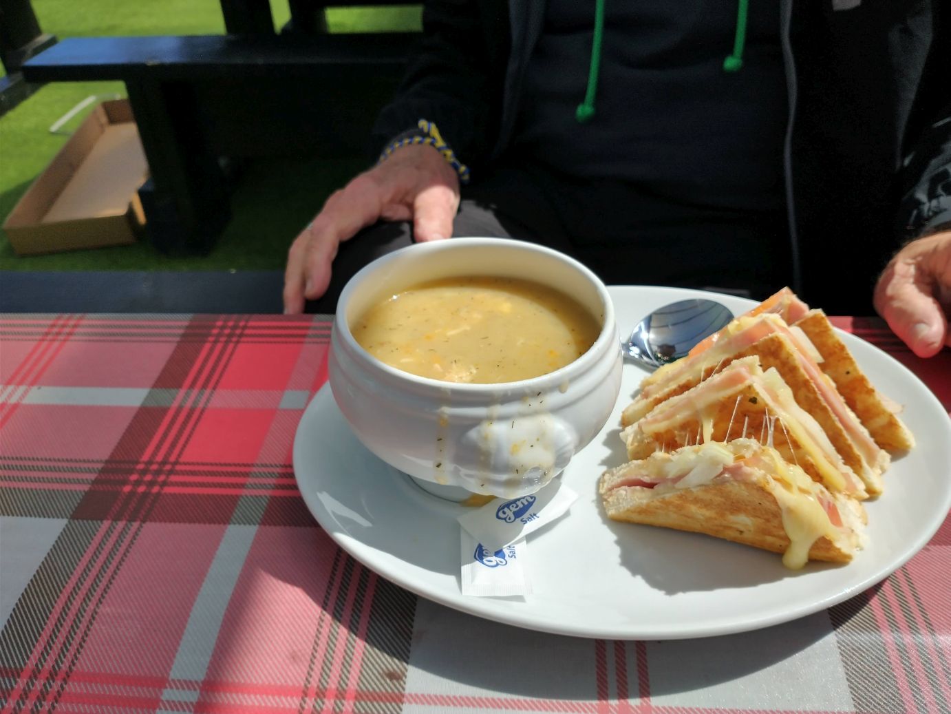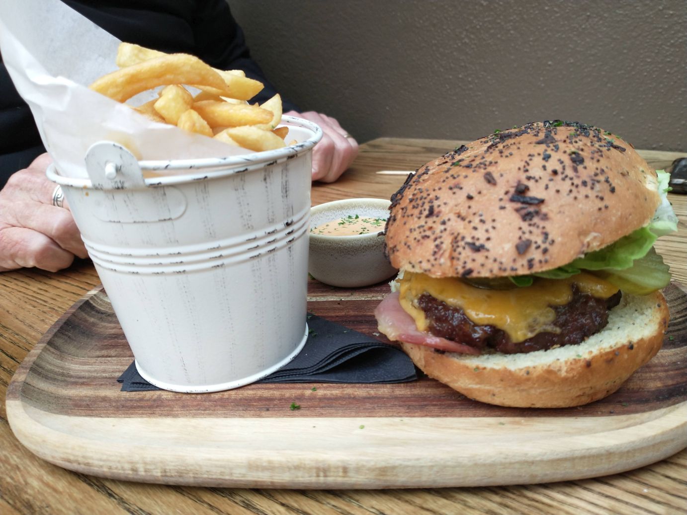 Later we pull on our puffy coats to head for an outside dinner. Our plans were to go to a pub we had read about with music and traditional food, but on the way we spy some others in our group going there, and decide, change of plans!! Don’t want to be unsocial, but we’d rather eat on our own – we are with them all so much anyway. So, the pub turns into a restaurant – The Market Bar which has a lovely little outdoor seating area that we have all to ourselves where we order Chorizo and Shrimp, a goat cheese salad – which was not what I expected, essentially because I misread the description! – but is still excellent and a huge burger for Ed. Perfect.