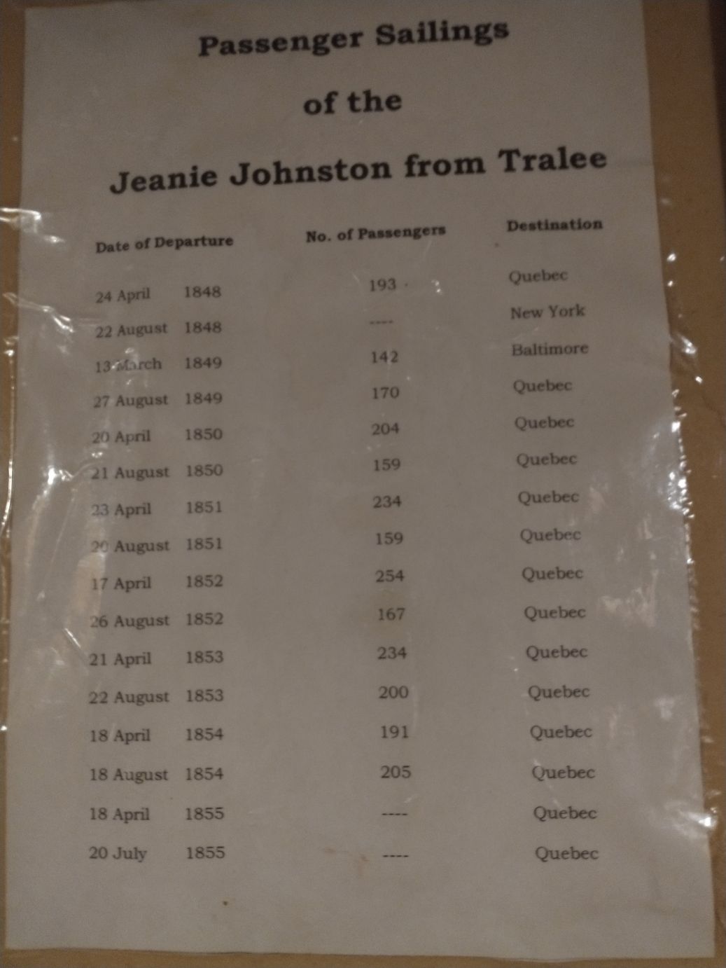 The Donovan family ship was the only ship to have a doctor on board during the voyages and to sincerely care about their passenger cargo getting to the new world safely. She had a perfect safety record, never losing one passenger, which is amazing considering there were up to 250 passengers who spent most of their time below deck, only emerging for a half an hour of fresh air each day.