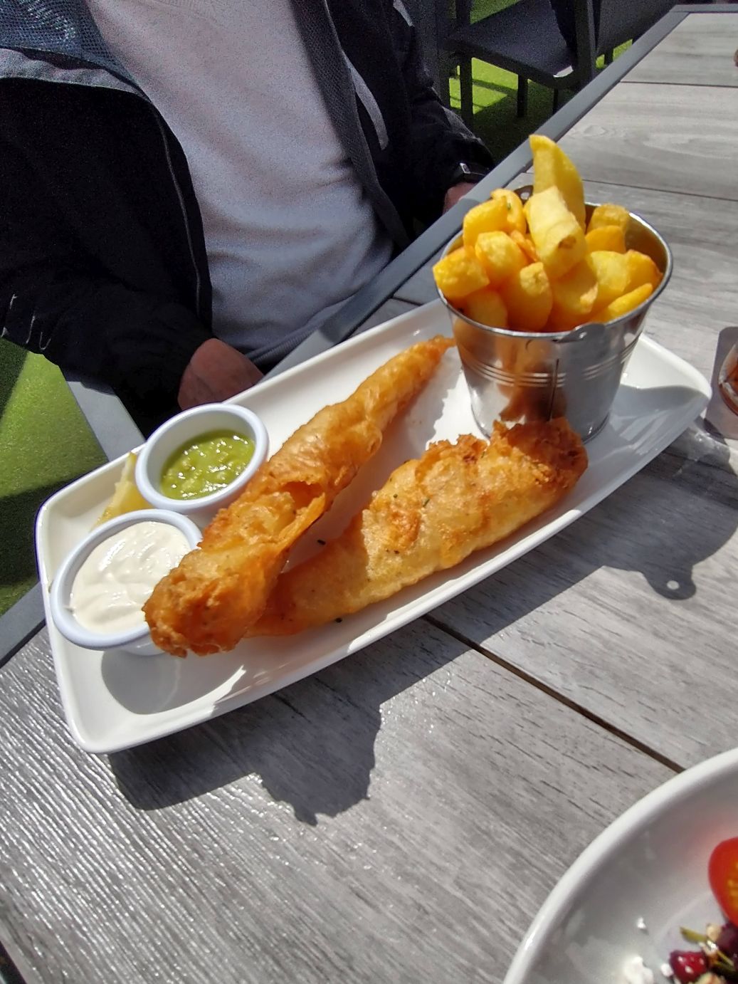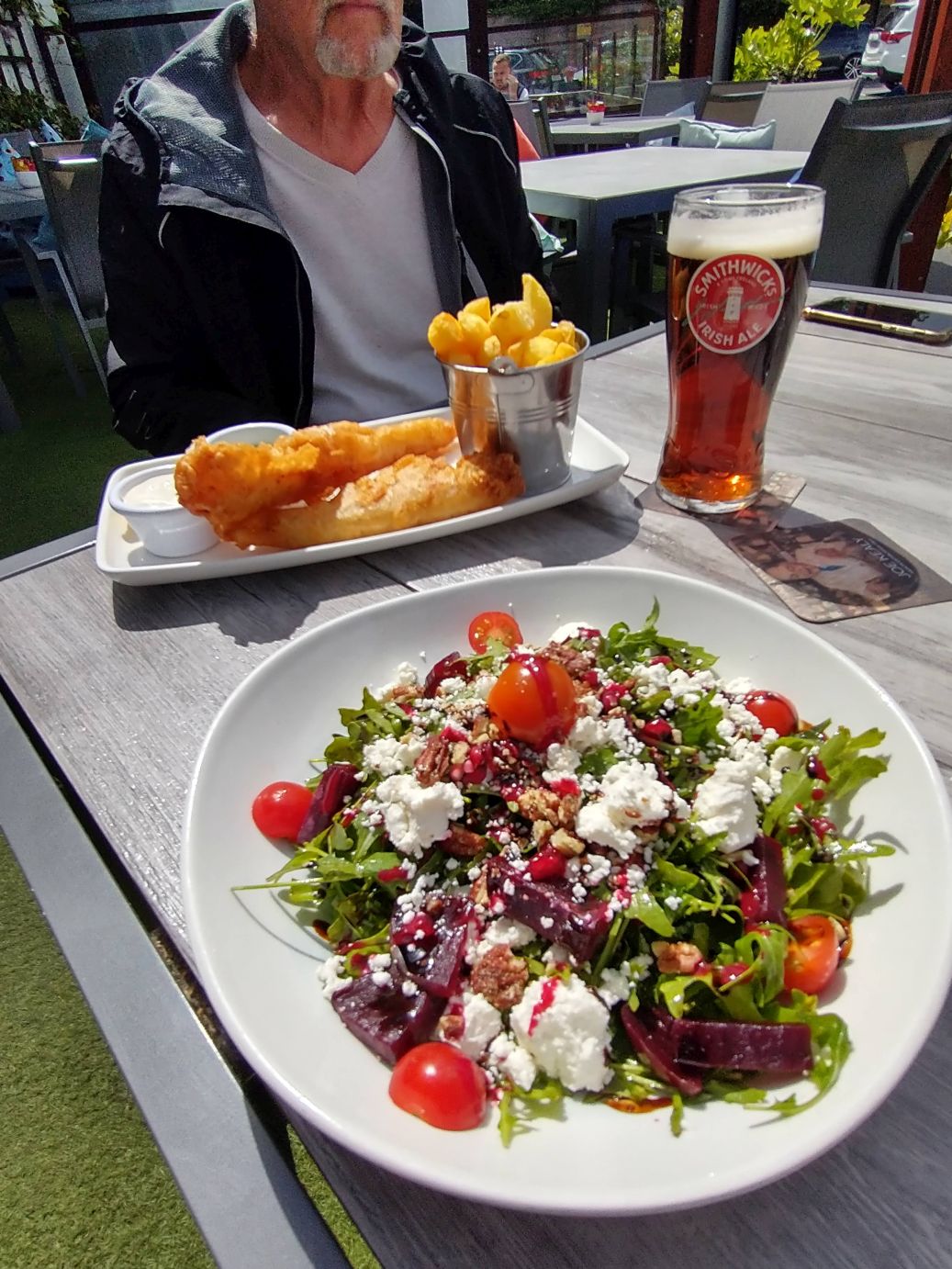 Sitting in the sun (until the clouds roll over and we have to move to a table closer to the wall to be under cover when it begins to pour down rain) we have a totally enjoyable lunch of fish and chips and beet root and goat cheese salad.