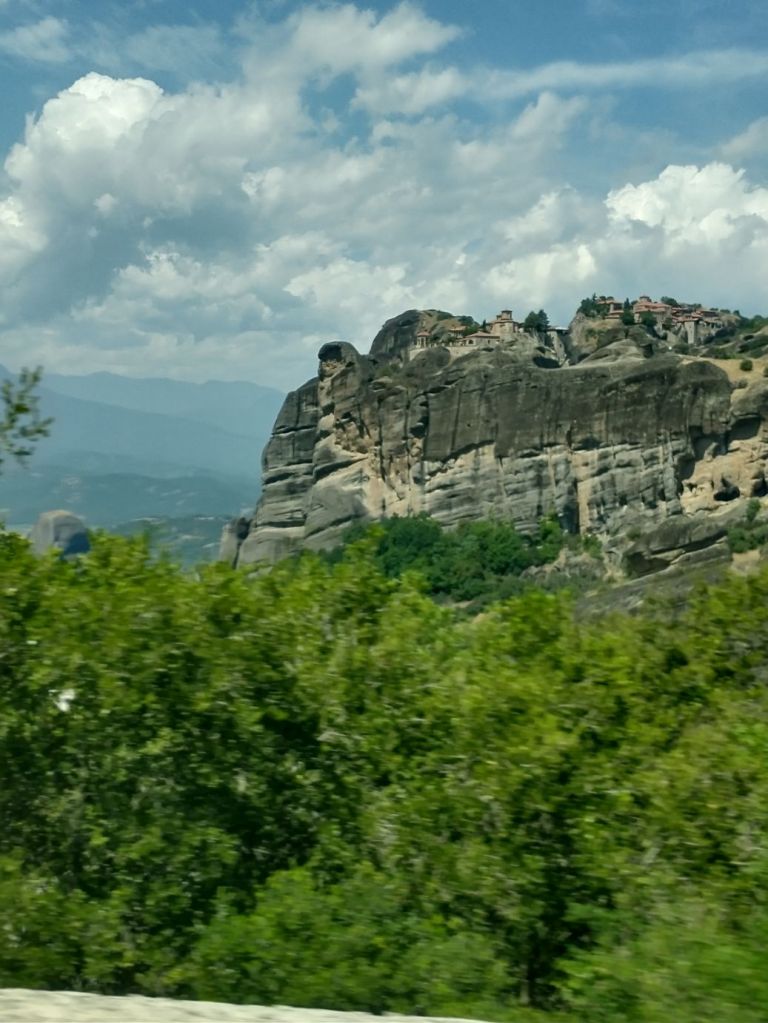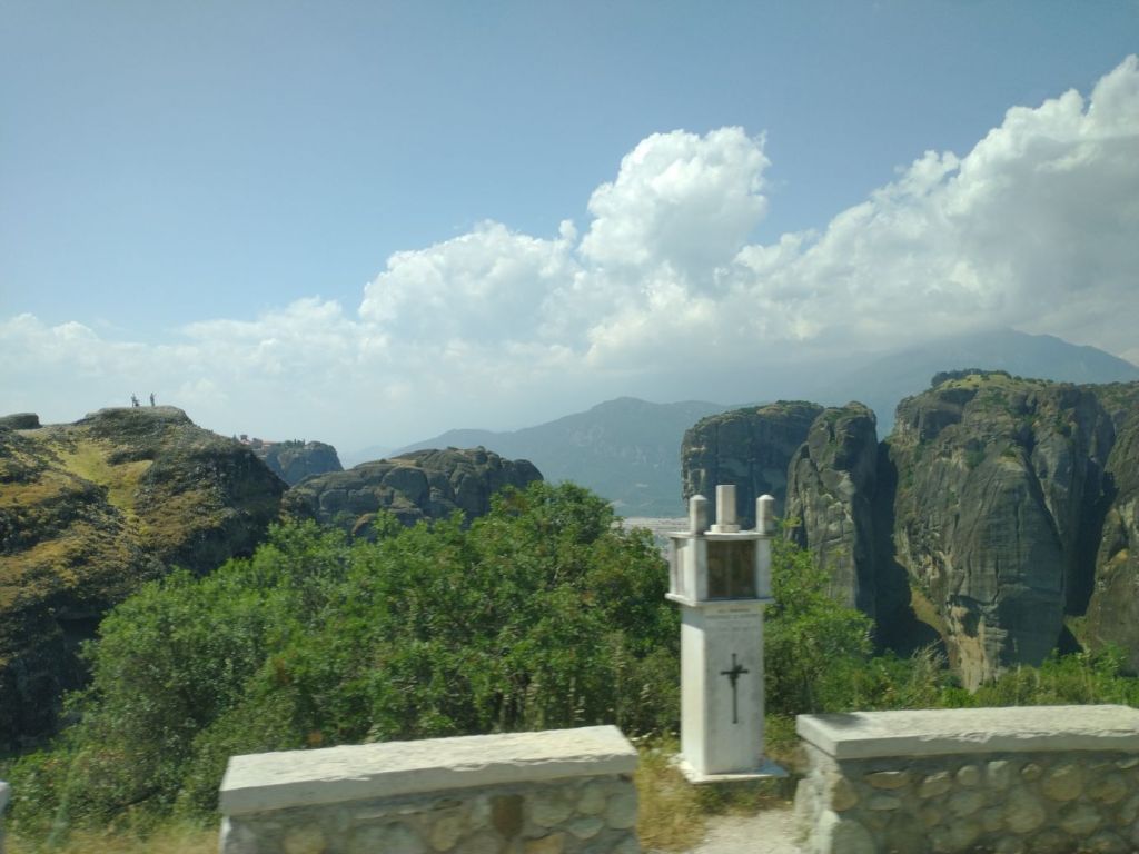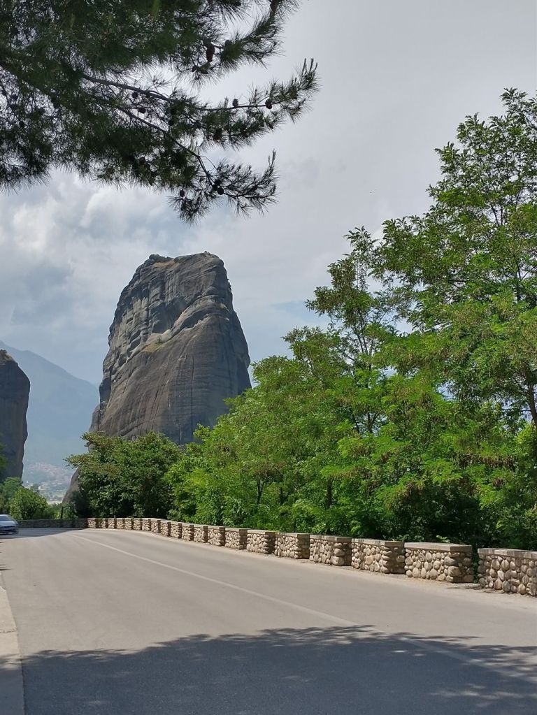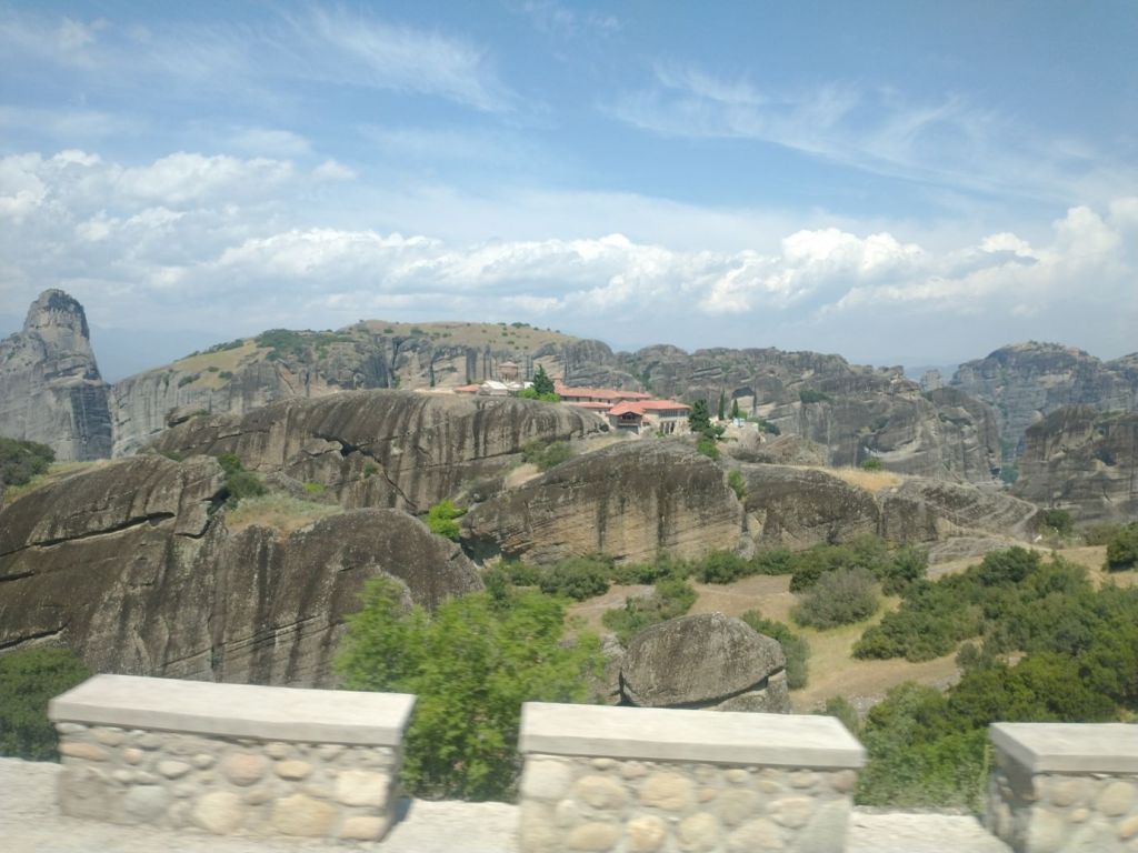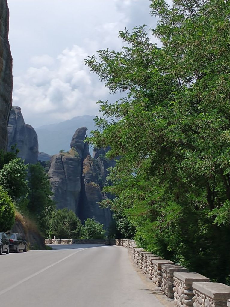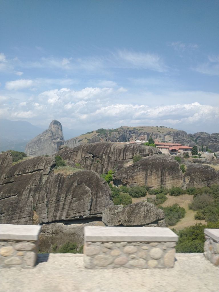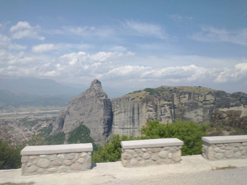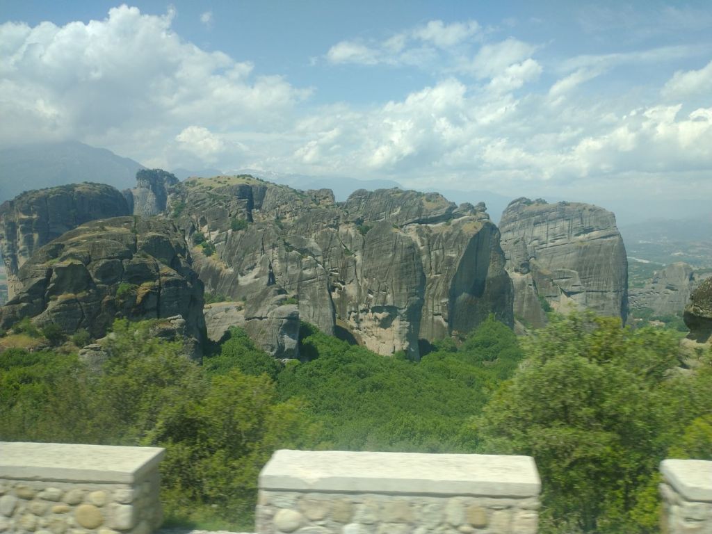 We meet and make our way to the bus at the appropriate time, snagging decent seats little ways back from the front. Our tour guide, Giorgos, is great. He’s totally into Greek mythology so as we drive along, he regales us with tons of stories and legends – trying his best to come back to the actual facts of the monasteries. As we gaze out at the gorgeous scenery along the route, as the peaks start to appear, we learn interesting new facts about Greece – almost 75% of the country is covered by mountains, it is the 2nd most mountainous country in Europe (had no idea!) and there are 18 ski areas around the country. News to us!