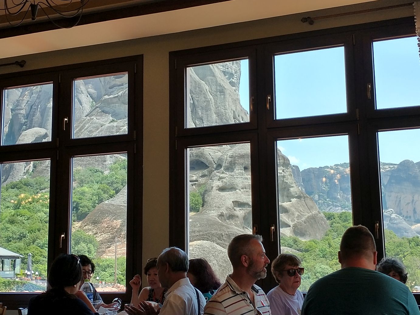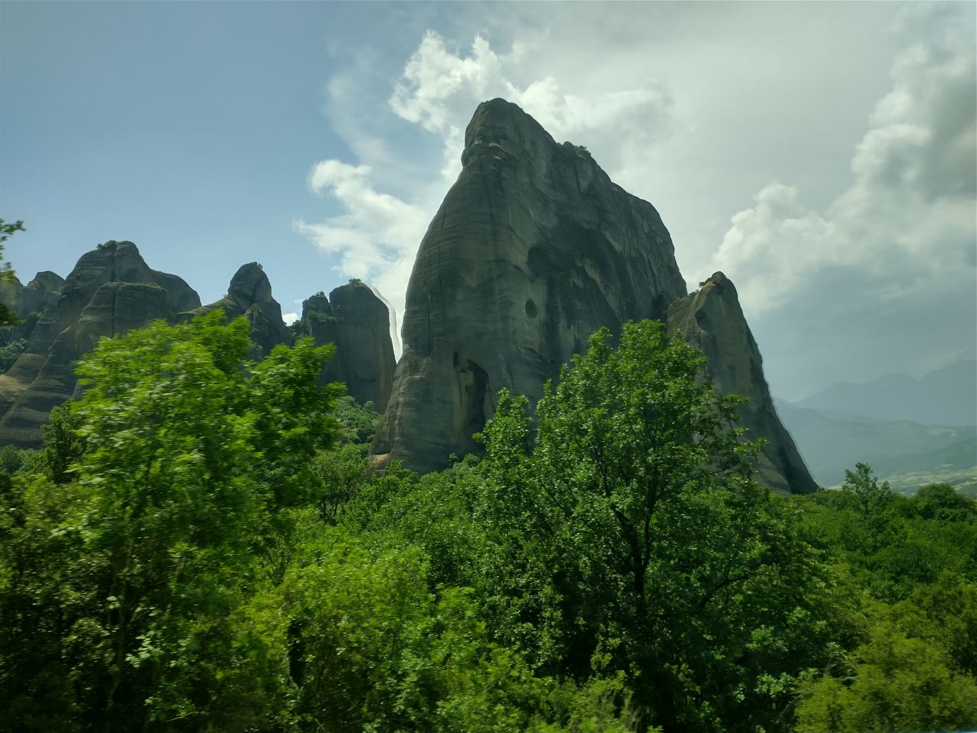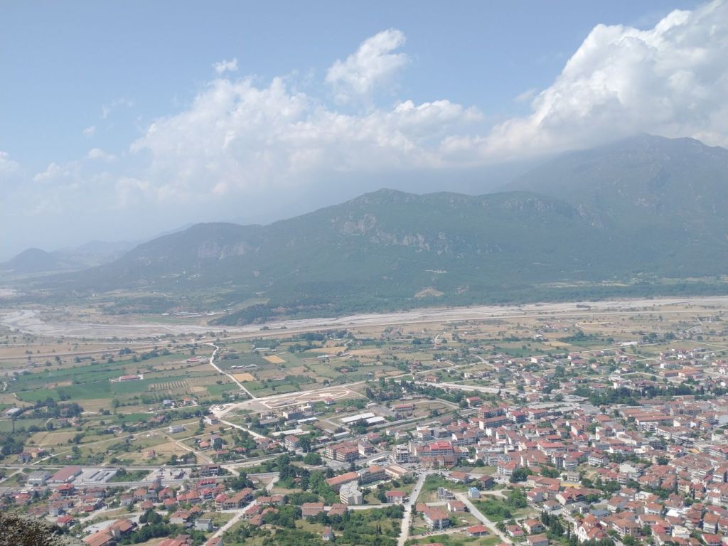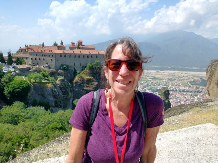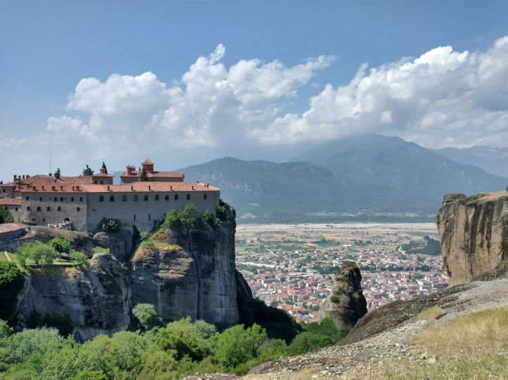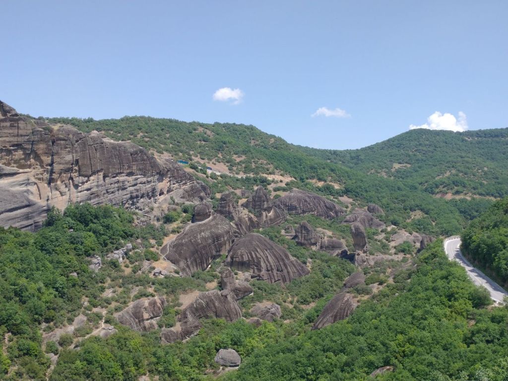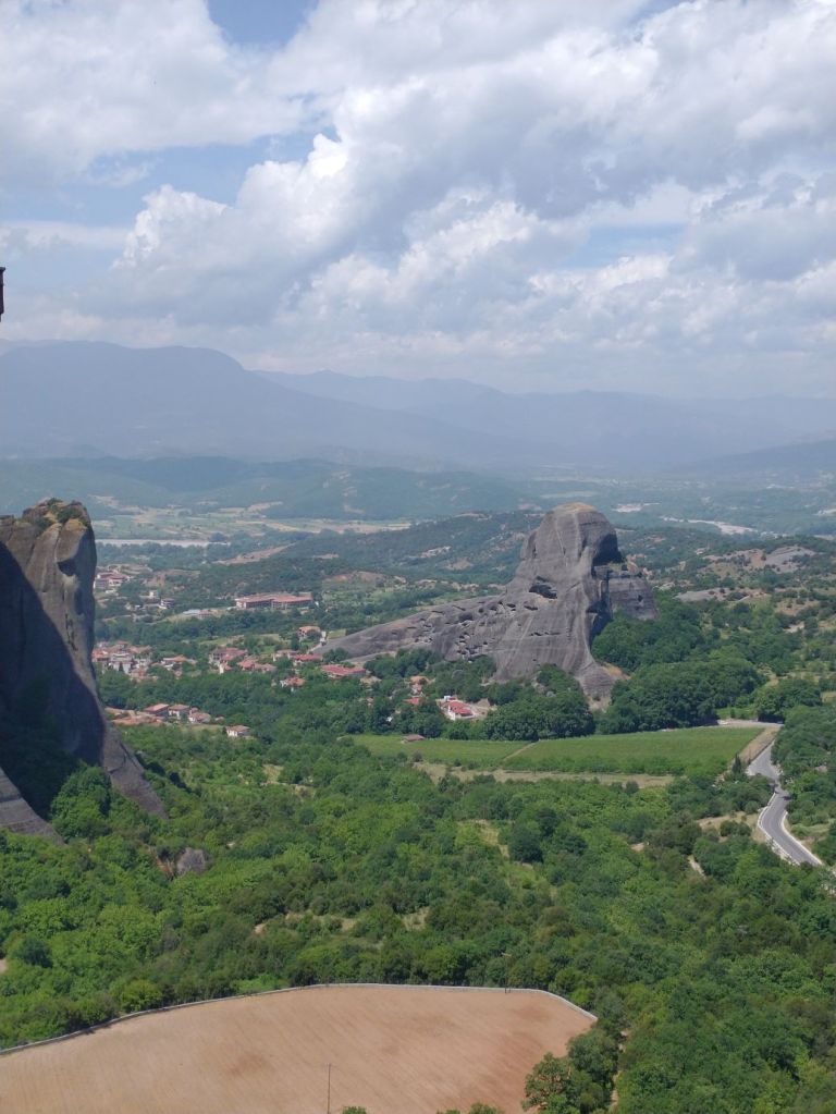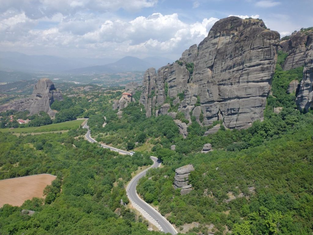 We meet and make our way to the bus at the appropriate time, snagging decent seats little ways back from the front. Our tour guide, Giorgos, is great. He’s totally into Greek mythology so as we drive along, he regales us with tons of stories and legends – trying his best to come back to the actual facts of the monasteries. As we gaze out at the gorgeous scenery along the route, as the peaks start to appear, we learn interesting new facts about Greece – almost 75% of the country is covered by mountains, it is the 2nd most mountainous country in Europe (had no idea!) and there are 18 ski areas around the country. News to us!