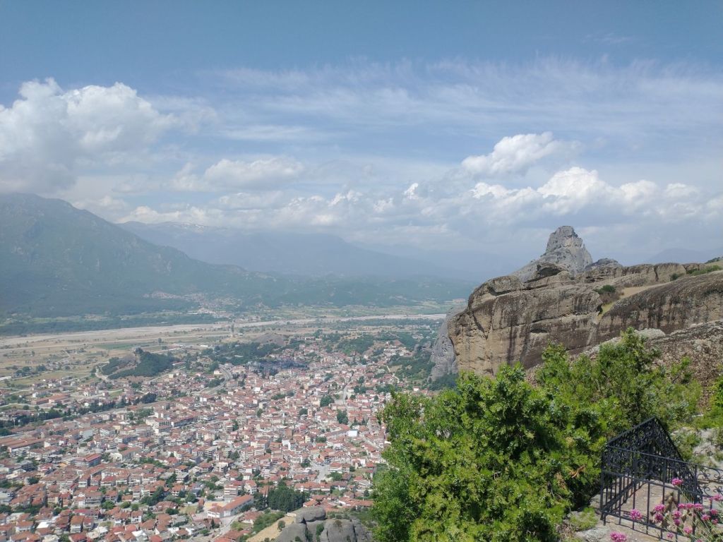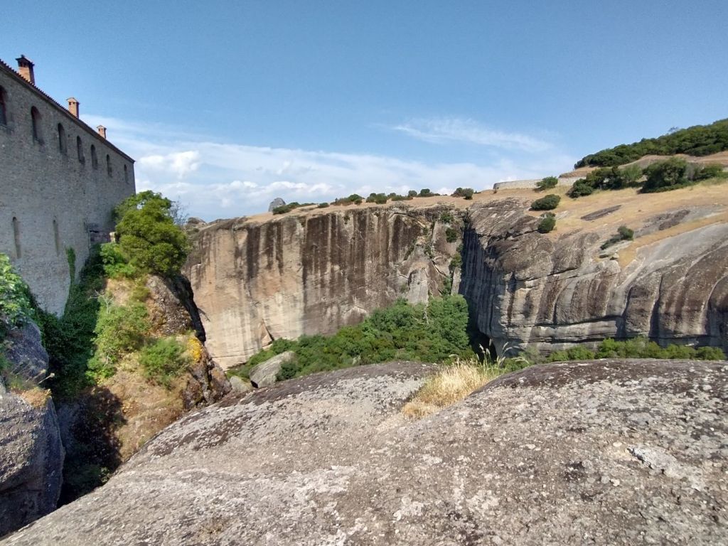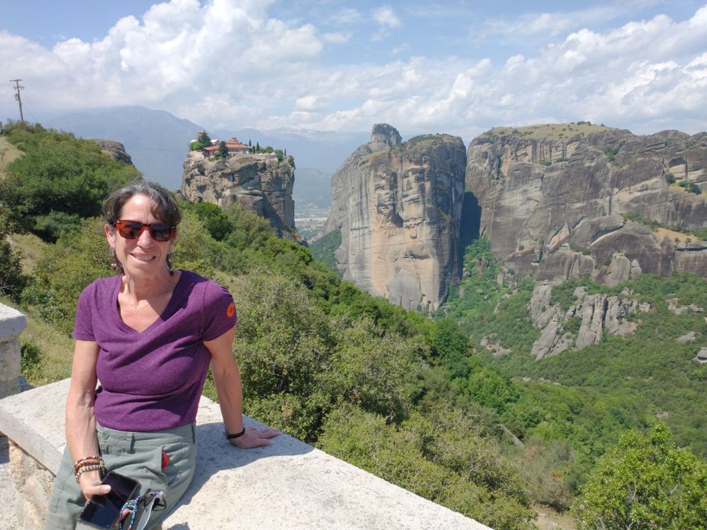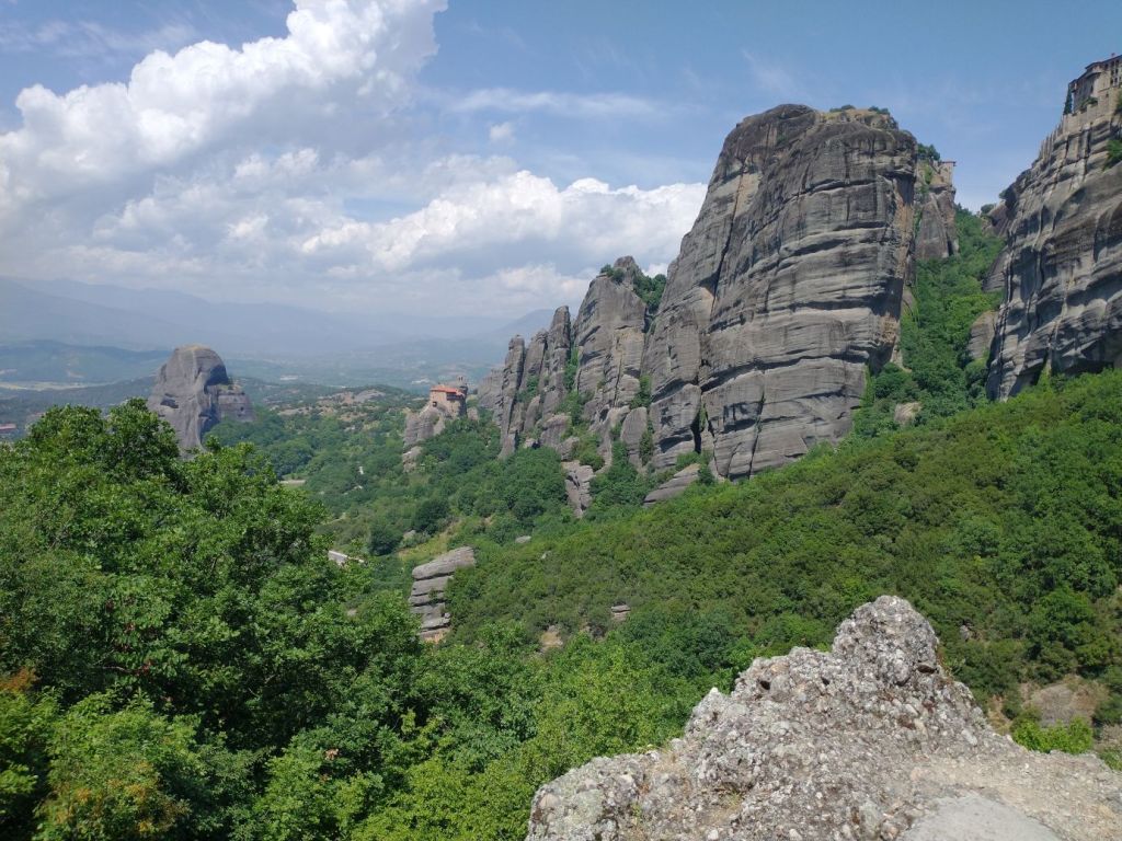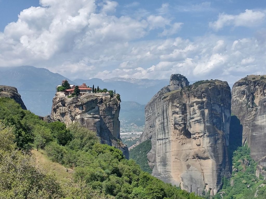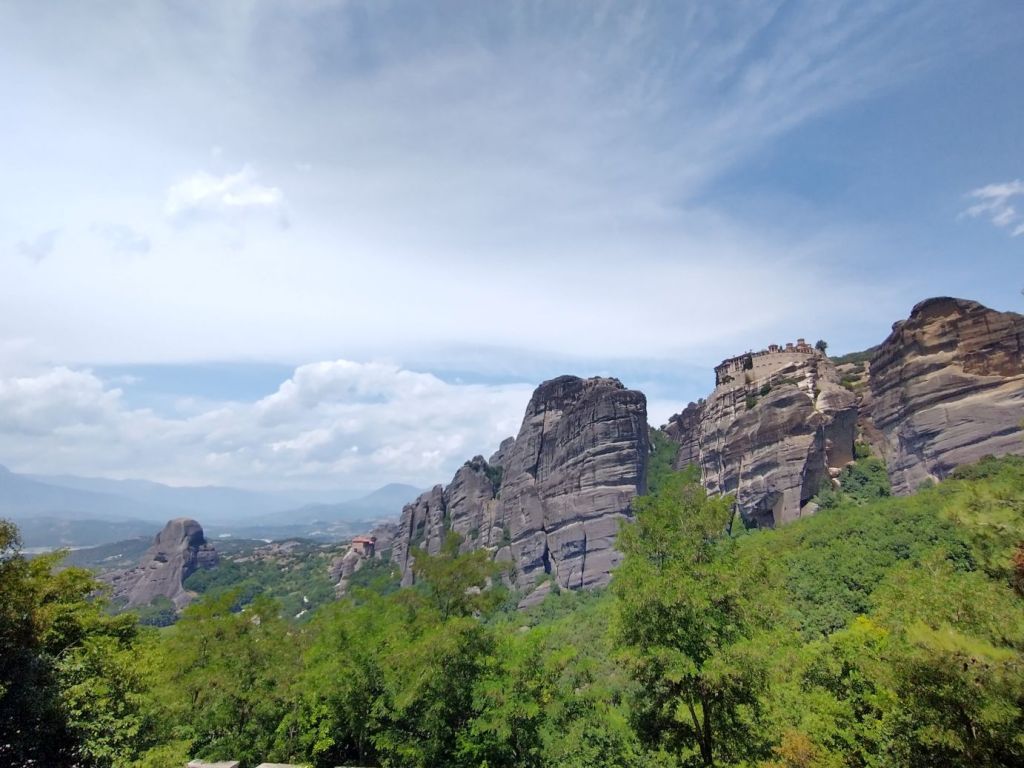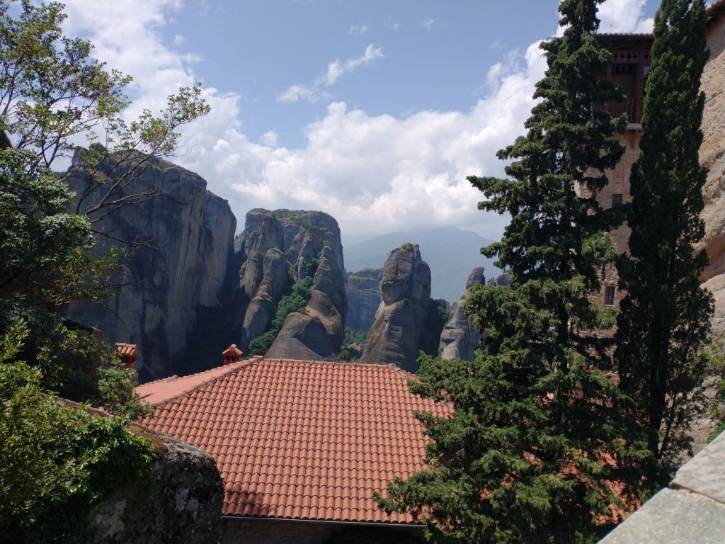 This place is hopping – and filling up fast – which means we want outta there. Finding Giorgos, we tell him we’ll meet him outside so that he doesn’t have to worry he lost us while he waits for the rest of the group. Here, in the now peace and quiet between tour groups, we stop for more incredible views not only of St. Stephan, but also of the surrounding craggy cliffs and mountains all around us.