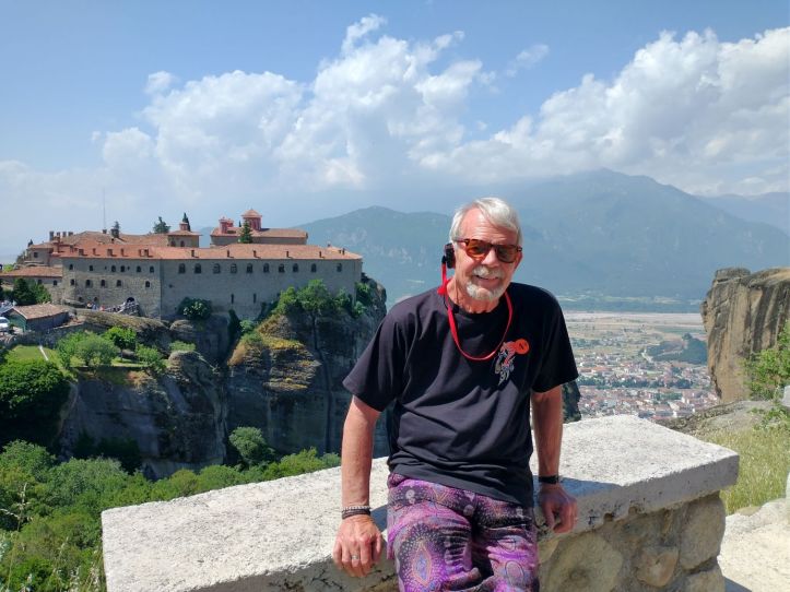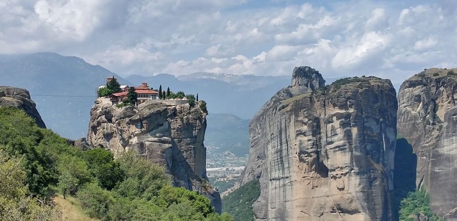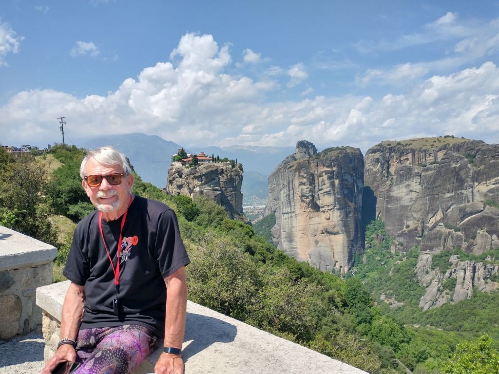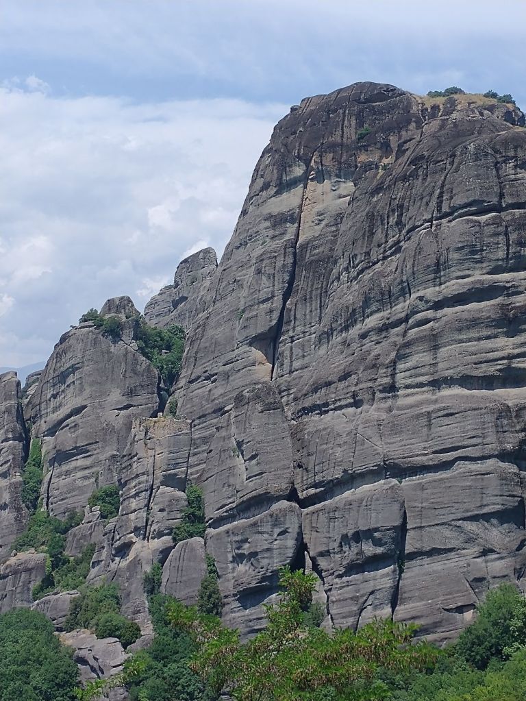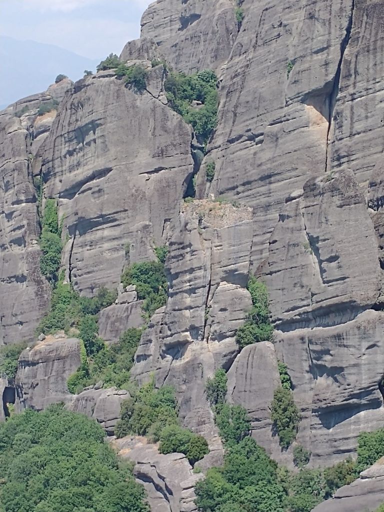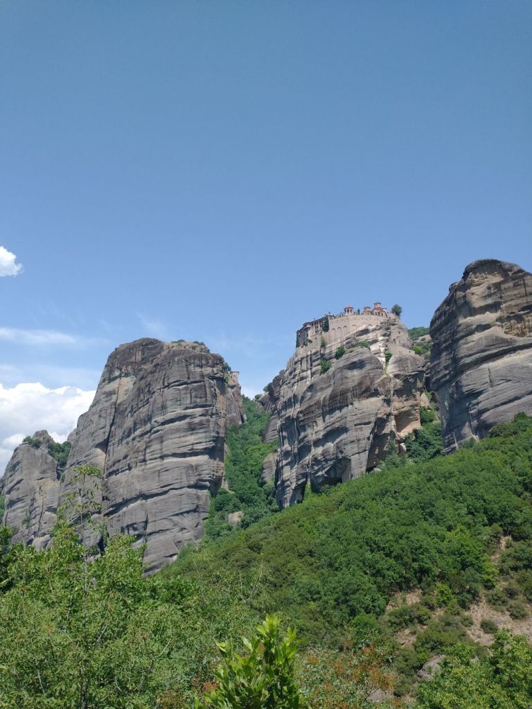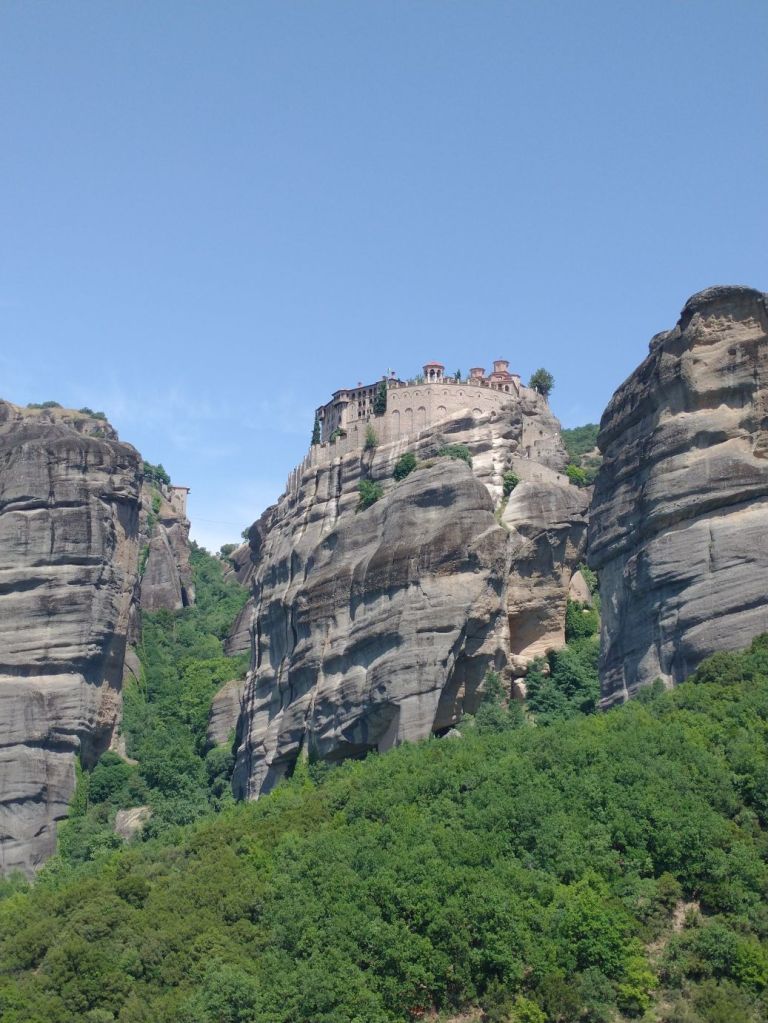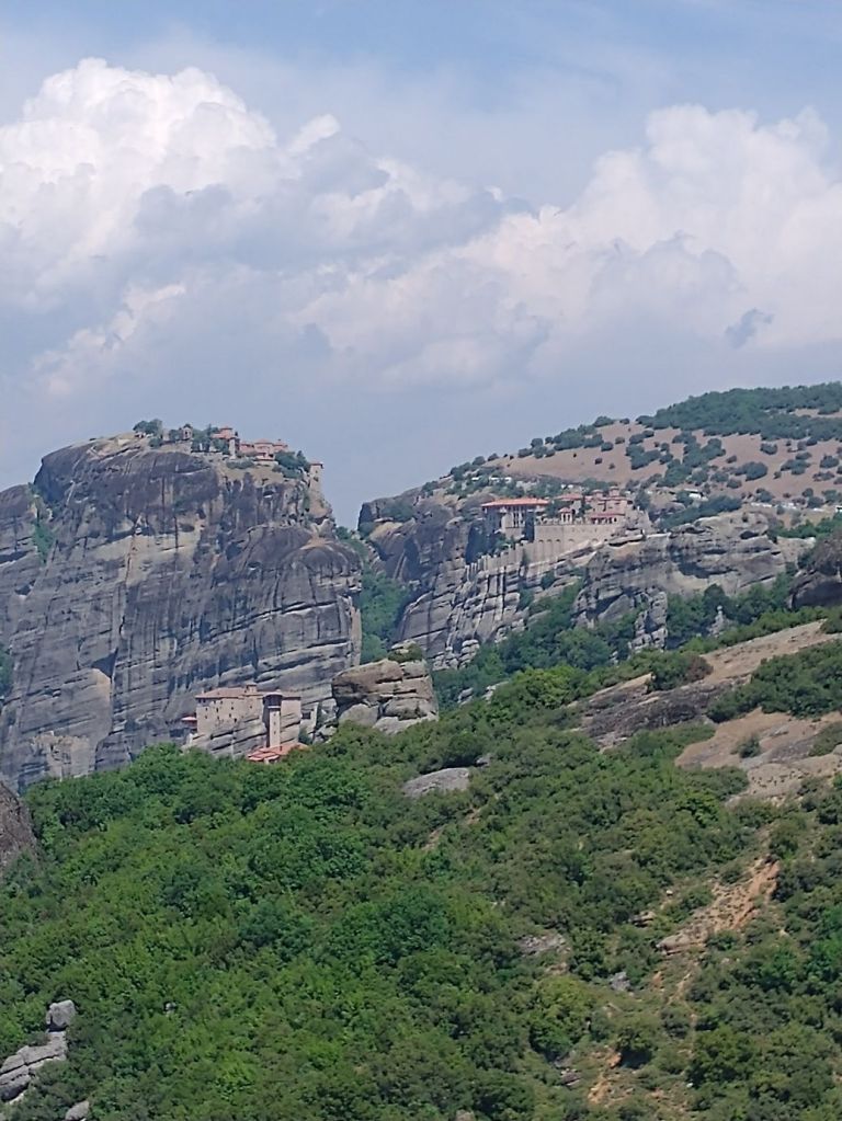 Shudder. We are on a ship’s tour today. We are going to Meteora, an area of Greece where giant rock stalagmite pinnacles rise up out of the valleys with ancient (and still active) monasteries perched atop the apexes. Settlement – if you want to call it that – started in the 11th Century when hermit monks came to these peaks, building small chapels, but no church. They lived alone in caves, then another monk came (just one!) and decided to build churches on the peaks. Overtime, more monks came and by the 14th Century there were 24 monasteries built above the plains on these pillars.