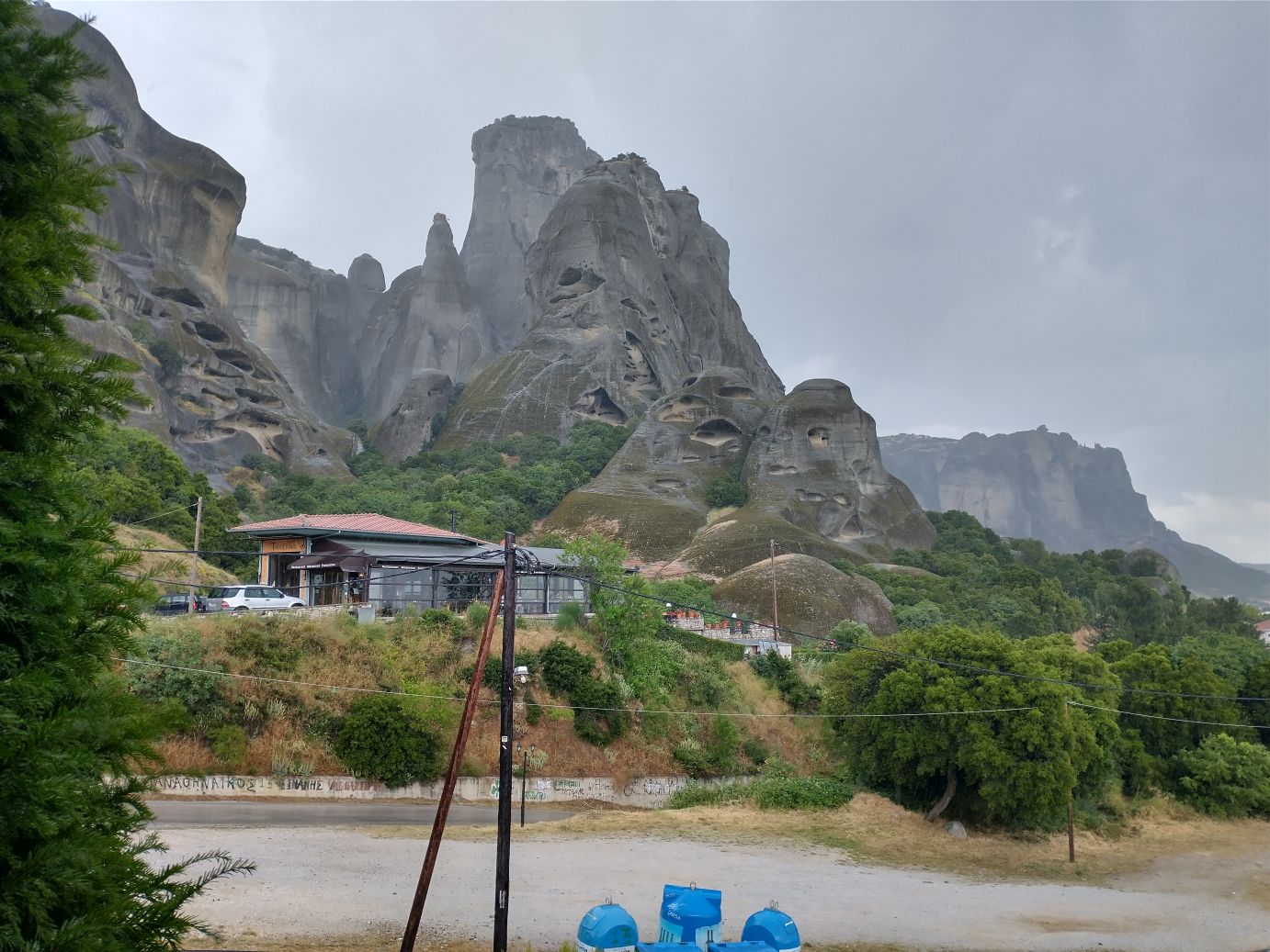 Done with sightseeing, our next stop is for lunch at the Restaurant Vakhos, which has windows facing the cliffs for a very scenic atmosphere – and a nice warm and dry one as it starts to rain and storm as we eat a lunch full of Greek specialities – meze with Moussaka, tzatziki sauce and Melitzanosalata (roasted eggplant dip); an assortment of salad for our second course and an excellent slow cooked pork with vegetables for the main. I was happy with the mezes! For dessert (of course there is dessert), they serve some sort of alcohol and syrup soaked cake that was actually quite good – but oh so very heavy.