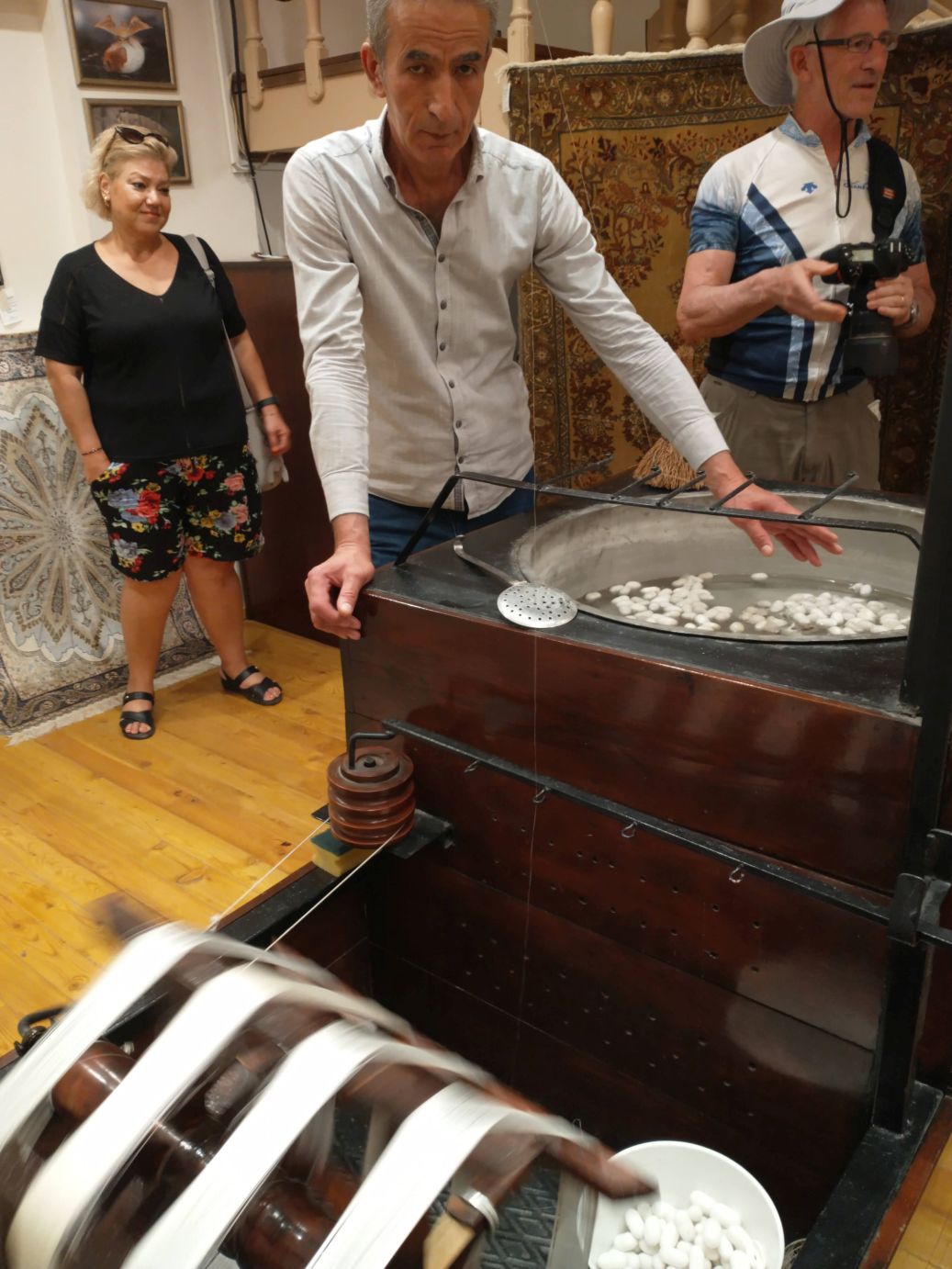 Then it is downhill, back to the van. We’re not sure who rates these tours, but their idea of strenuous and ours aren’t exactly the same! It was a lovely visit, but by no means strenuous or could be considered a hike. Even the folks we were concerned about made it fine (ok, 1 older guy tripped and fell, but that was easy for anyone to do and he just had a couple of scrapes which a Band-Aid handled easily). Back in Kusadasi, we endured through the obligatory rug presentation – where the silk spinning explanation was actually sort of fascinating – watching how the silk cocoons were in water and the threads spun out from them. Hmmm. That was cool.