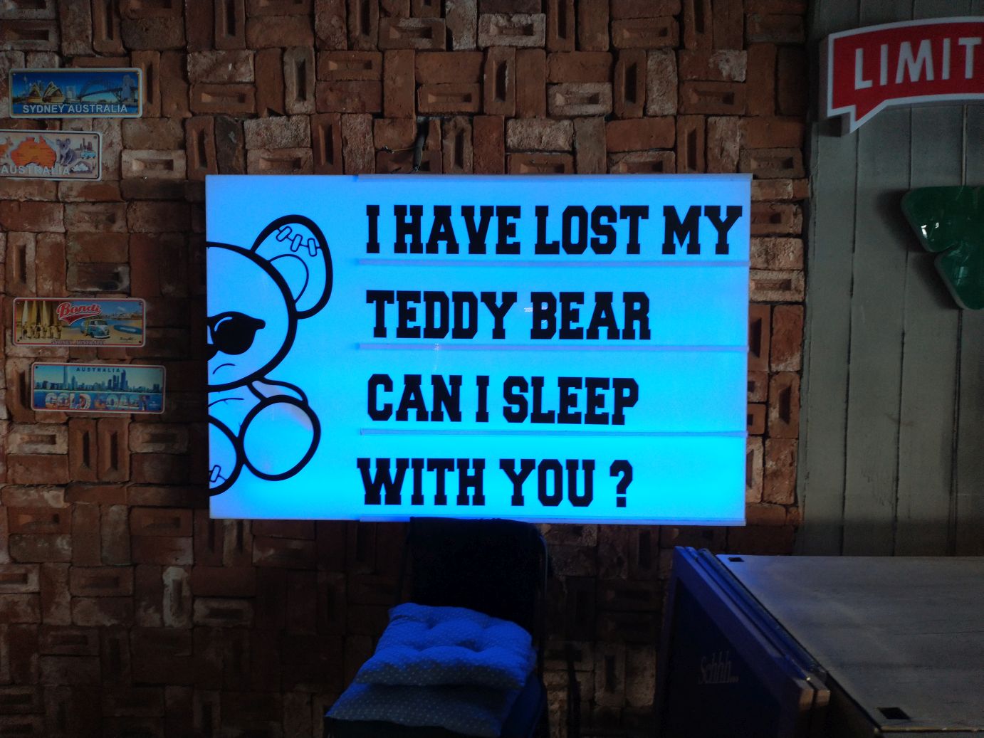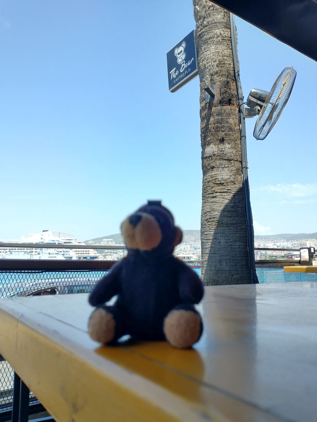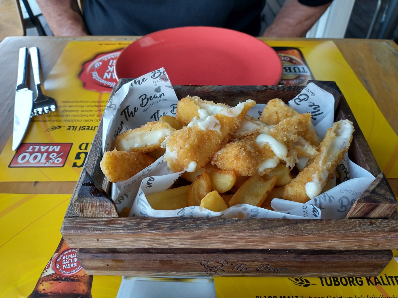 Hitting the town on our own, we found an ATM, stocked up on Turkish Lira we’ll need for here and Istanbul and Cesme, then found a restaurant on the road overlooking the harbor called The Bear. Oh, how could we resist? Even though we had just eaten, they had this great sounding fried cheese we had to order – to go along with our wine (good wine this time) and beer. How could we not? Sunny of course loved the place – and we loved the atmosphere – and the signage inside!